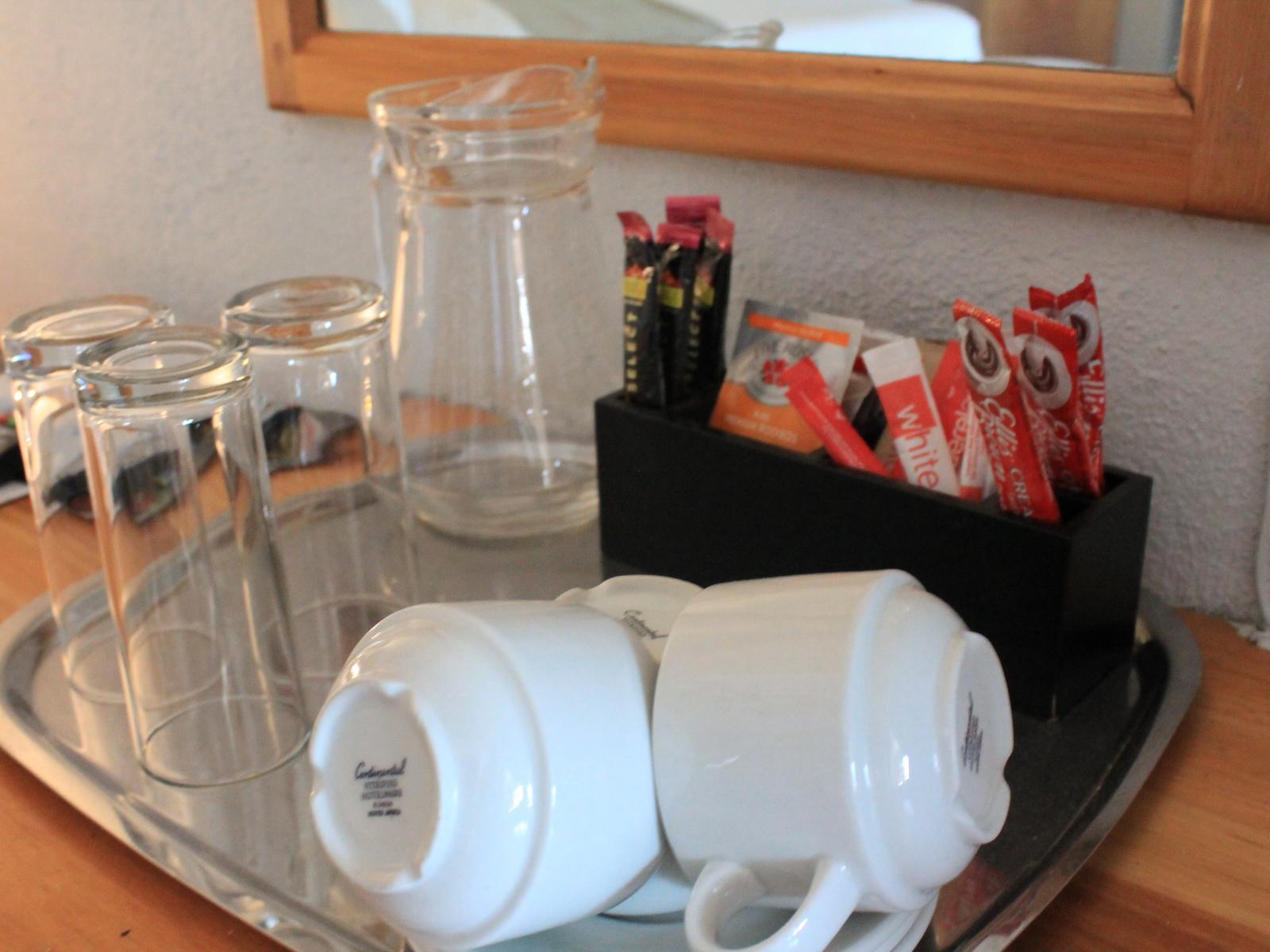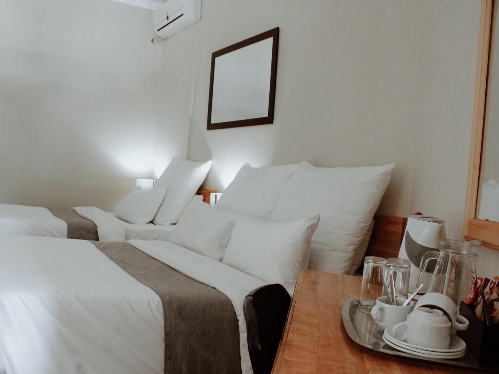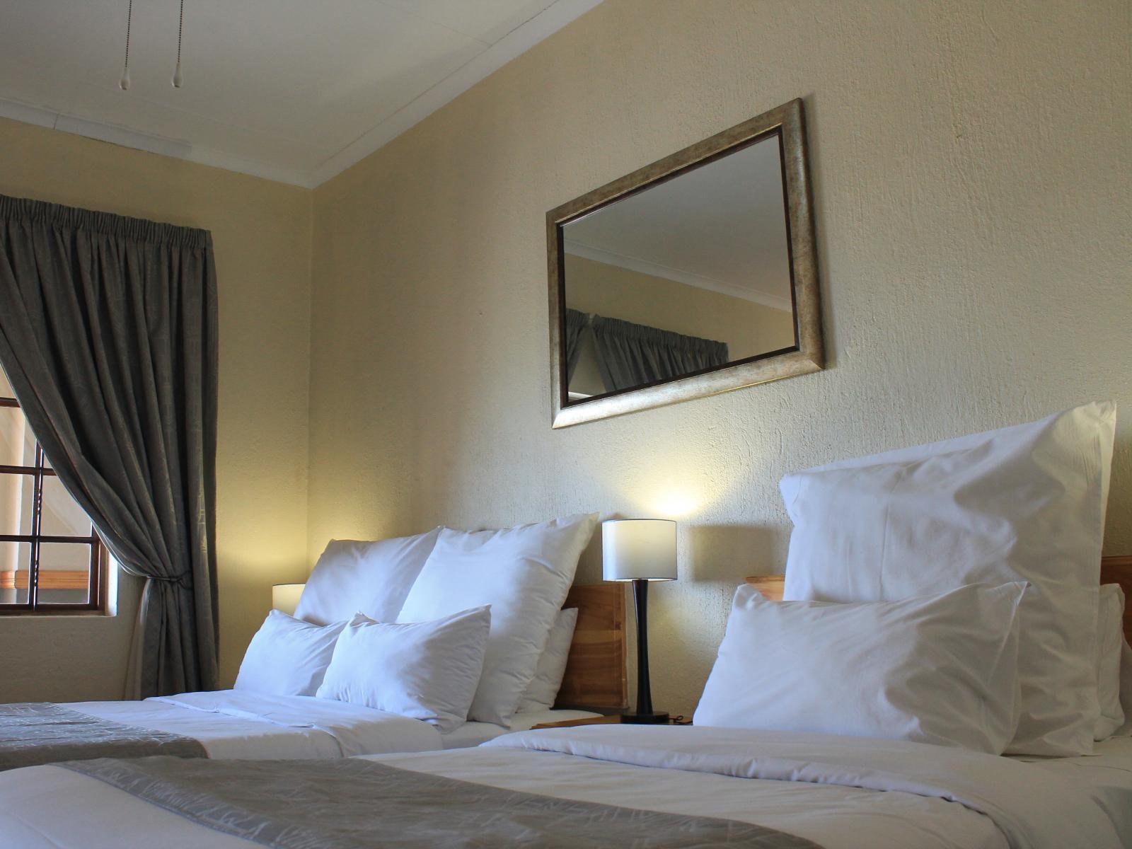 This open plan room can accommodate 3 people with a double bed and 1 x ¾ bed, en-suite bathroom (shower OR Bath), 24 channel DSTV, coffee/tea station and air-con and a work station.
