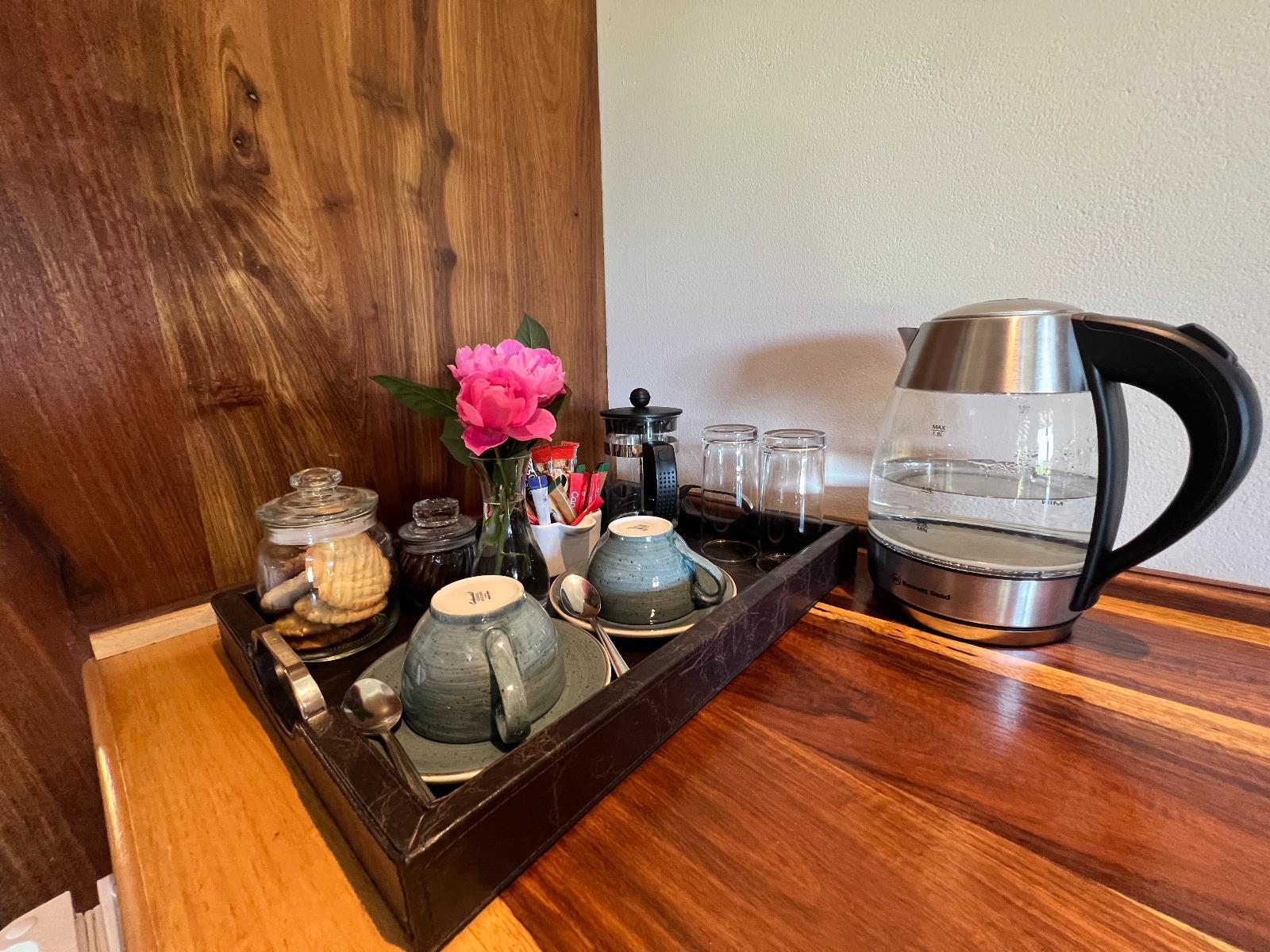 Luxury Double Room. Situated on the ground floor. It has a queen size extra-length bed. It overlooks the Manor gardens, rolling lawns, dams & mountain range beyond.