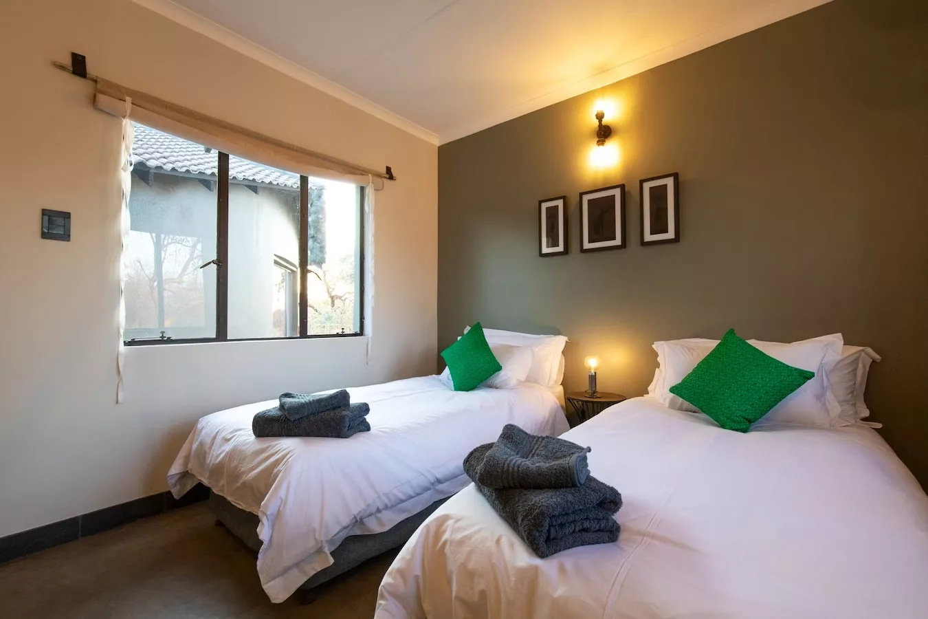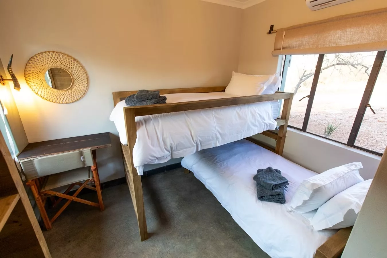 Our camp boasts five en-suite bedrooms, each thoughtfully designed to provide comfort and privacy. The accommodations include eight beds, ensuring ample space for all guests. Each room is equipped with air conditioners to keep you cool during warm days, and an additional outside shower enhances the natural bush ambiance. The family room features a queen bed and an adjoining room with bunk beds, perfect for families with children, sharing a well-appointed bathroom. The remaining three rooms are twin-bedded, ideal for friends or couples.