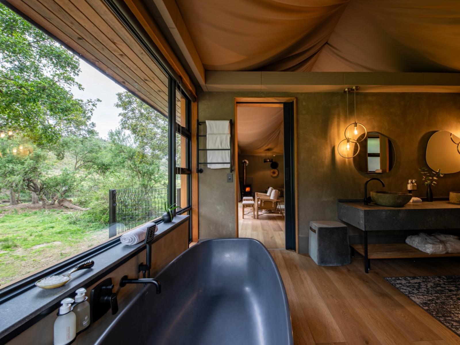 Spacious Executive Suites with river views, extra-length king bed, mini-bar, air-conditioning, Wi-Fi, and a cosy lounge with fireplace. The en-suite features an oval bath, double outdoor showers, a Jacuzzi, and an open-air bed beneath the African sky.