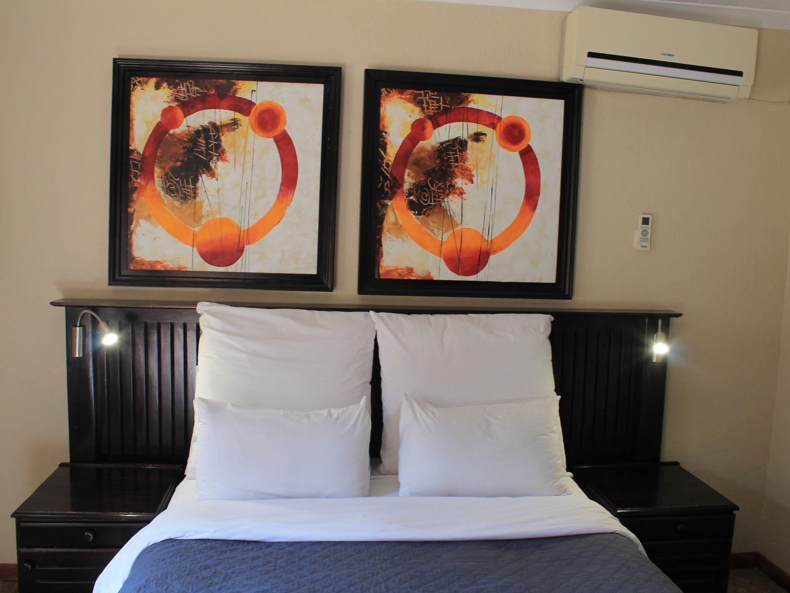 This open plan room can accommodate 4 people with either 2 x double beds OR 1 double bed with 2 x ¾ bed. It includes en-suite bathroom (shower and bath), 24 channel DSTV, coffee/tea station and air-con and a work station.