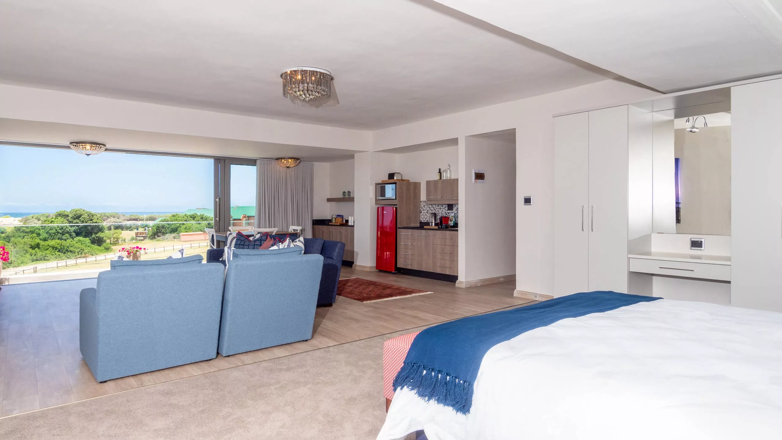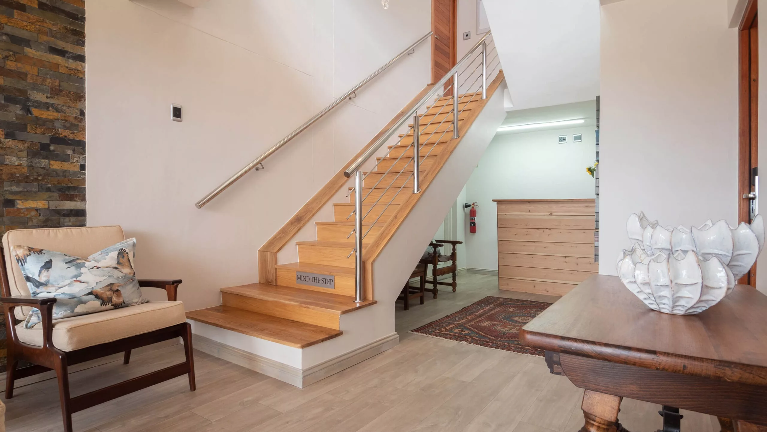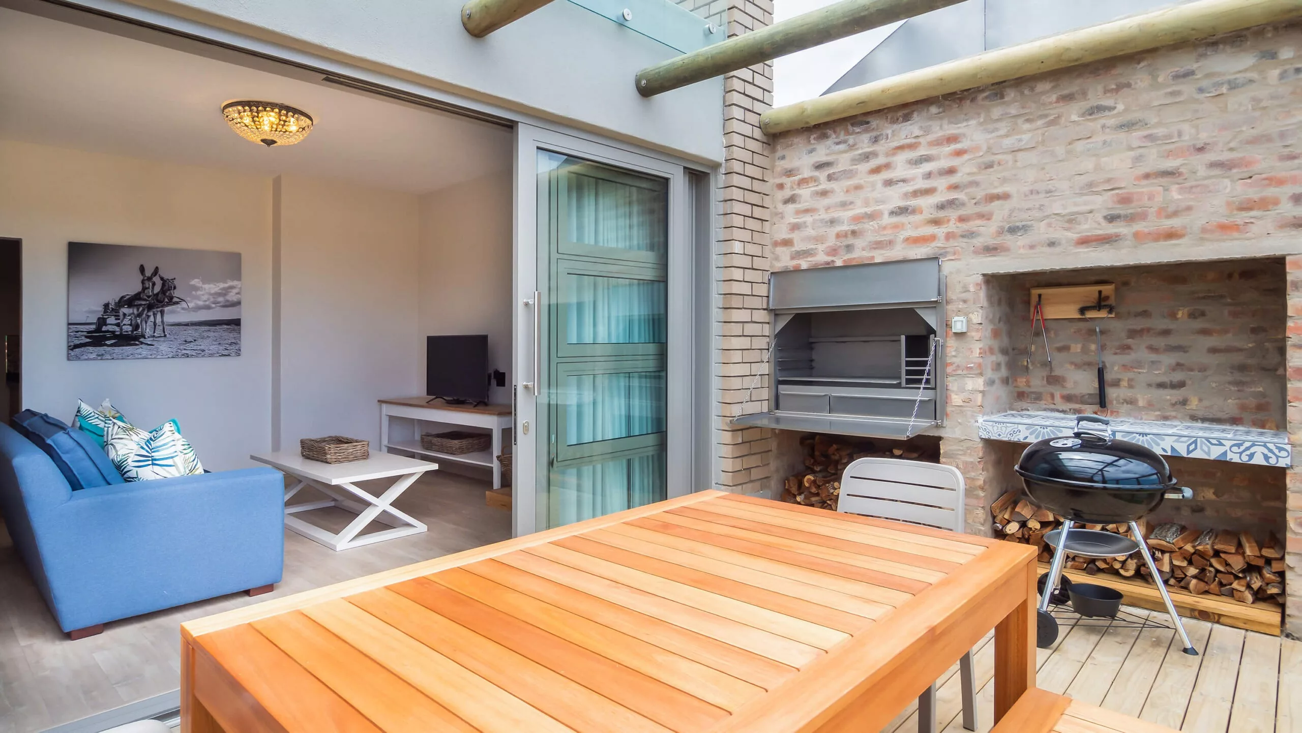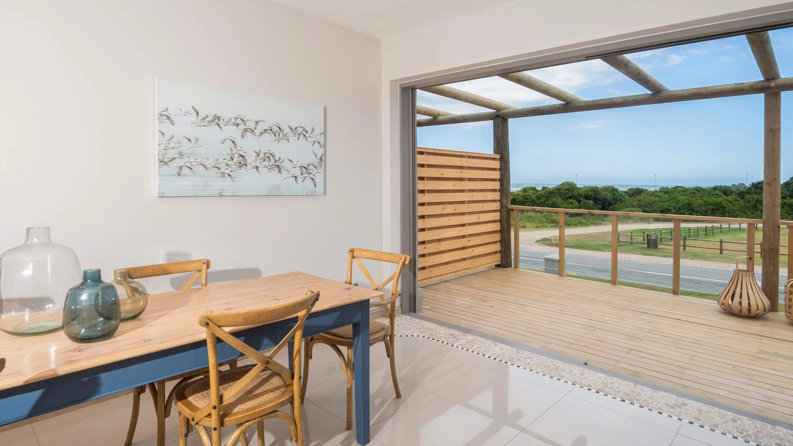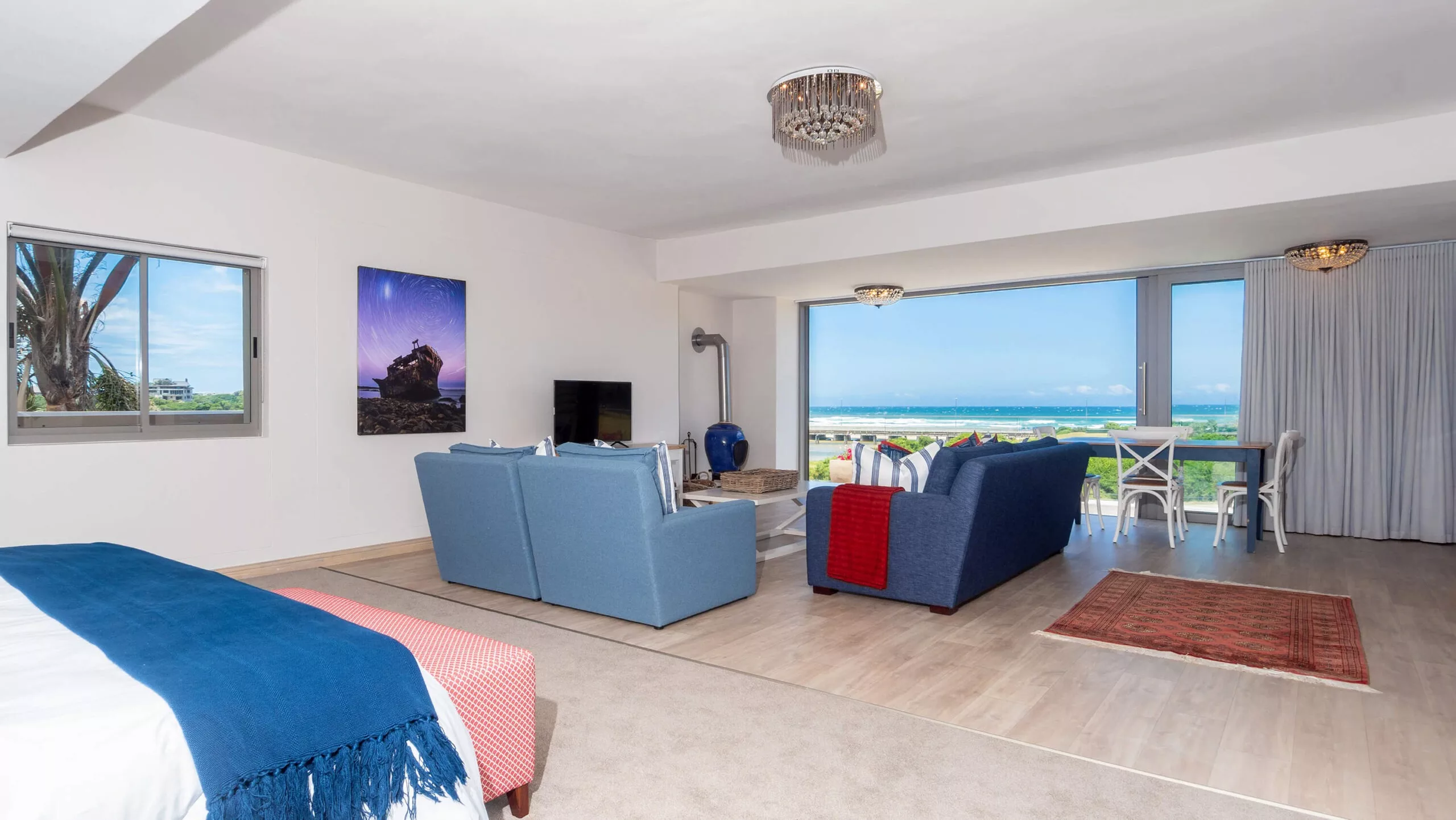 Our suites are elegant yet comfortable, reflecting the tranquillity of the Indian Ocean and Touws River estuary, all just a short walk from the property. The charming village centre of Wilderness is also easily accessible on foot, offering a variety of restaurants, pubs, and unique shops to explore. You won’t need your vehicle, as secure off-street parking is provided. Upon reaching the second floor, you will be greeted by breathtaking sea views. On this large 100 sqm furnished deck, guests can enjoy time together, sipping sundowners or simply relaxing in the sunshine. Braai facilities are available in this communal area, ensuring a warm and welcoming space for all.