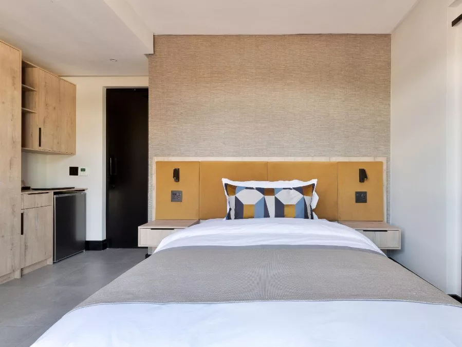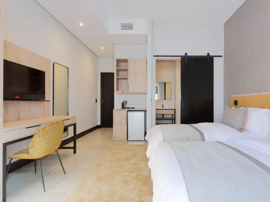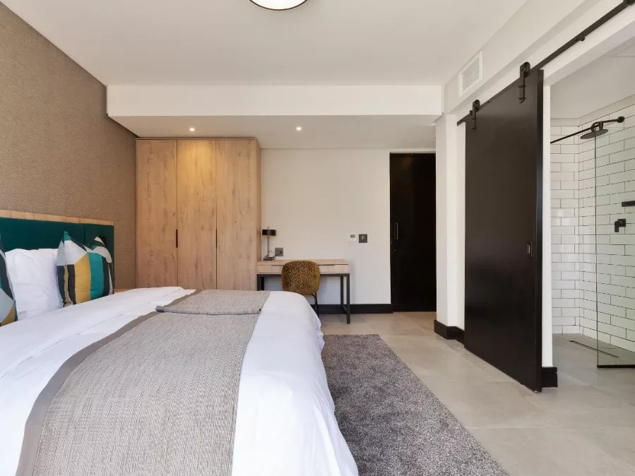 Each room has a double bed, an en-suite bathroom with a shower, and a kitchenette fitted with a microwave, bar fridge, tea and coffee station, and kitchenware. Each room has a work space, a Smart TV with DStv, and Wi-Fi.