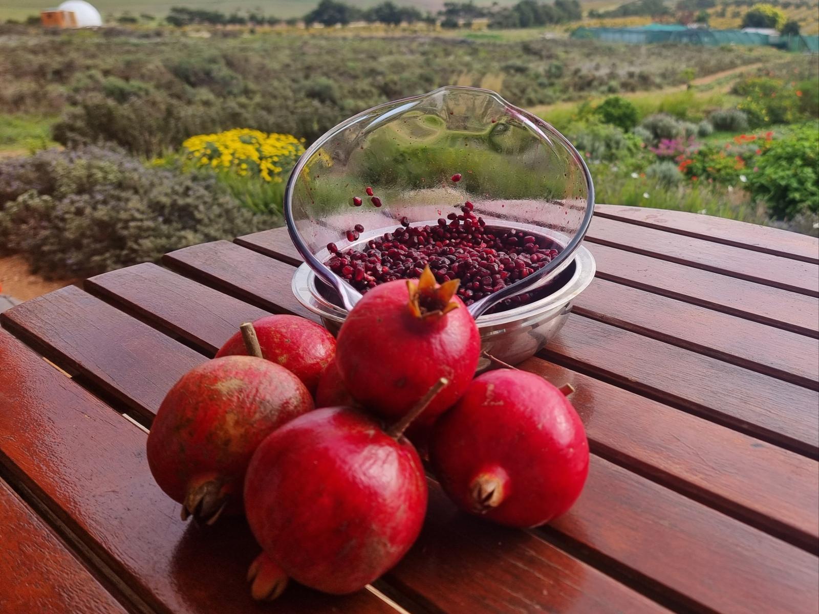 There are tranquil walks in our labyrinth, through our pomegranate orchards, and renosterbos rambles. You can relax in the hammock sunk into your deck or gaze at the sunset and evening starts at our star deck. You can chat to Mike and Sandy, the hosts, about the off-the-grid eco-friendly lifestyle – right down to our 350m² greenhouse, heavy with veggies, herbs and more.