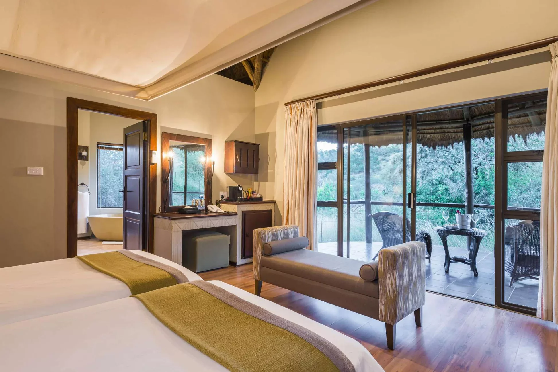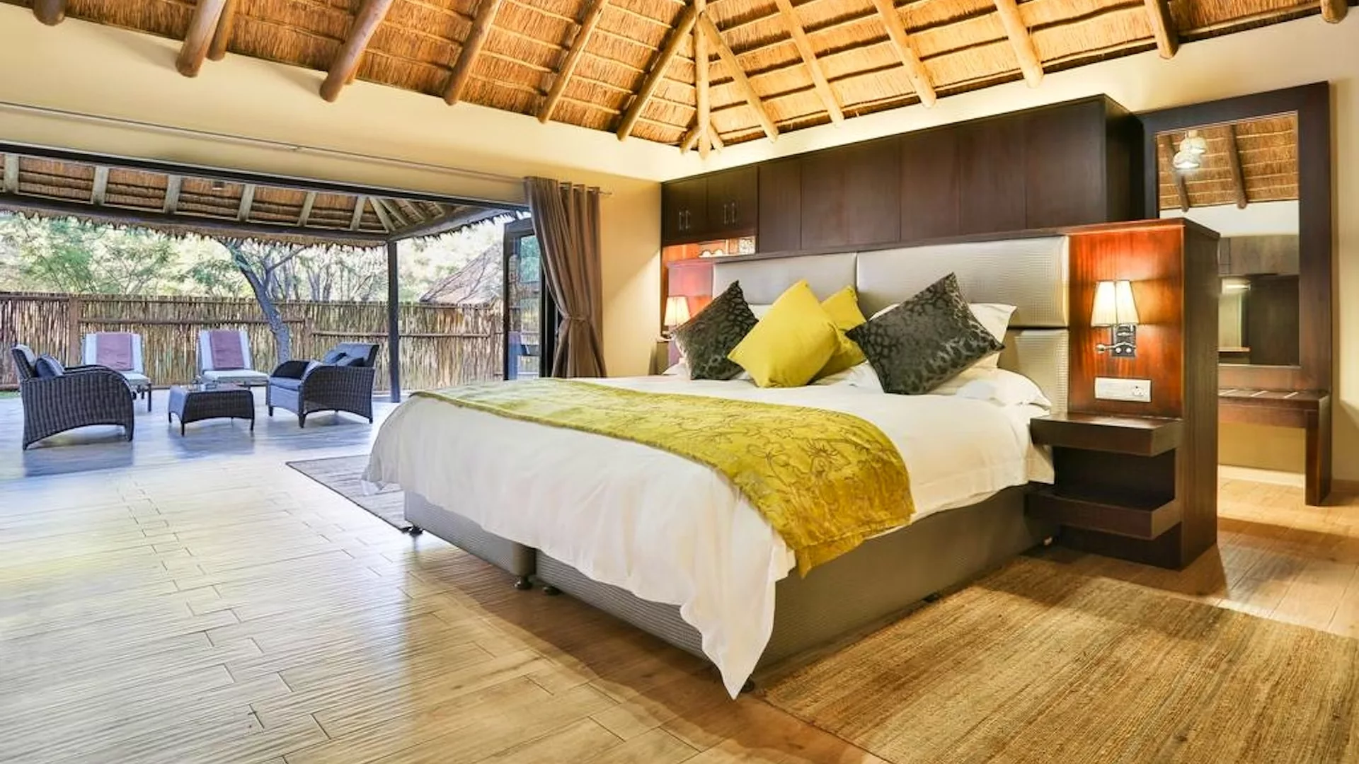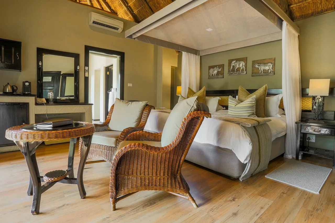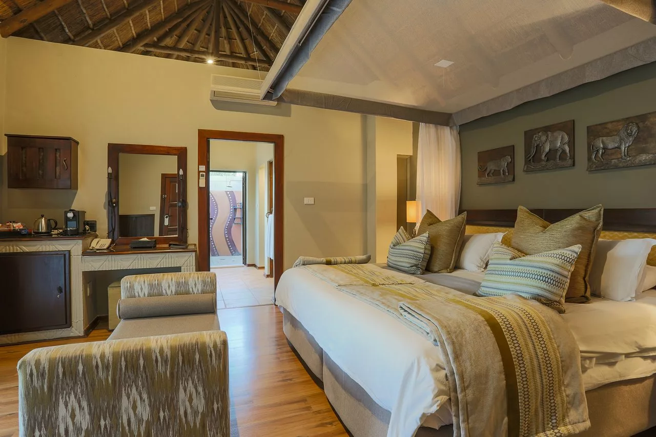 Indulge in a premium 5-star safari experience at Ivory Tree Game Lodge, boasting a range of room options to suit your preferences. Choose from Executive, Luxury, and Family Suites, as well as Standard Rooms, Pilane Villa, and Kosher Villa. Each of the 67 rooms is tastefully decorated in earthy tones, and offers comfortable outside seating areas to revel in the surrounding wilderness.