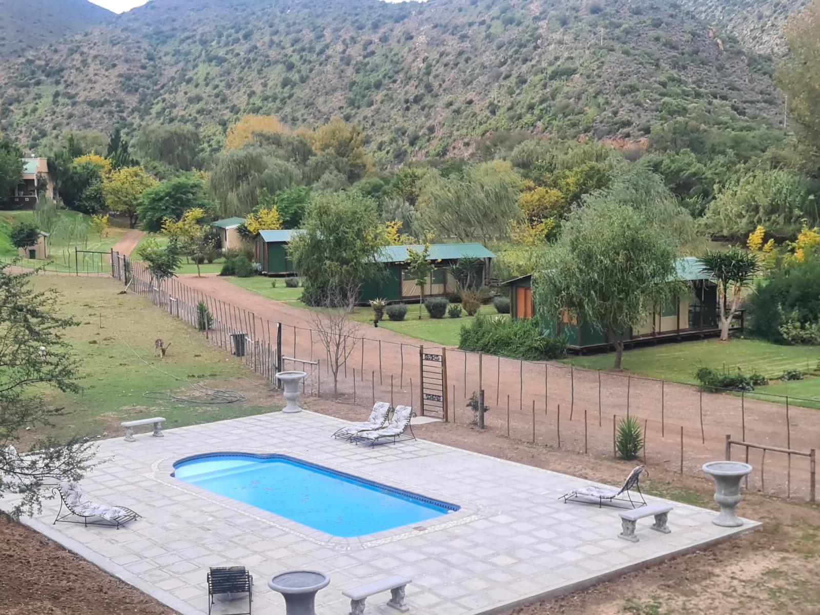 We are also a working ostrich farm in season and the children can go fishing, hiking and swimming. We also have a playground for the children with swings, a trampoline and a jungle gym. We are near the Swartberg Mountains, Cango Caves, Rust en Vrede Waterfall, Cango Wildlife Ranch and the Cango Ostrich Farm