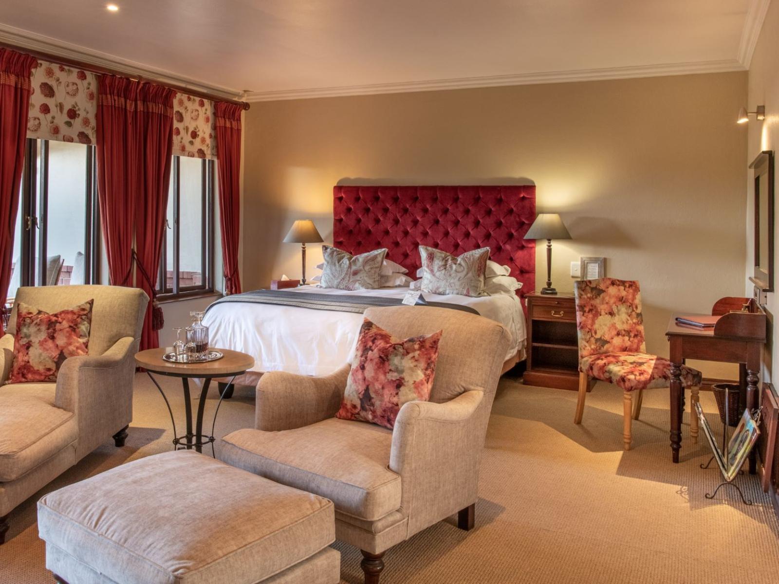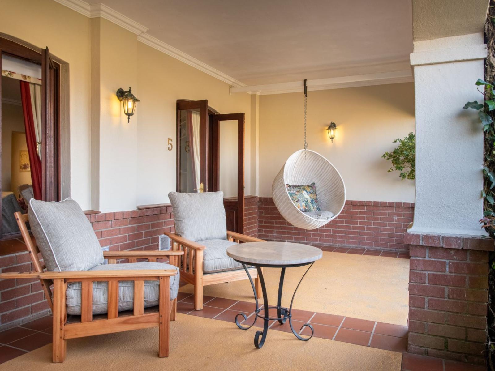 Bedroom with spacious veranda on the ground floor with access to the garden and pool. King size bed (or twin on request). En-suite with bath & Shower. DSTV, telephone, minibar with snacks, air-conditioner, heater, coffee & tea, bathrobes.