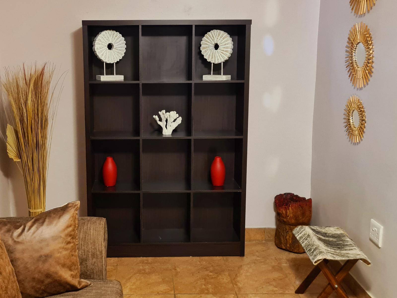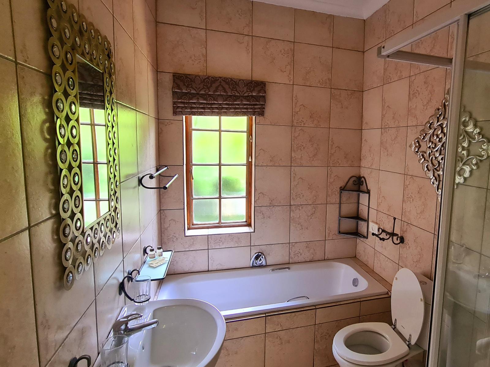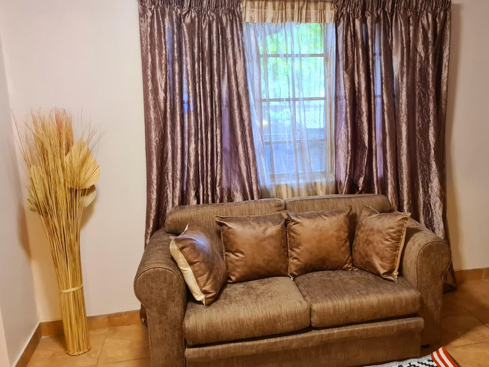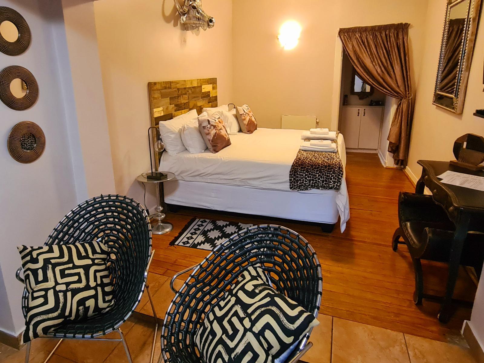 A Luxury Room with King bed and Sleeper couch for 2 children. En-suite bathroom with shower and bath. Room has Safe, Fridge, Smart TV, Coffee/tea facilities and free Wi-Fi. Room has a seating area and is decorated in a chique African style.