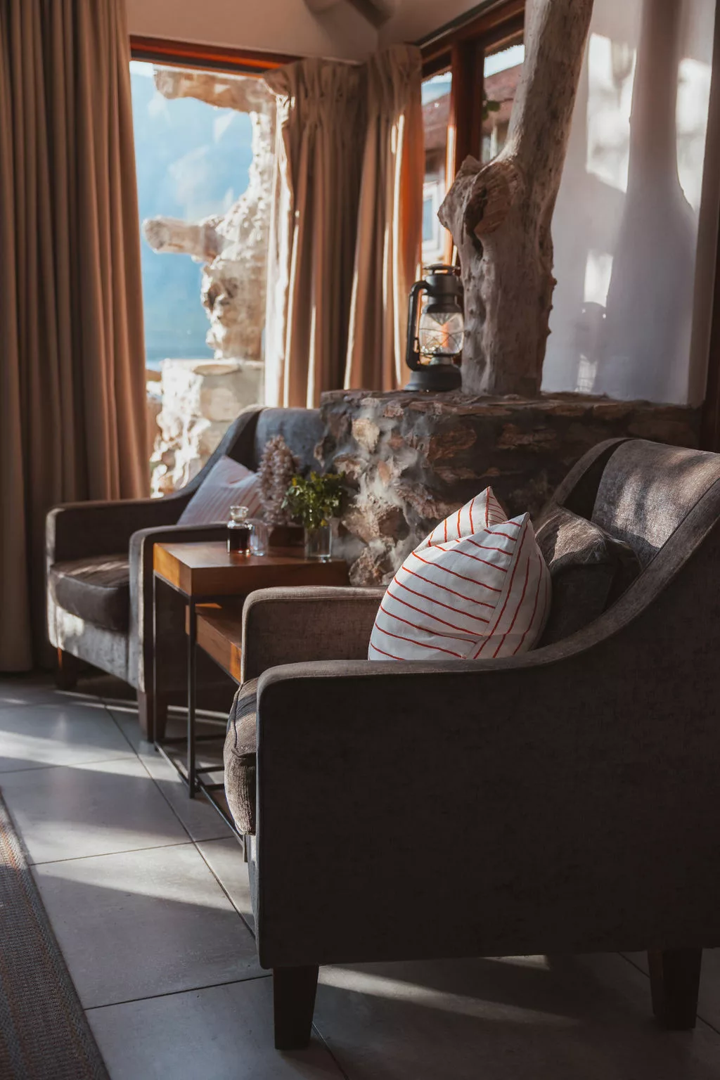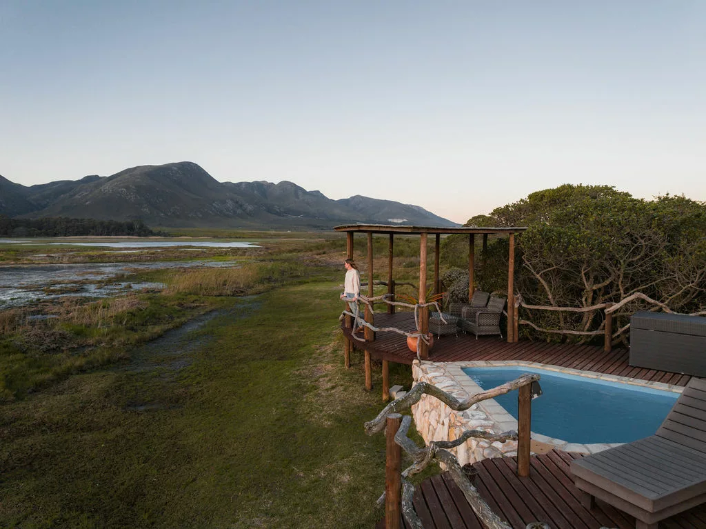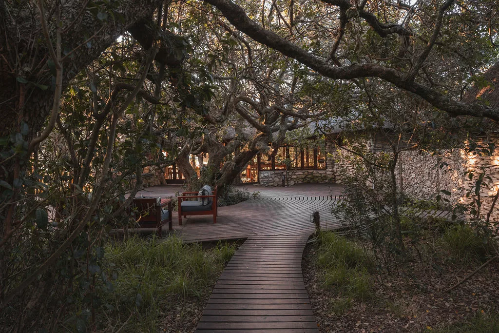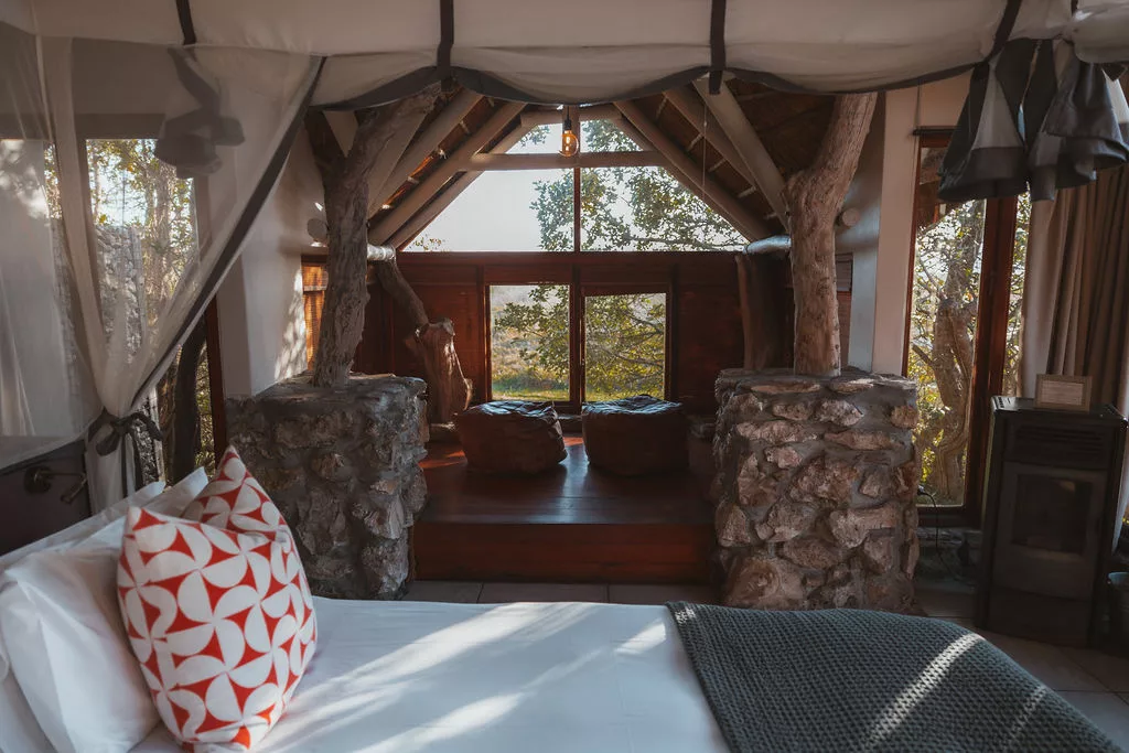 Secluded within an ancient Milkwood grove, each suite has glass walls and doors that open onto gorgeous mountain views, and a private deck overlooking the lagoon. Each room has beautiful soft netting surrounding a king-size bed, a writing desk, fireplace and a ceiling fan. The bathrooms are fitted with a large romantic tub, copper sinks and a private outdoor shower for an African bush experience. Twin beds can be accommodated.