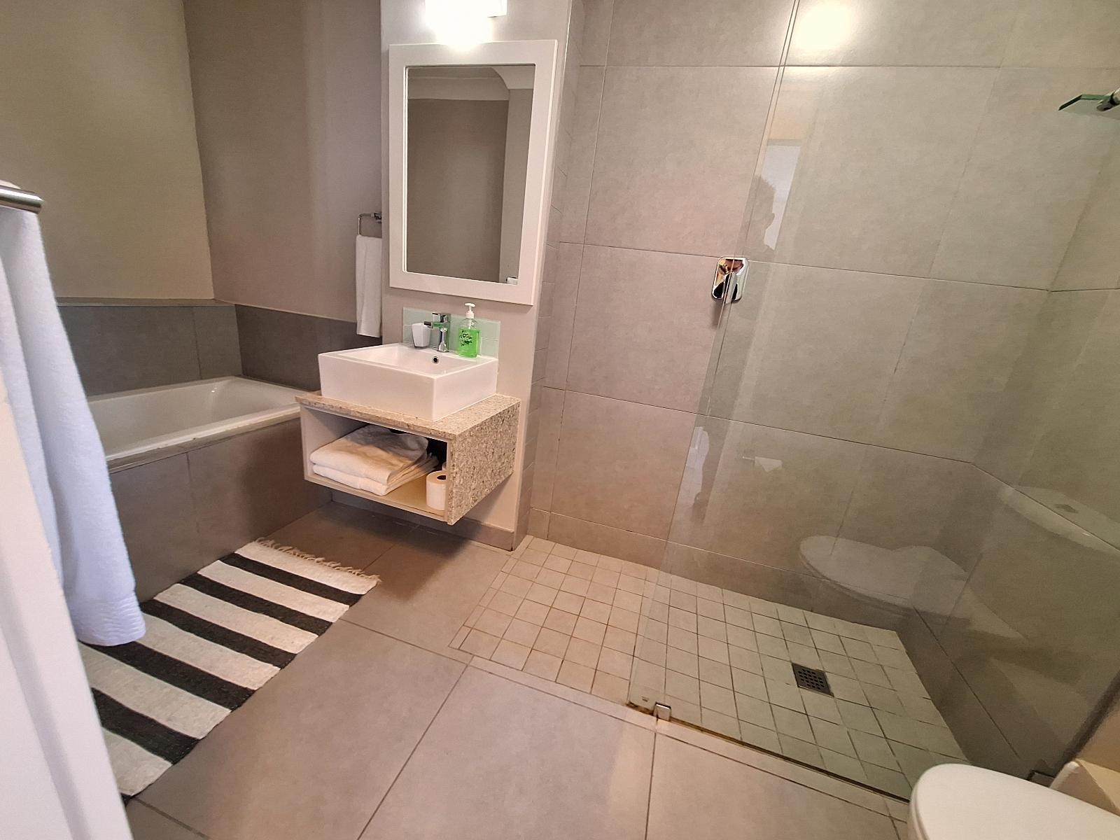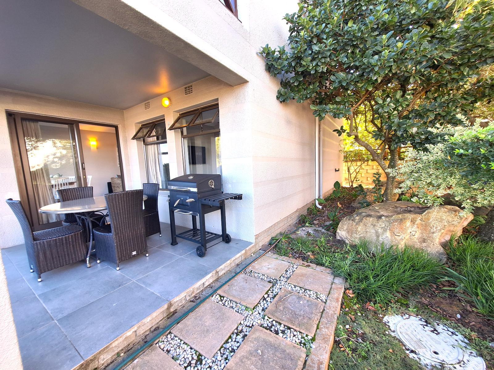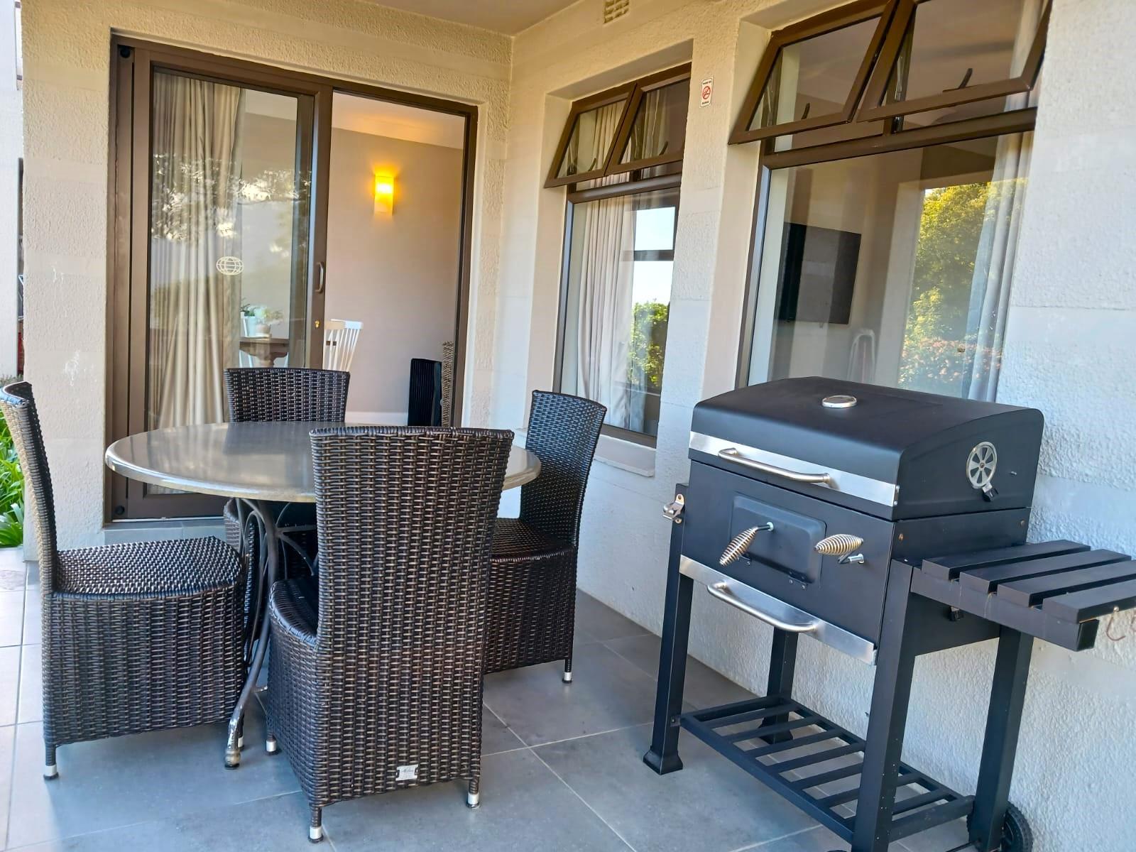 Our ground-level apartment, also within the secure Castleton estate, is ideal for up to 4 guests. It boasts a comfortable queen-size bed in the bedroom and a bathroom with a separate shower and bath. The well-equipped kitchen features modern appliances, and the open-plan living area includes a queen sleeper couch for extra guests or children. Entertainment options include DSTV, Netflix and free Wi-Fi. A patio with a charcoal barbecue and garden view creates the perfect spot for relaxation and socializing.