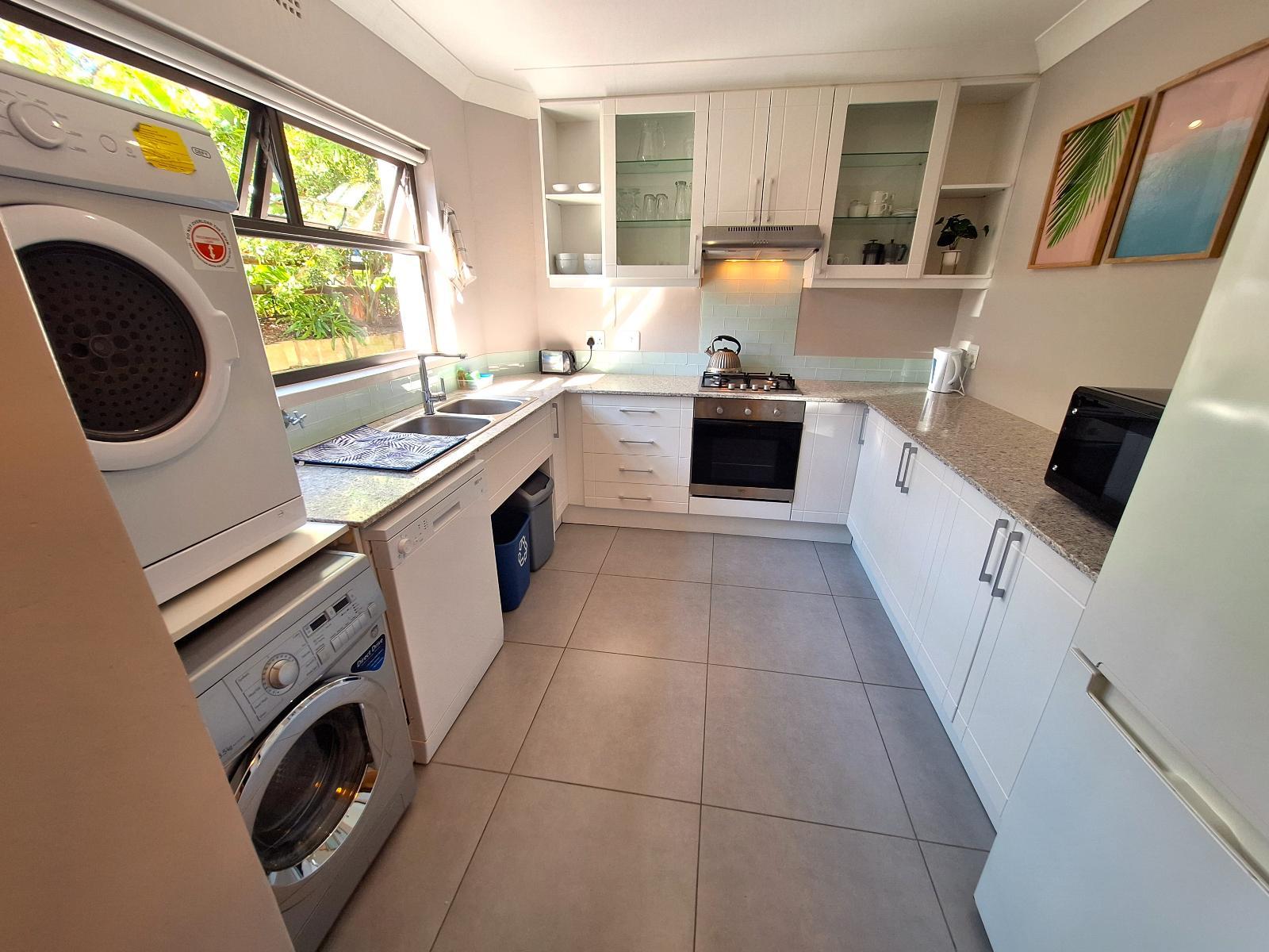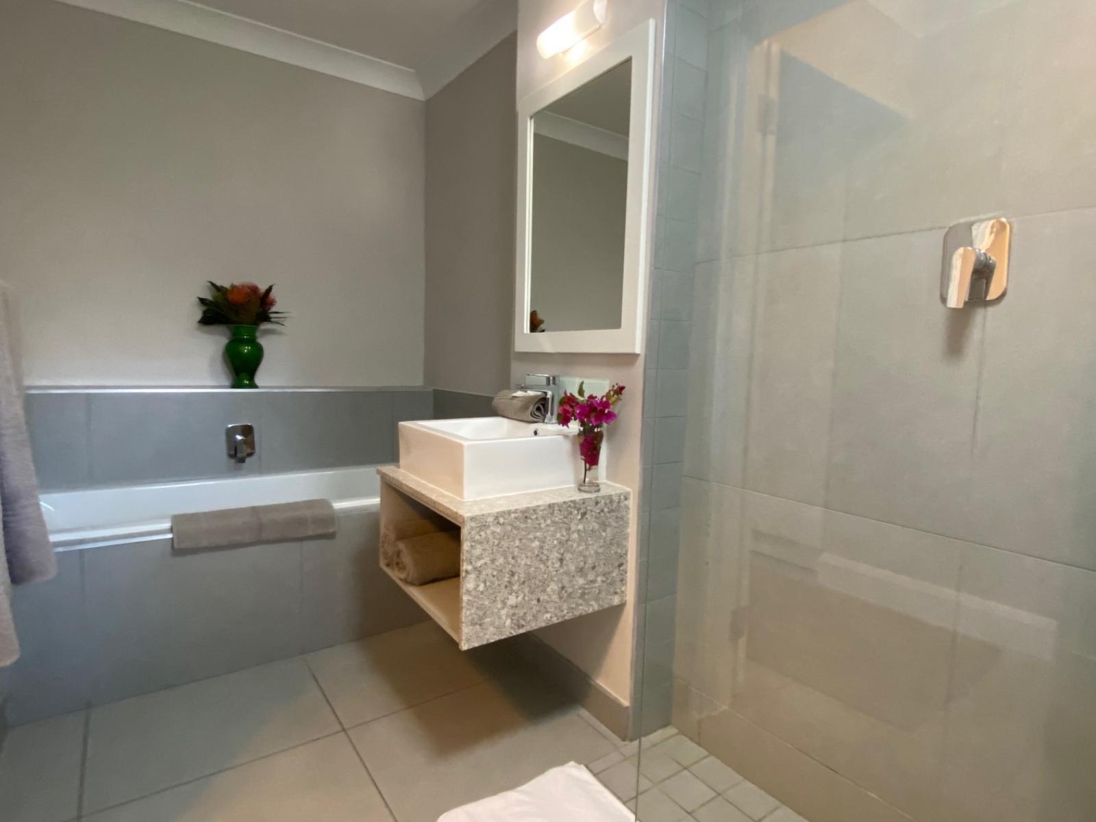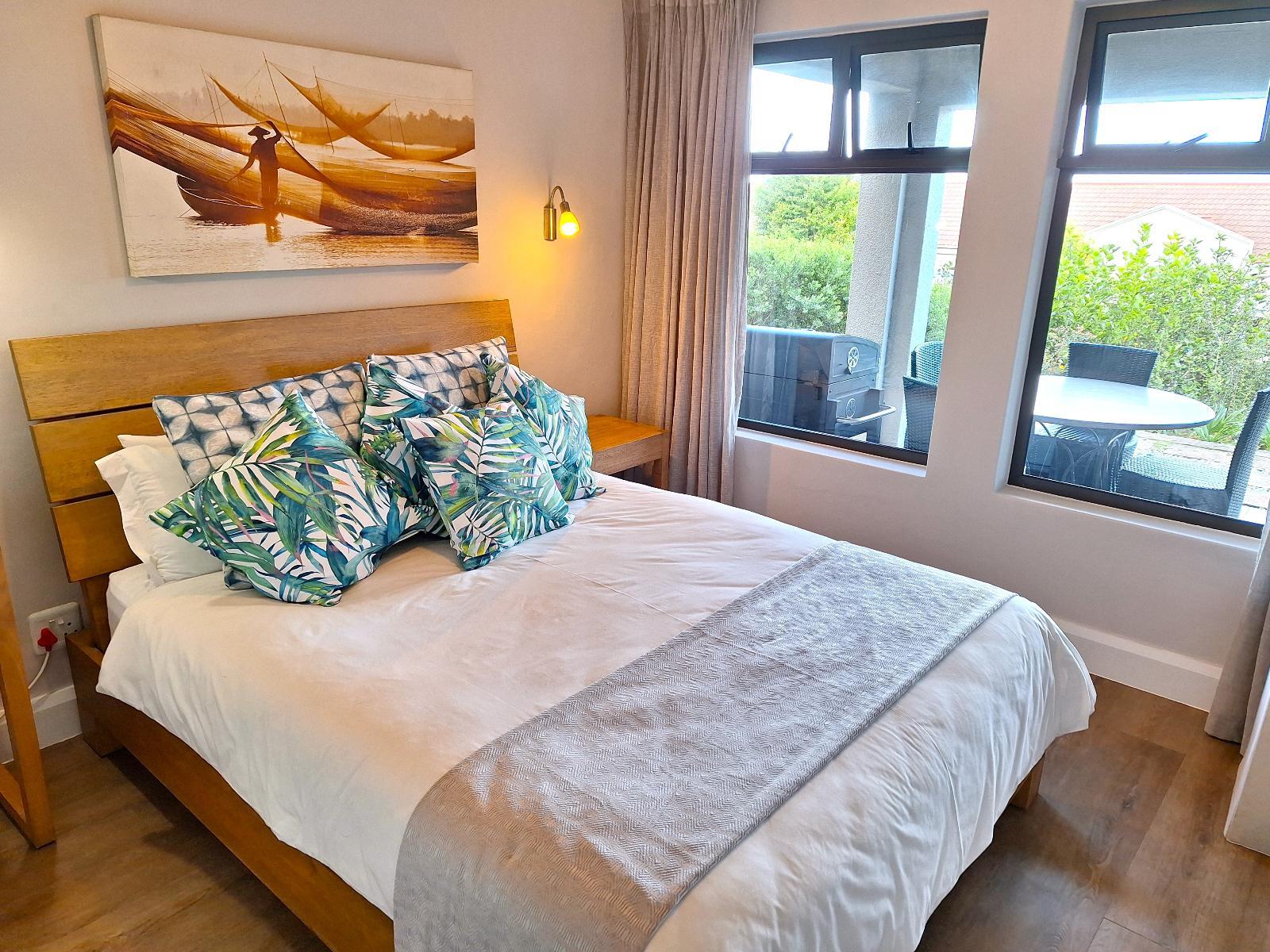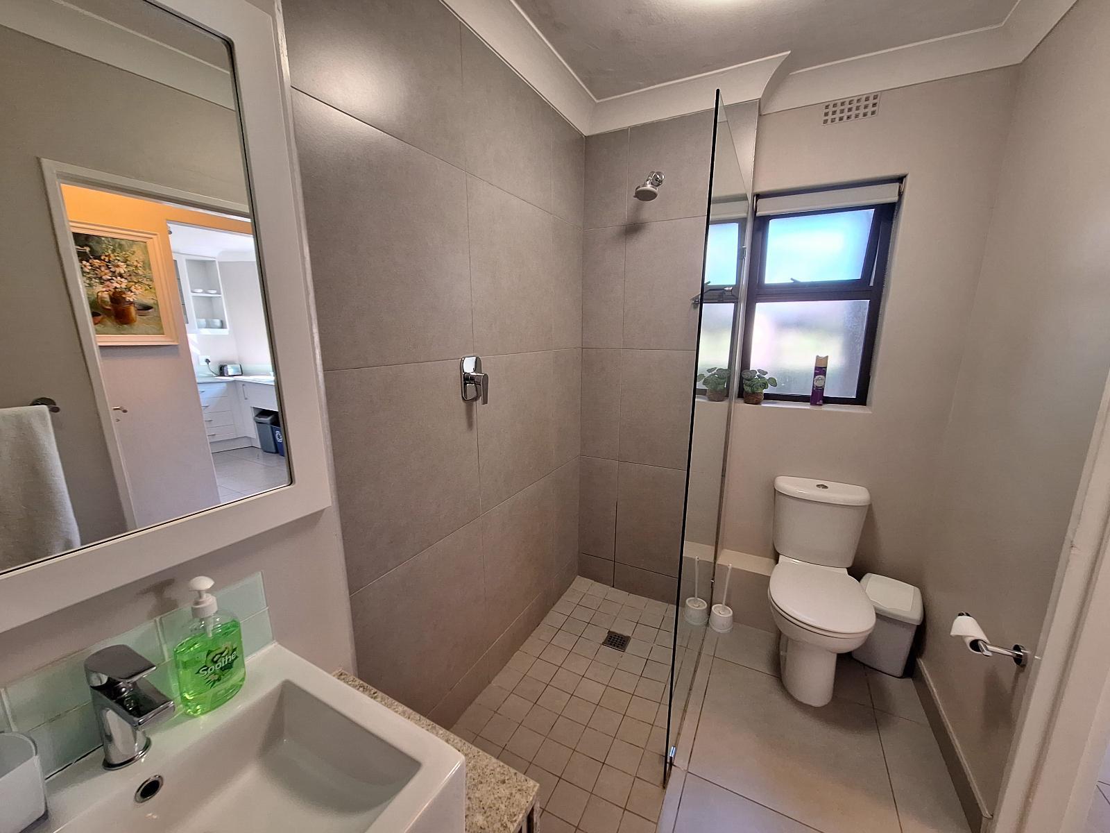 Our ground-level apartment, also within the secure Castleton estate, is ideal for up to 4 guests. It boasts a comfortable queen-size bed in the bedroom and a bathroom with a separate shower and bath. The well-equipped kitchen features modern appliances, and the open-plan living area includes a queen sleeper couch for extra guests or children. Entertainment options include DSTV, Netflix and free Wi-Fi. A patio with a charcoal barbecue and garden view creates the perfect spot for relaxation and socializing.