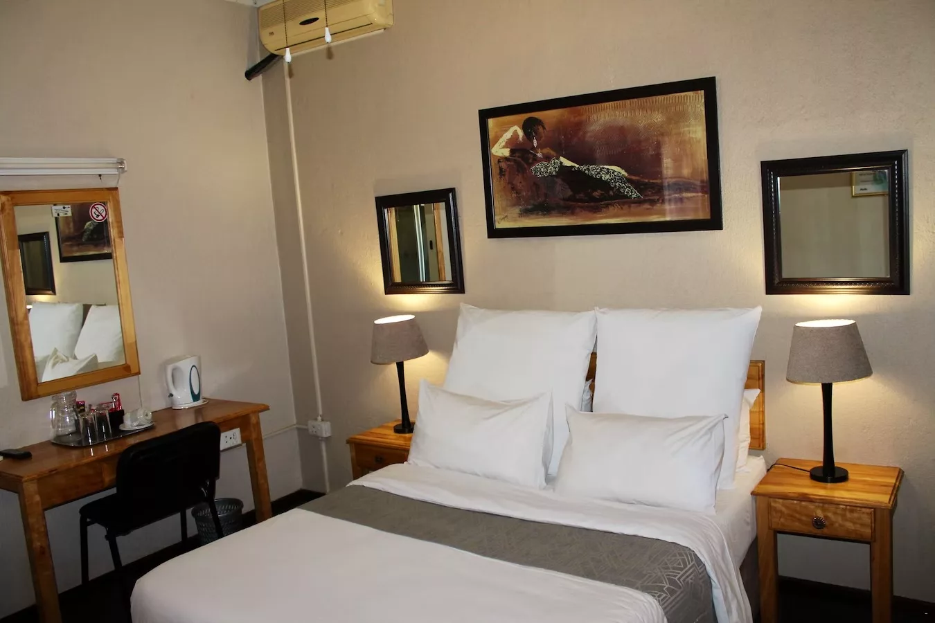 This room can accommodate 2 people with 2/3 beds, en-suite bathroom (shower), 24 channel DSTV, coffee/tea station, air-con and a work station.