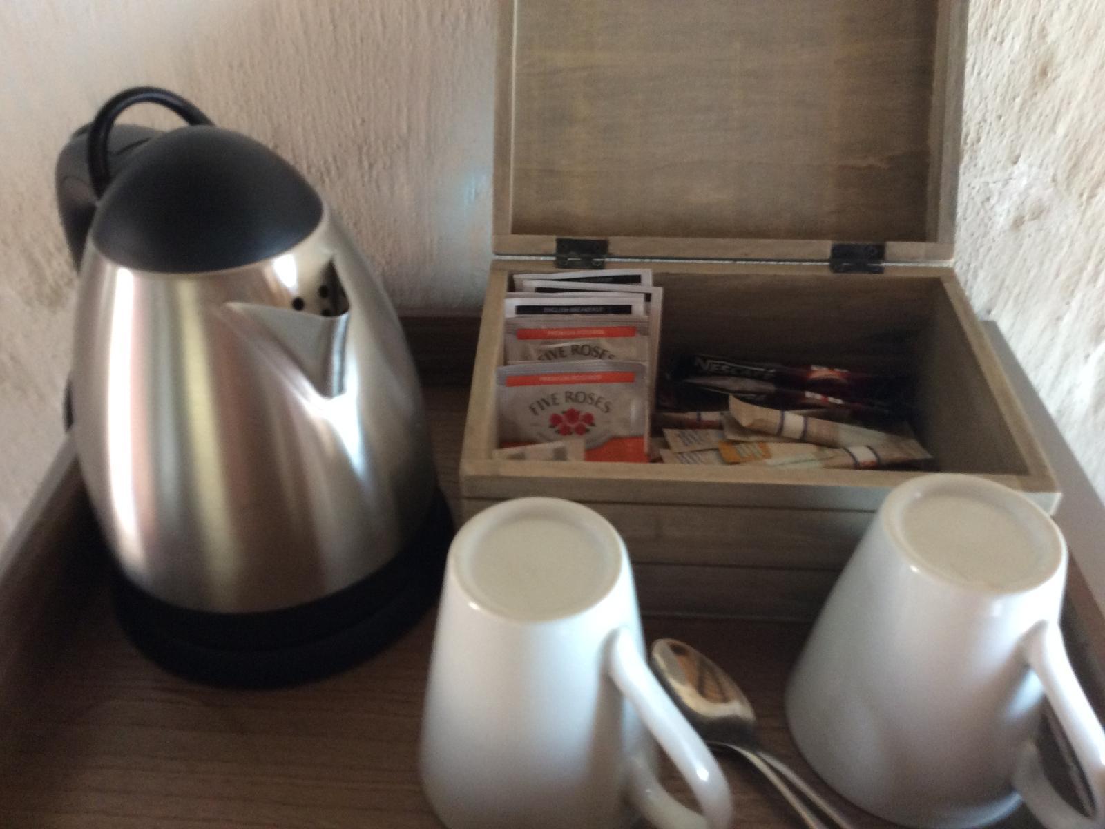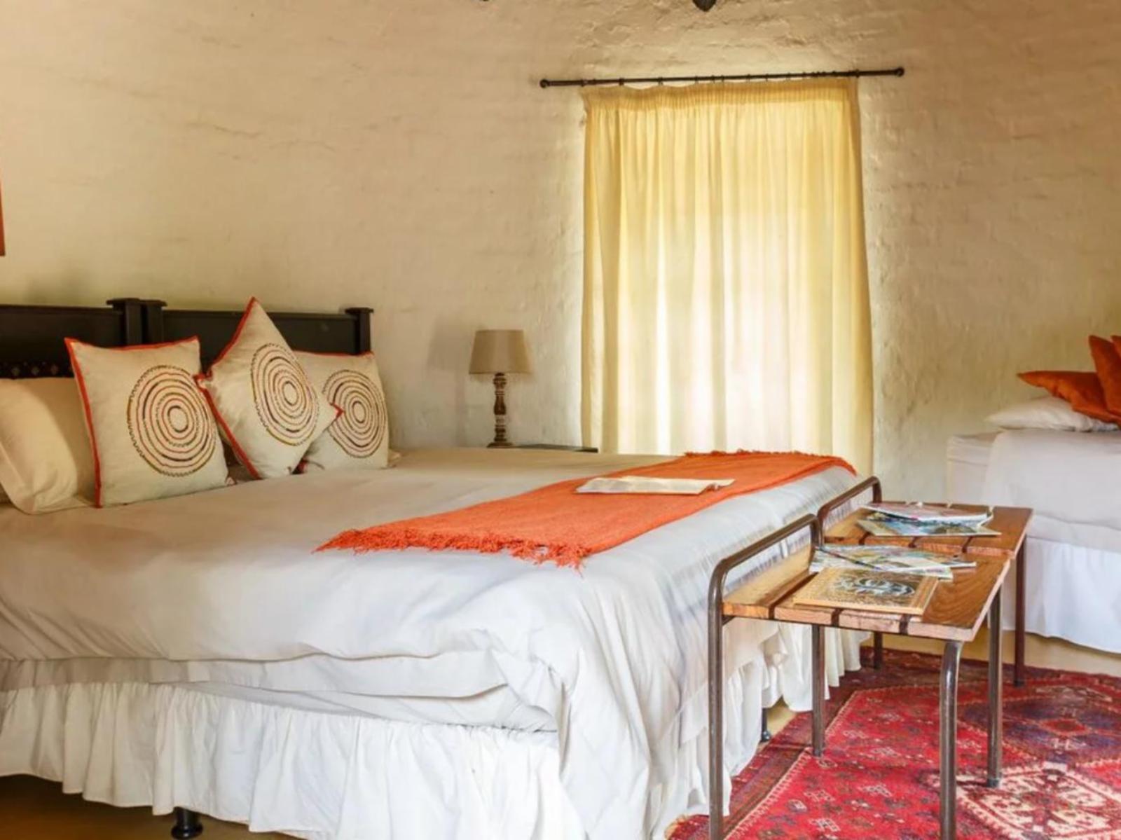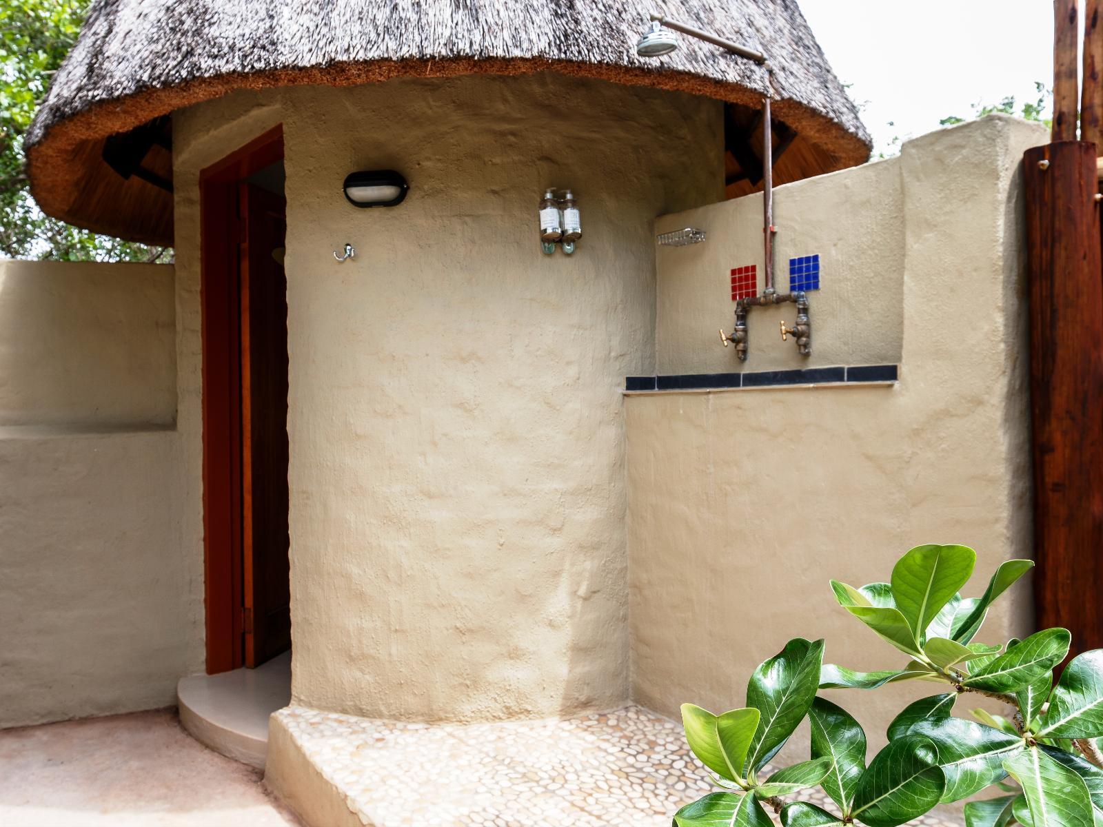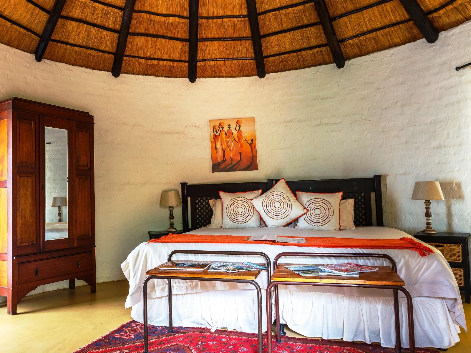 Ceiling fan, Small fridge, veranda Tea & Coffee. Shares bathroom with Shrike Rondavel, Communal Lounge, Boma. & Pool.