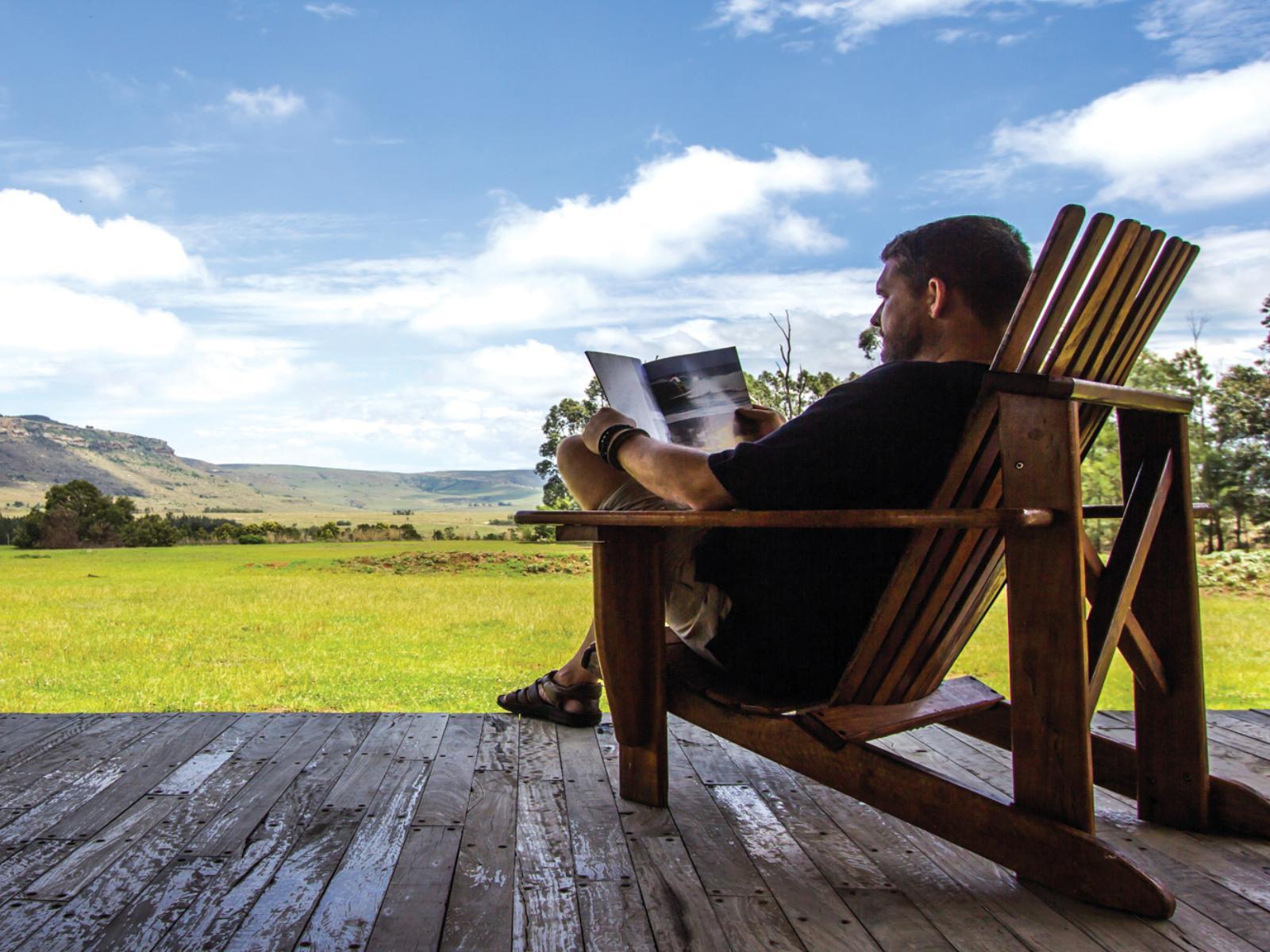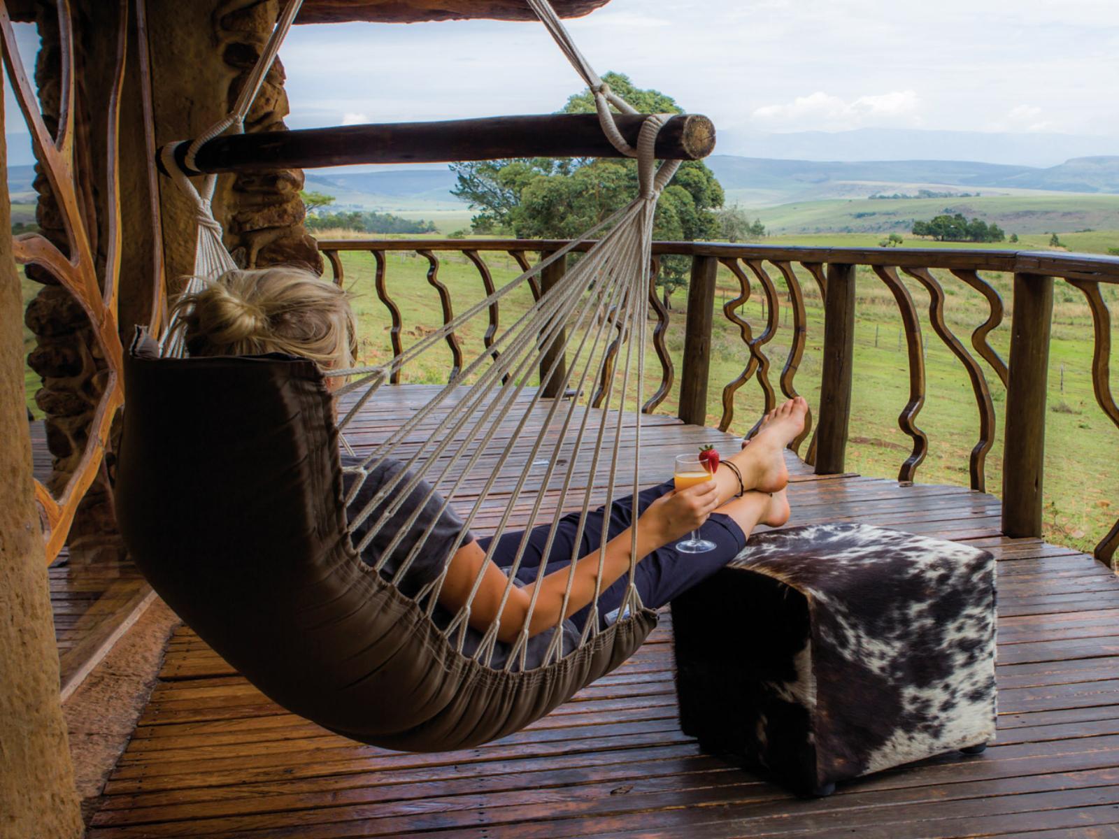 What makes our lodge particularly special is that we offer accommodation in a luxury cave. This is an accommodation unit built under a rock. Glass doors open onto a wooden deck with hammock chairs and a spectacular view of the Drakensberg Mountains. This is a luxury eco experience. The cave is cosy and comfortable with features like a Jacuzzi spa bath and a fireplace and even has rock art on its walls.