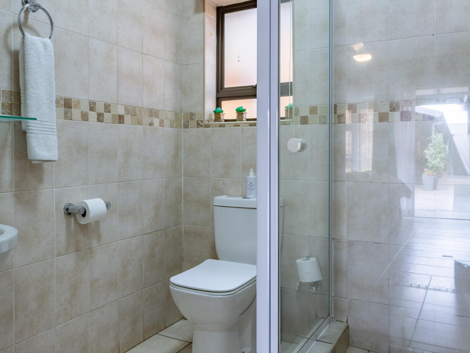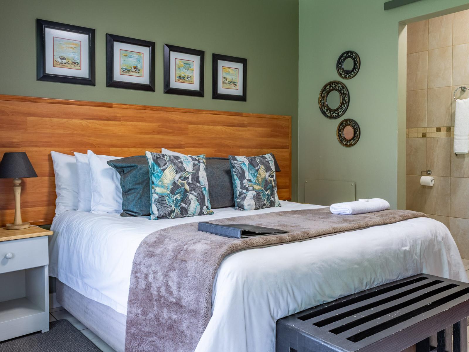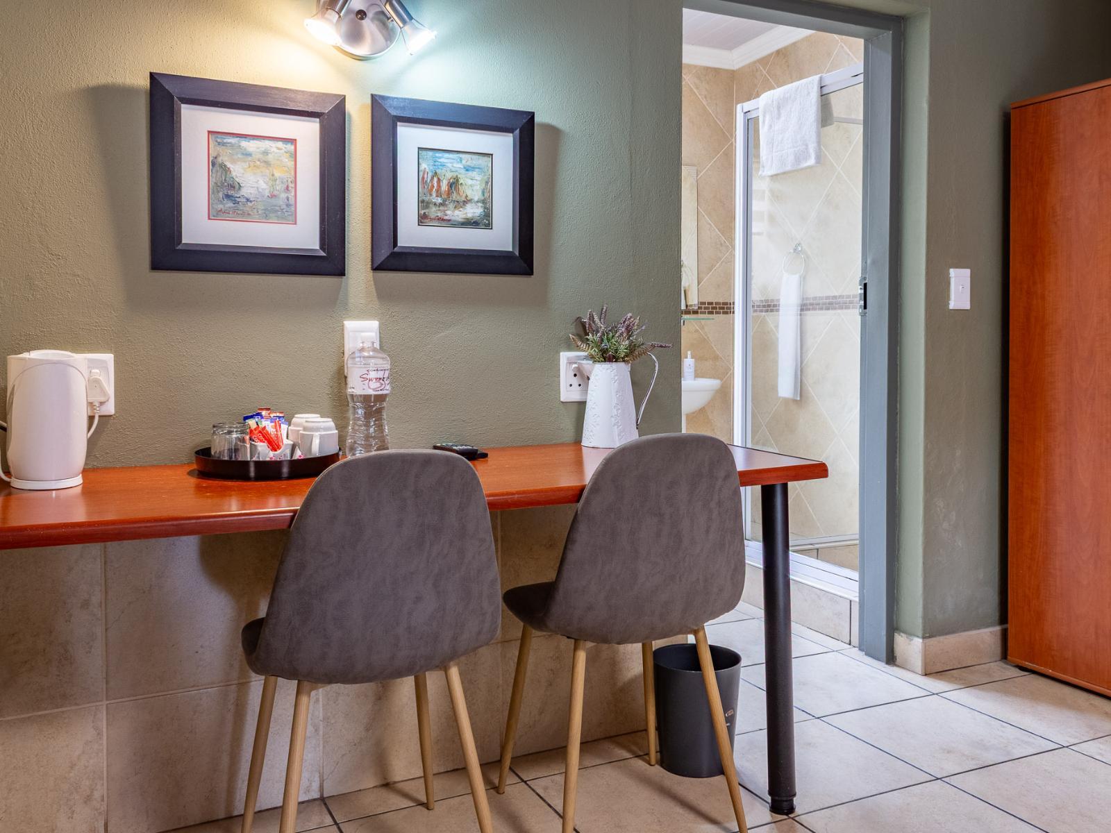 Stylish room with contemporary decor and style. Each room has a queen-size bed (Or 2 Single Beds), en-suite bathroom with a shower, bathroom amenities, wardrobe, reading chair, and a TV with DStv. Each room opens up on a verandah.
