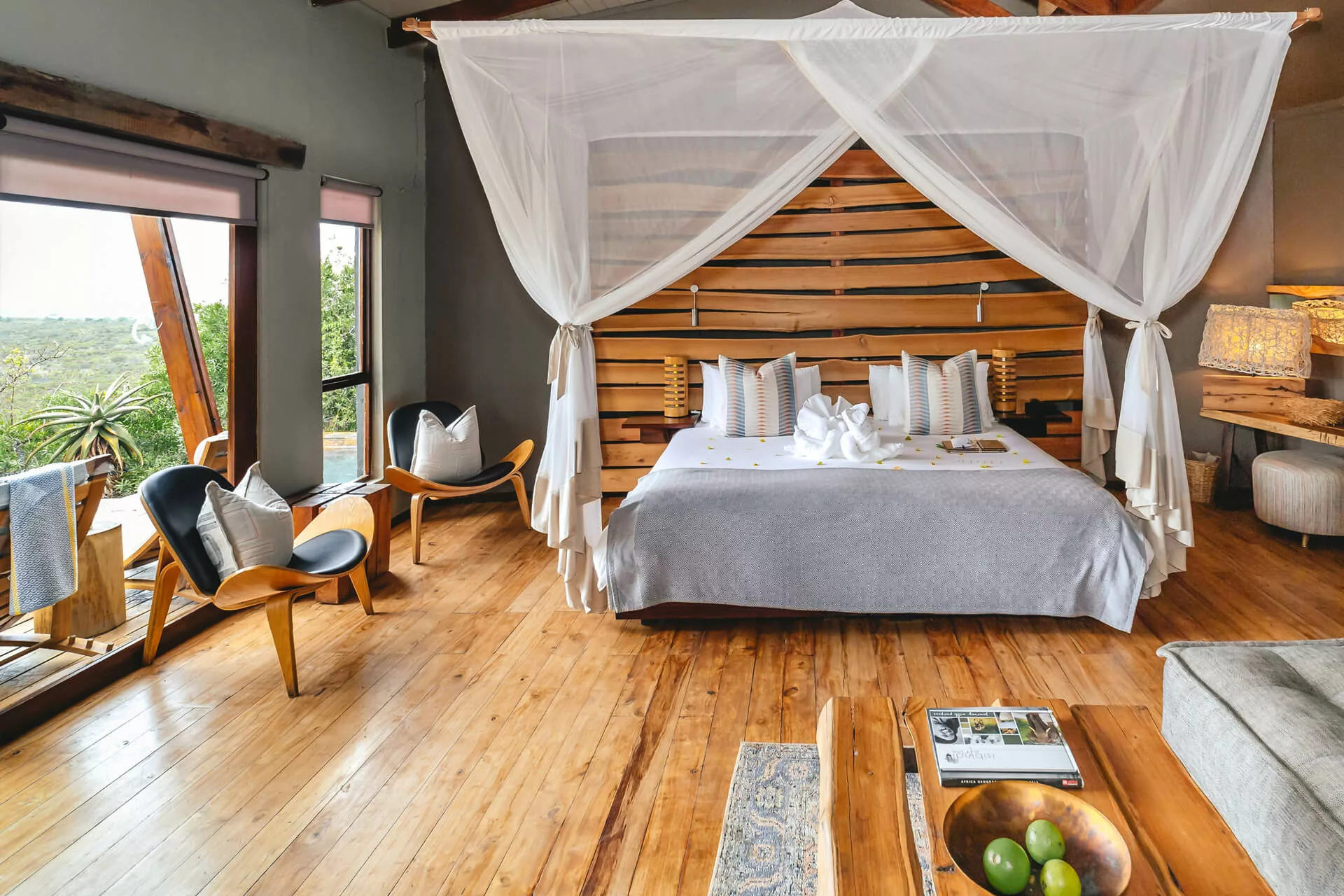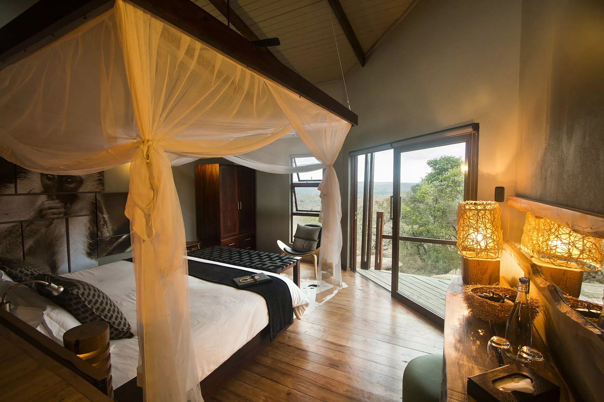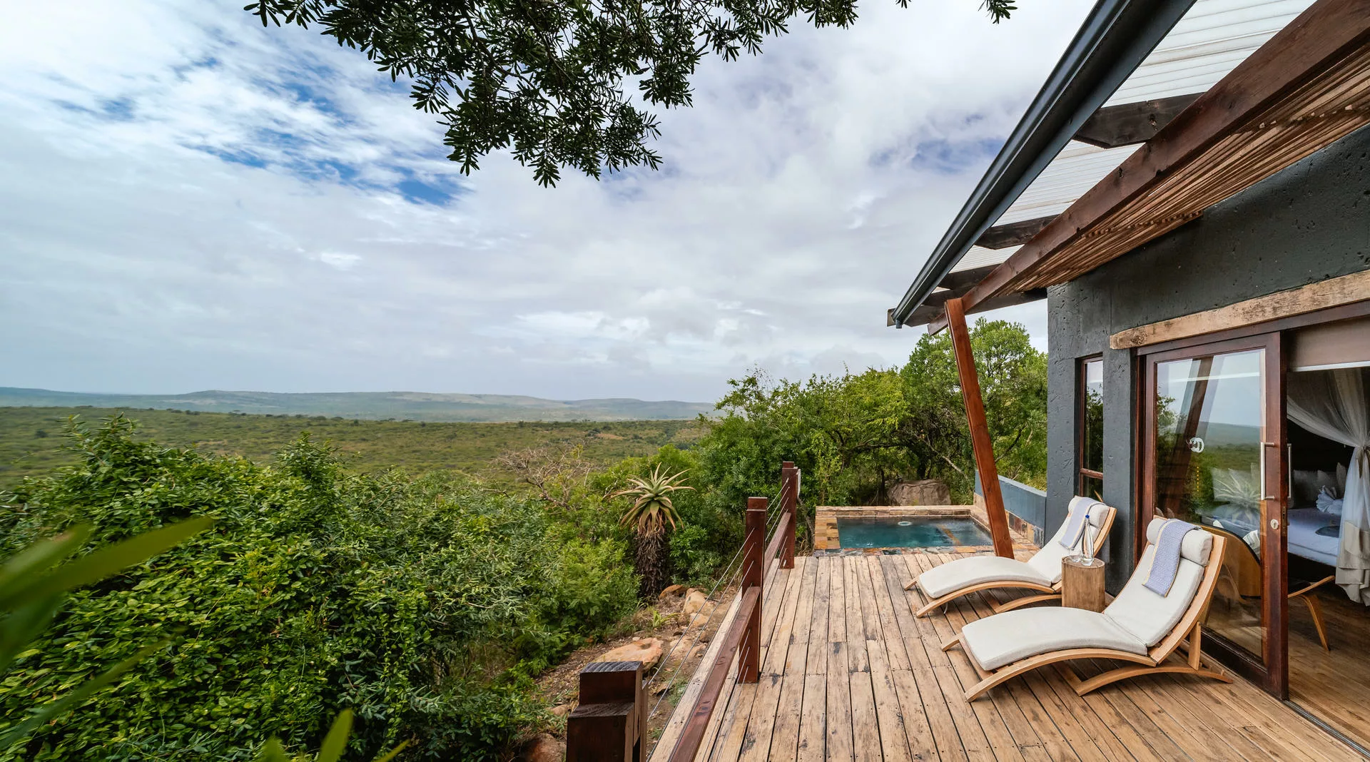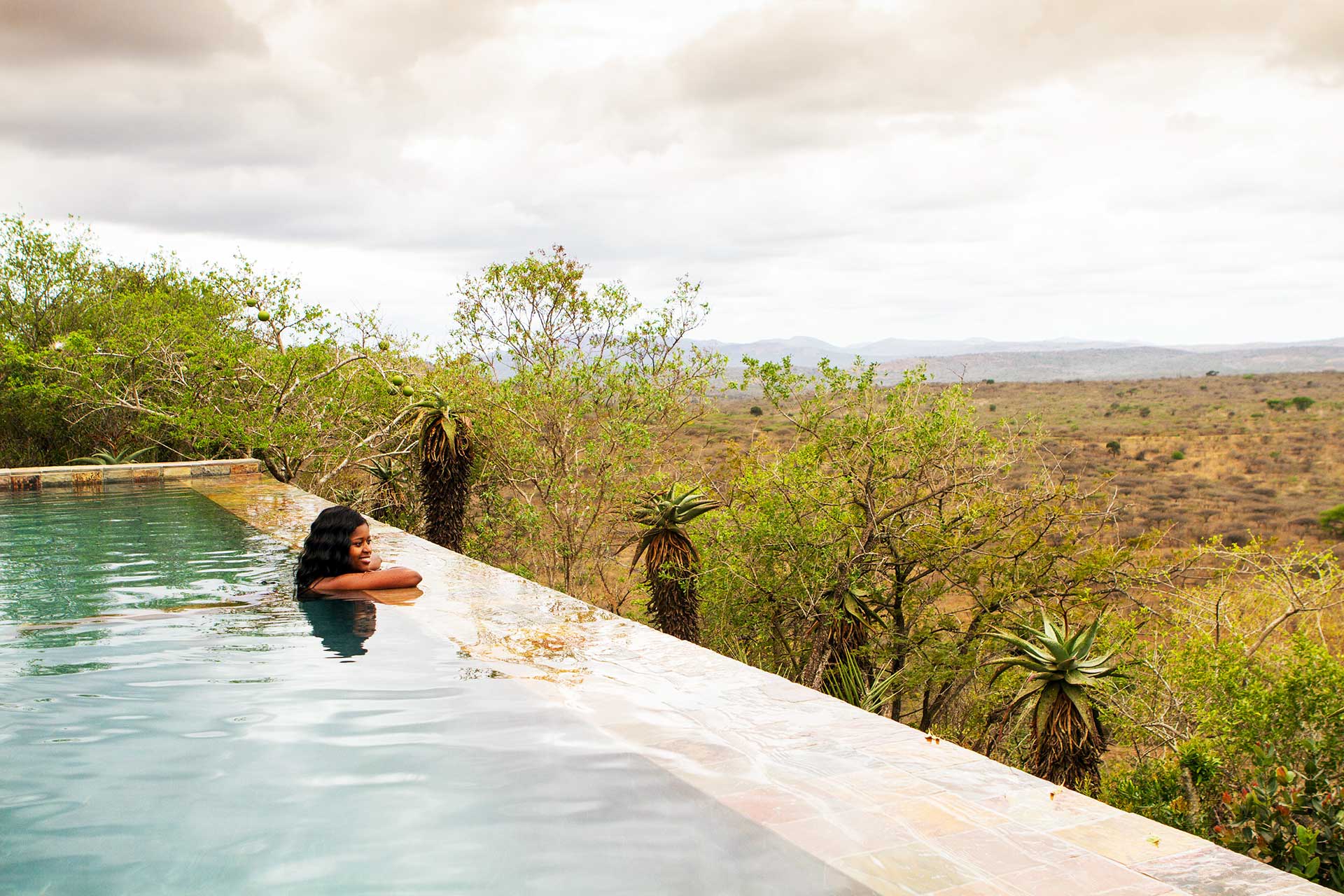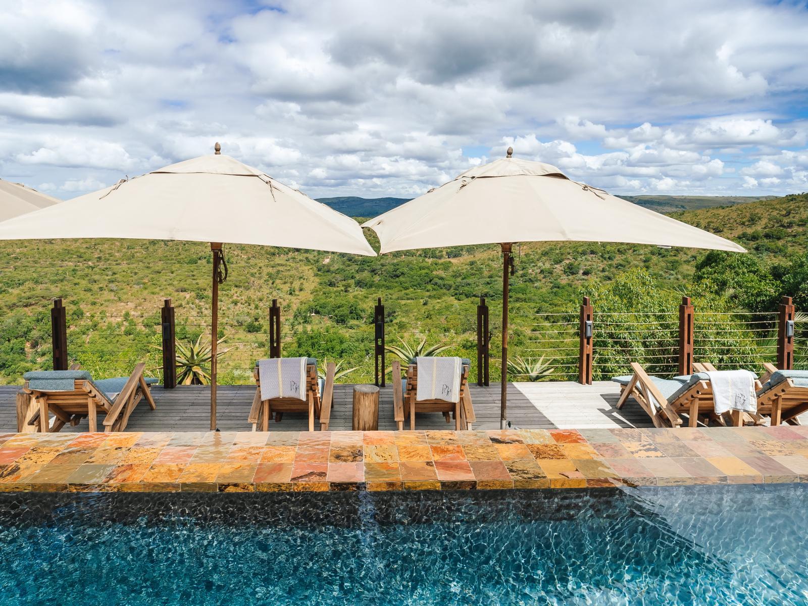 Immerse yourself in serenity at the infinity swimming pool, surrounded by sun umbrellas and wooden loungers adorned with comfortable cushions. Marvel at the magnificent views of the African bushveld below as you bask in the refreshing waters.