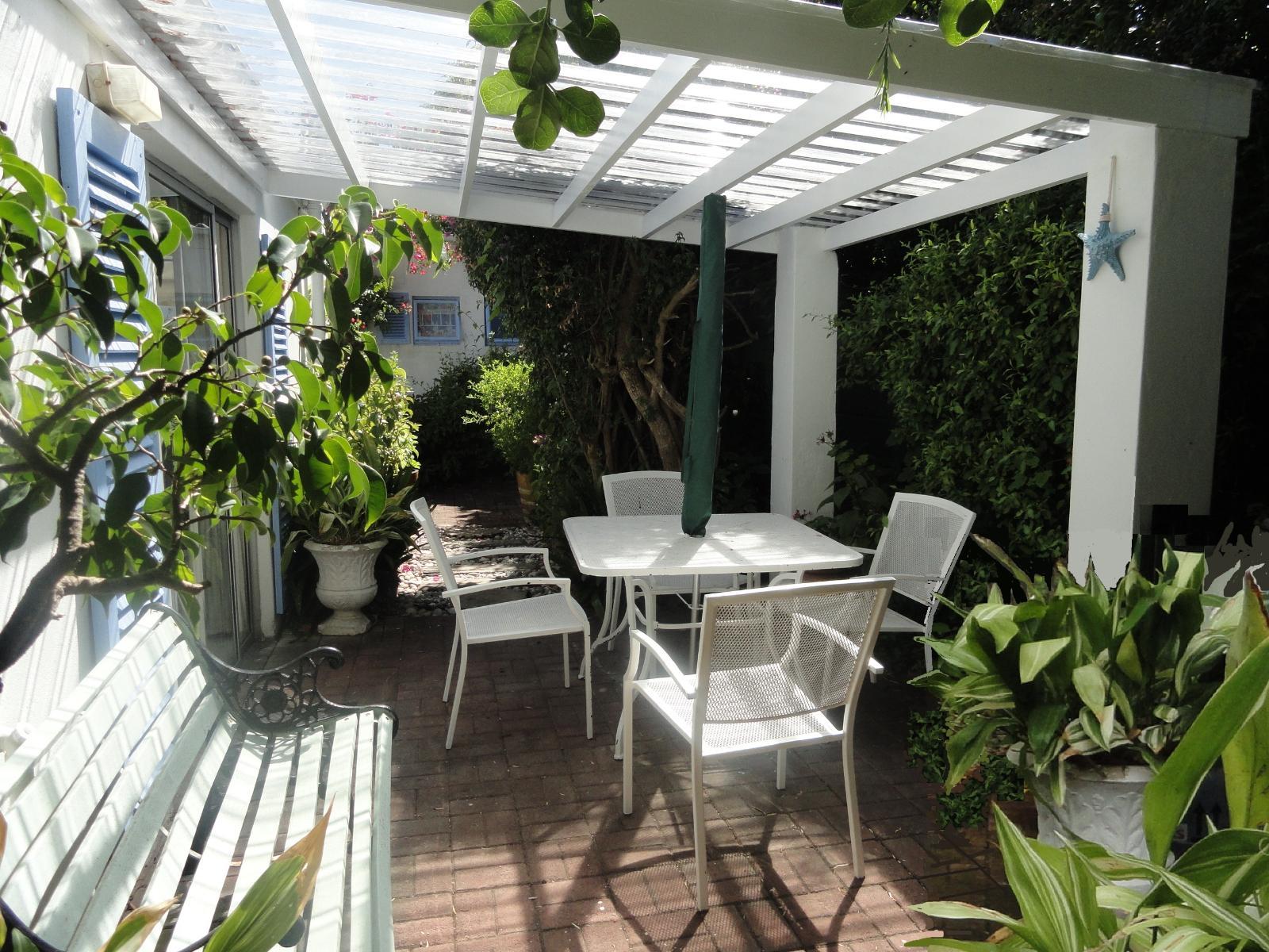 * Garden Cottage: free standing cottage with king or twin beds in the open plan studio layout for Dad and Mum. Small separate bedroom with single beds for two children or teenagers. Fully equipped kitchenette with breakfast table. Wood burning fire place. Walk in shower with hand rail. Enclosed garden. Covered patio for outdoor living. Braai area. Pet Friendly on request. Private entrance.