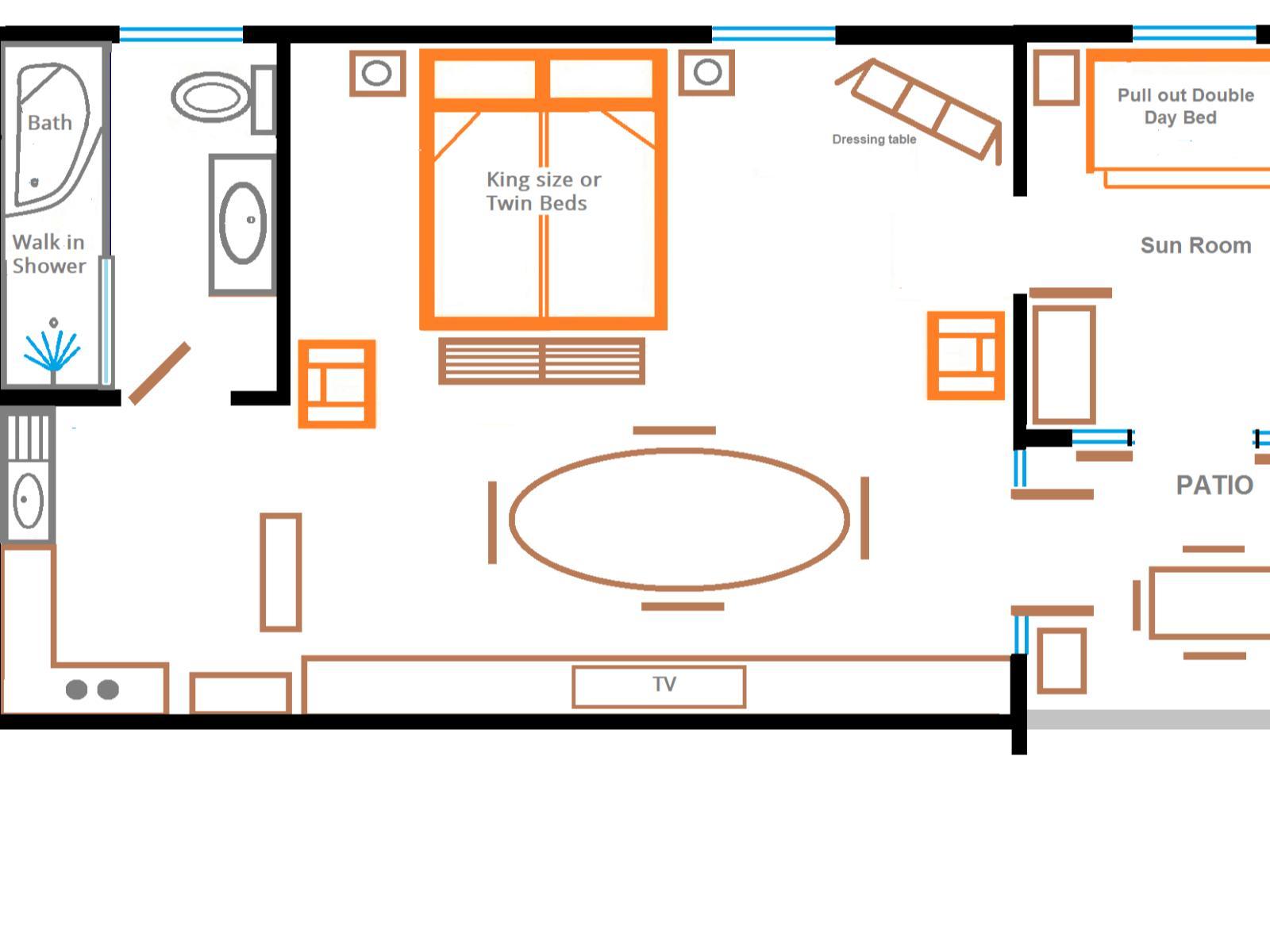 * Rose Room: Spacious open plan room with king size or twin beds, full bathroom with separate step in shower and corner bath. Inter leading sun room has 2 day beds for 2 additional guests. Covered patio. Fully equipped kitchenette and dining area. Wheel chair accessible. (Small Pet) friendly on request. Private entrance.