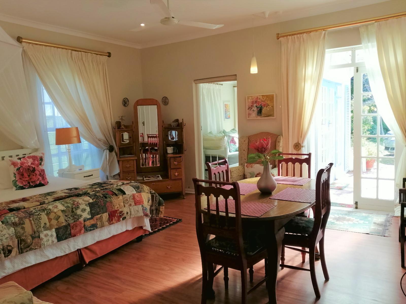 The studio style Rose Room with king bed (or twin singles) opens to a sunny covered patio and sun room with 2 single day beds. Bathroom – walk in shower and bath. Kitchenette for light self catering. Kettle braai facilities. Private entrance. Fibre Wifi