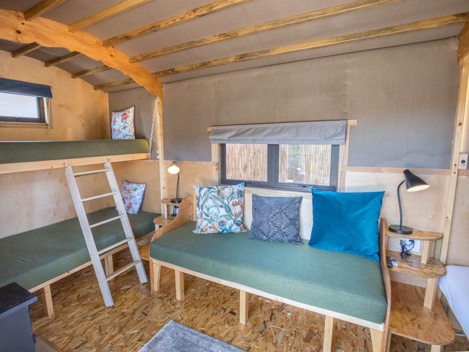Shepherds Wagon sleeping 4, across a double bed & bunk beds, the wagon also has a seating area, fan, fireplace, Netflix TV & an undercover stoep with built in braai, sofa & dining furniture. The site has its own bathroom, kitchen & wood fired hot tub.