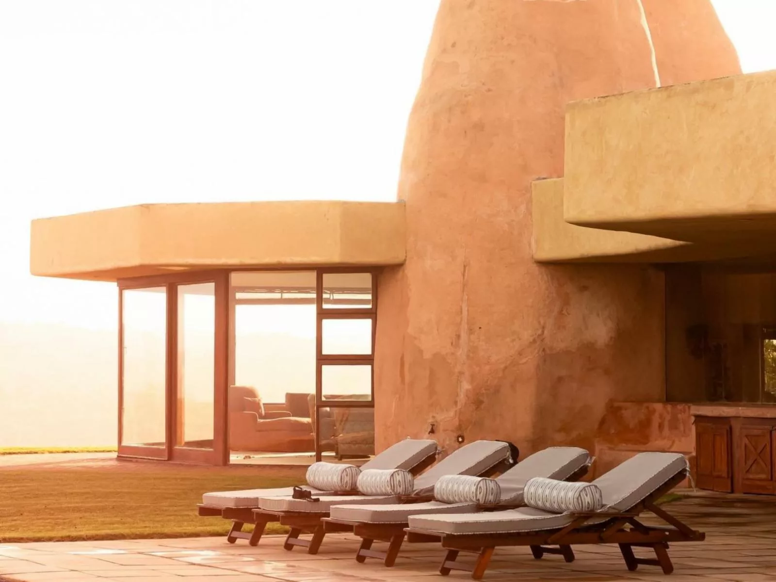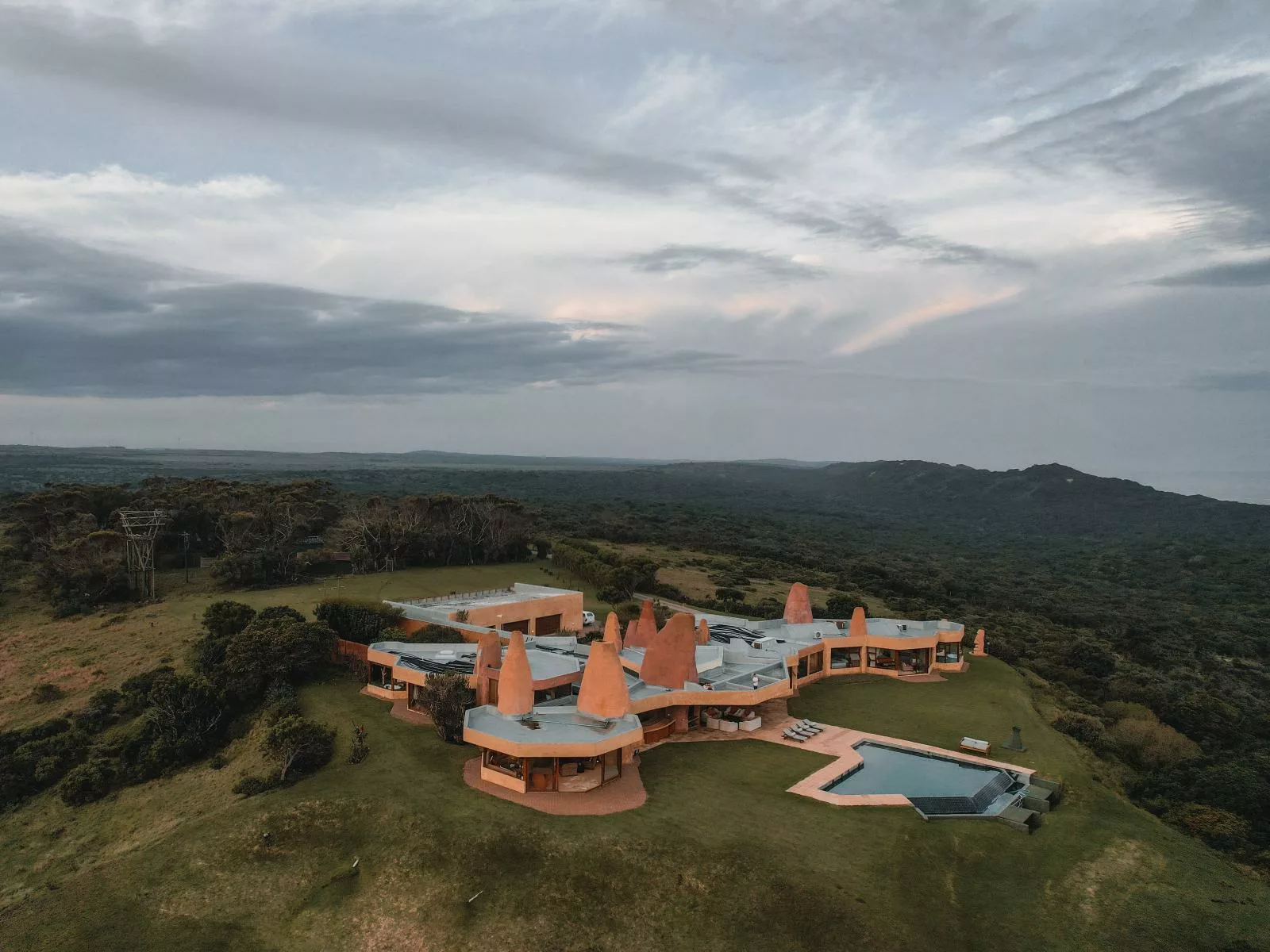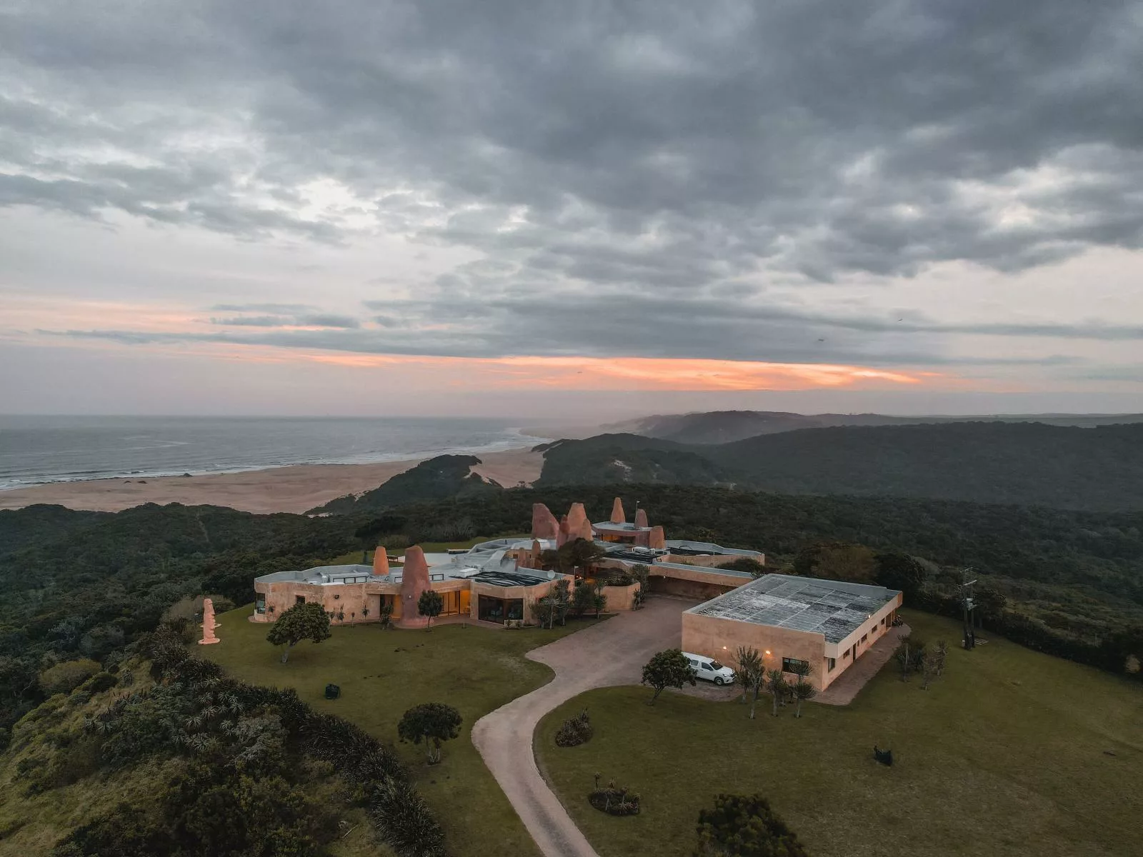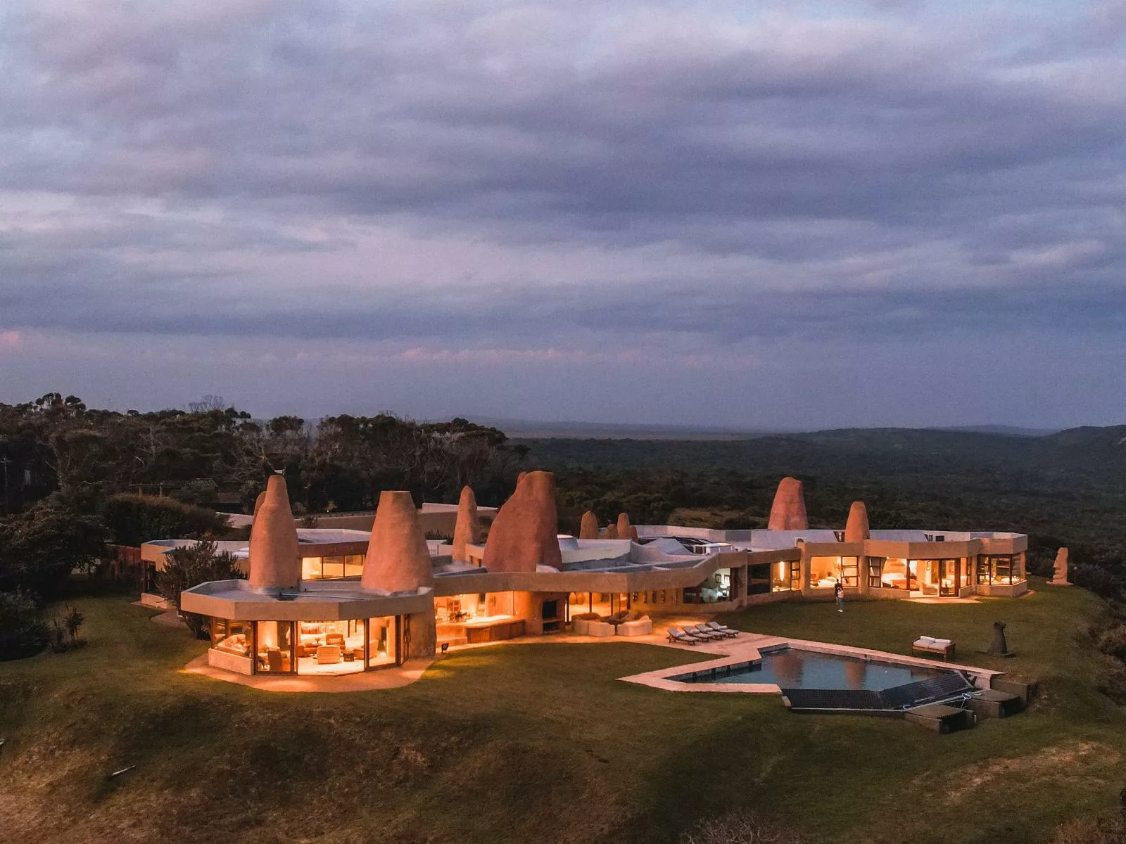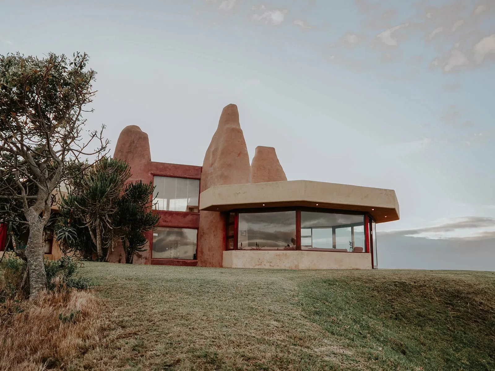 The estates turrets, reaching through and beyond the double-volume ceilings, invoke a surreal reflection of a termite mound, or a loosely-formed, surreal sandcastle.