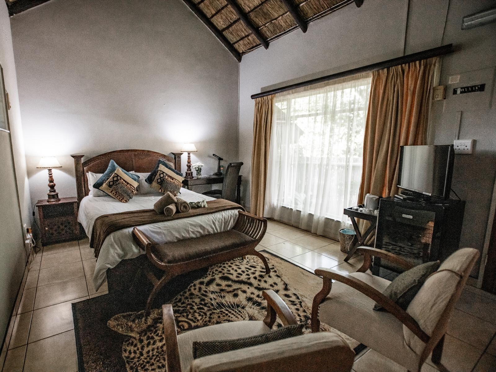 A self-catering luxury room with Queen bed, DSTV, and an ensuite bathroom with shower . The equipped kitchenette has a Fridge, microwave and a 2 plate stove and Tea and Coffee making facilities
