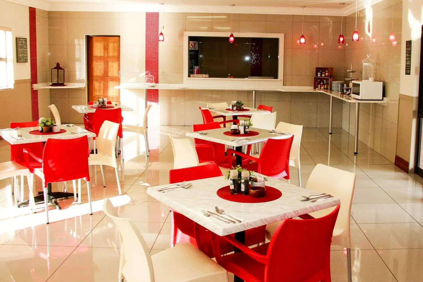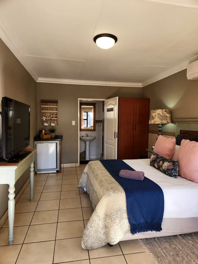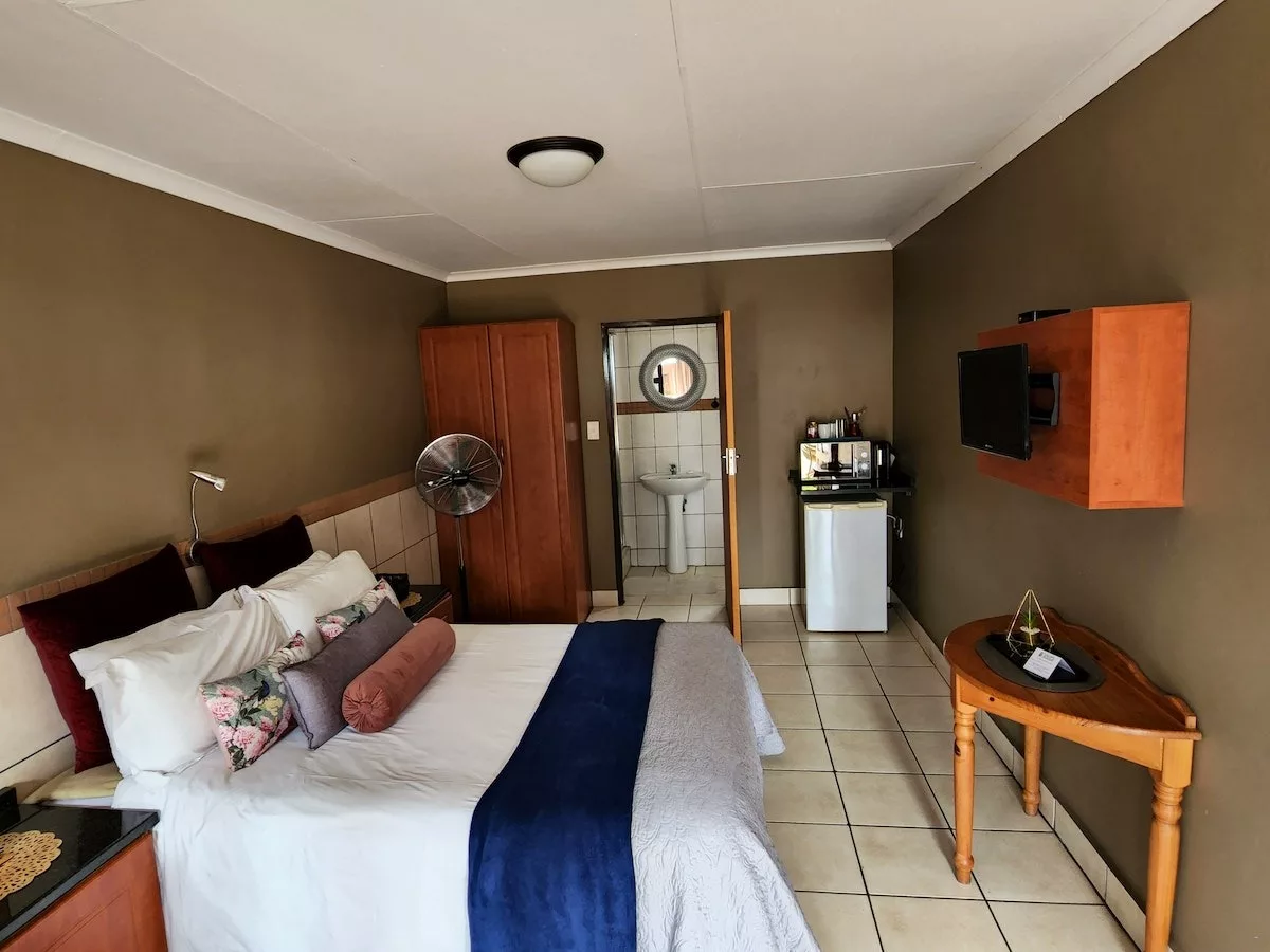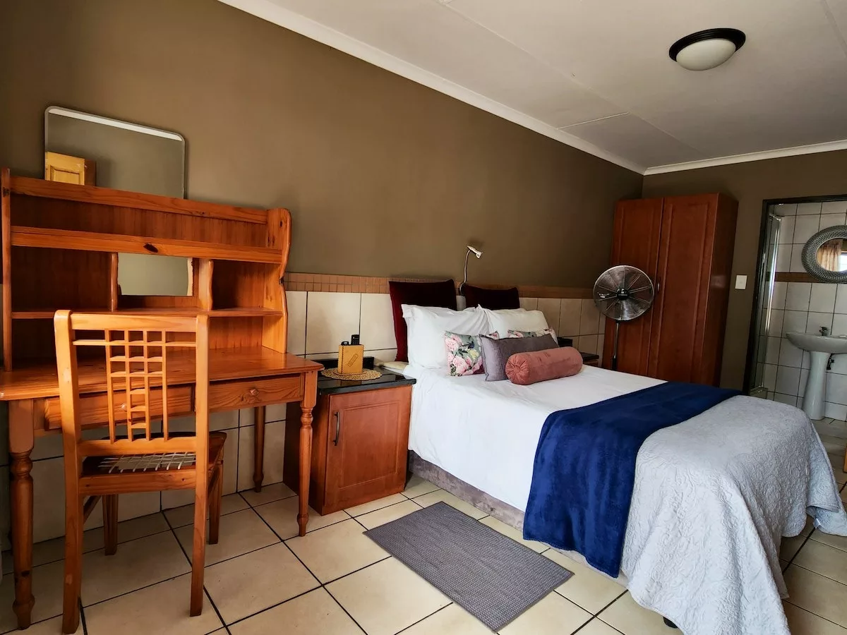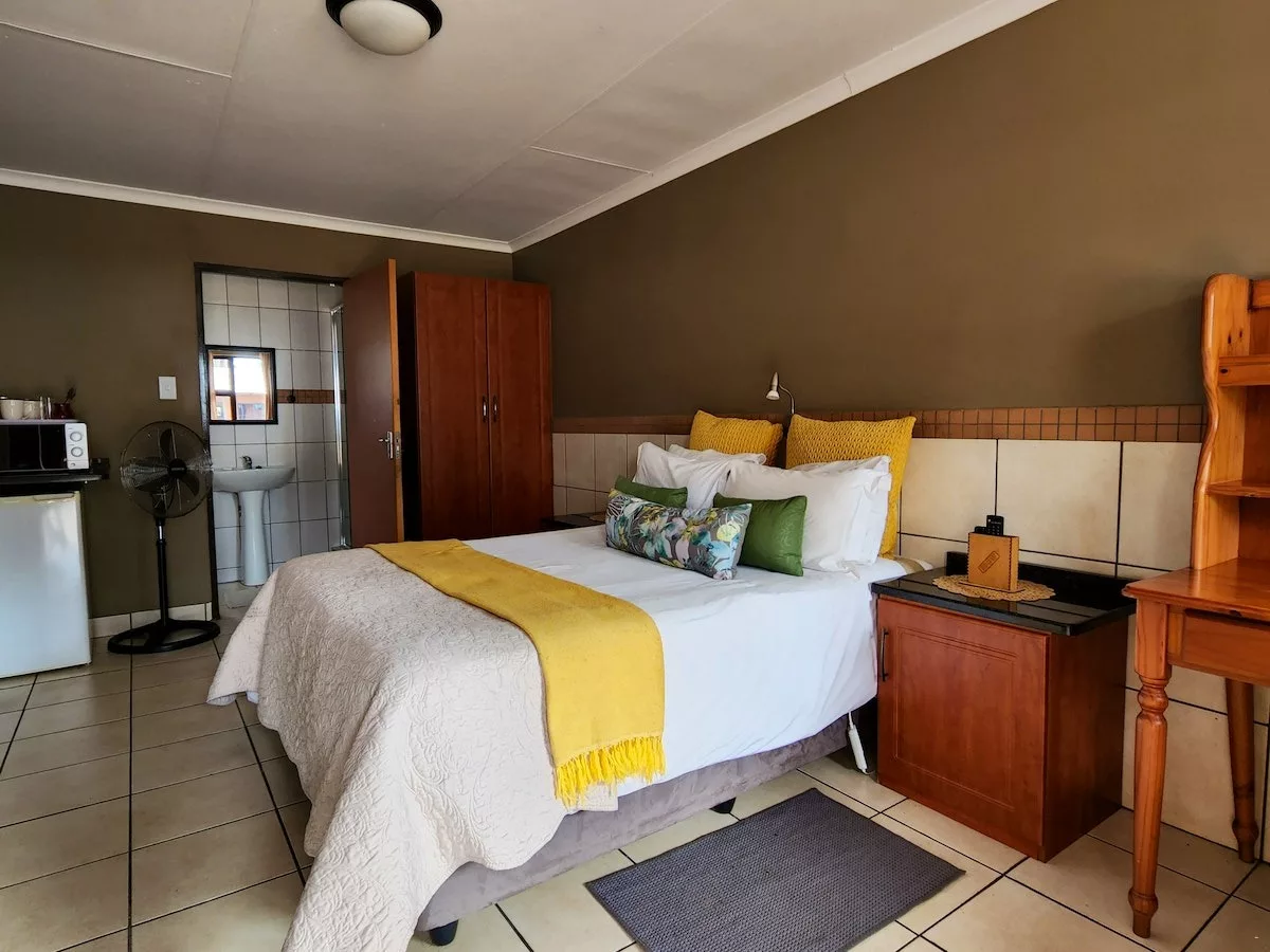 The room is furnished with a double bed, and has an en-suite bathroom with a shower. A tea and coffee station, a microwave, a fridge, a TV with DStv, and Wi-Fi access are available. Meals are available on request.