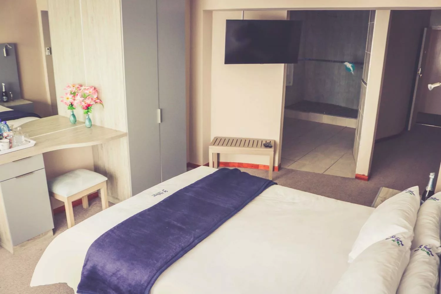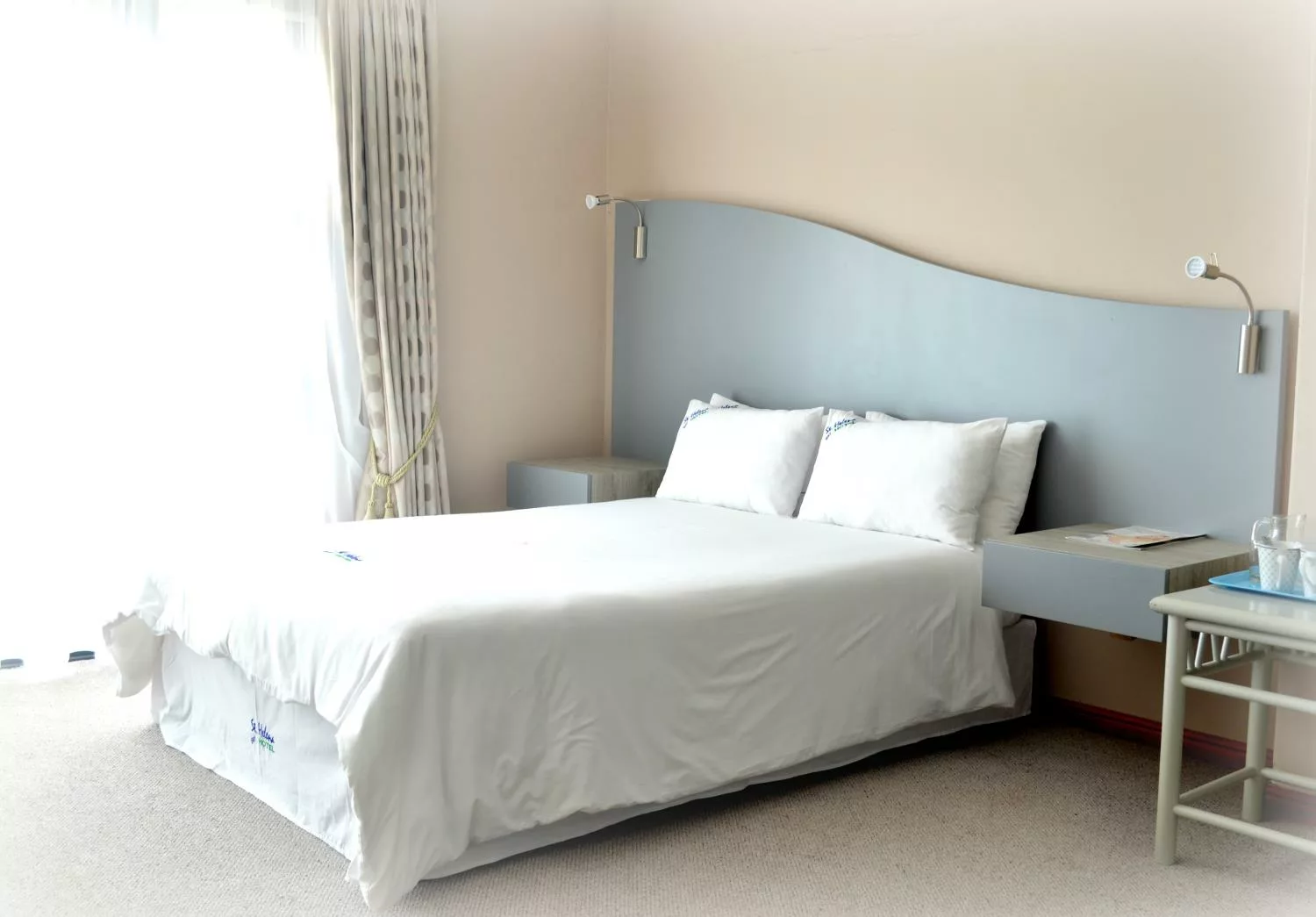 Luxury room with queen bed and full sea views, large en-suite with shower only, aircon, coffee and tea station, dressing table with chair, DSTV, own balcony, outside table with 2 chairs.