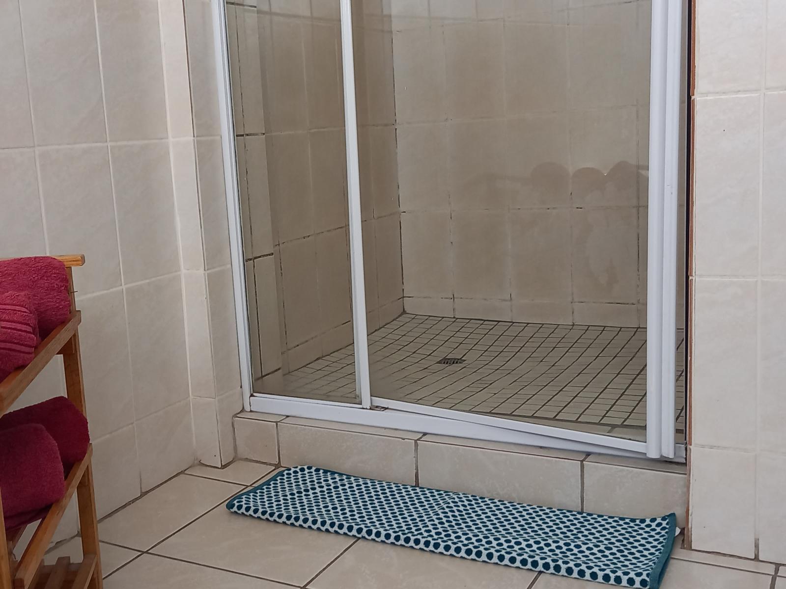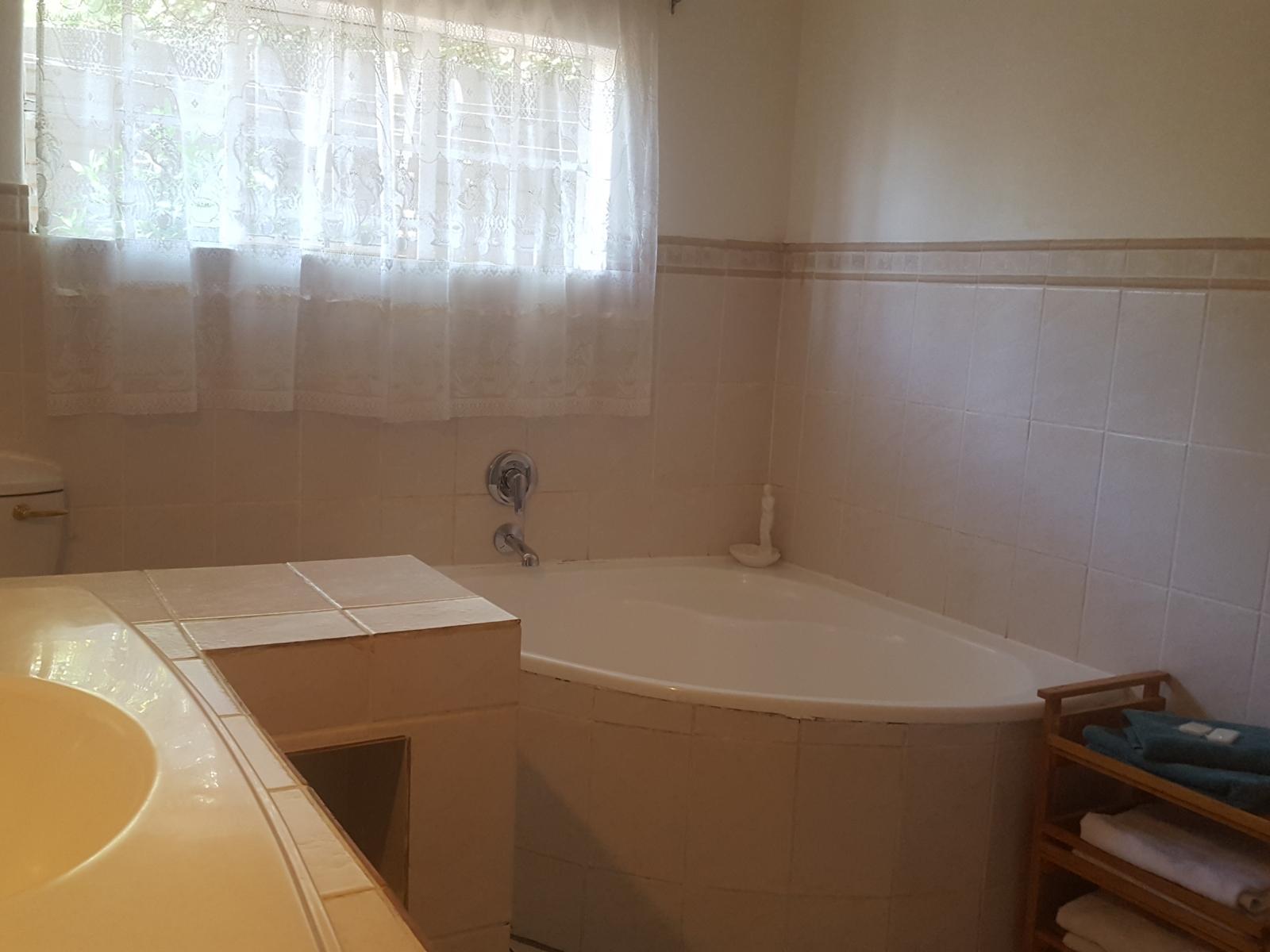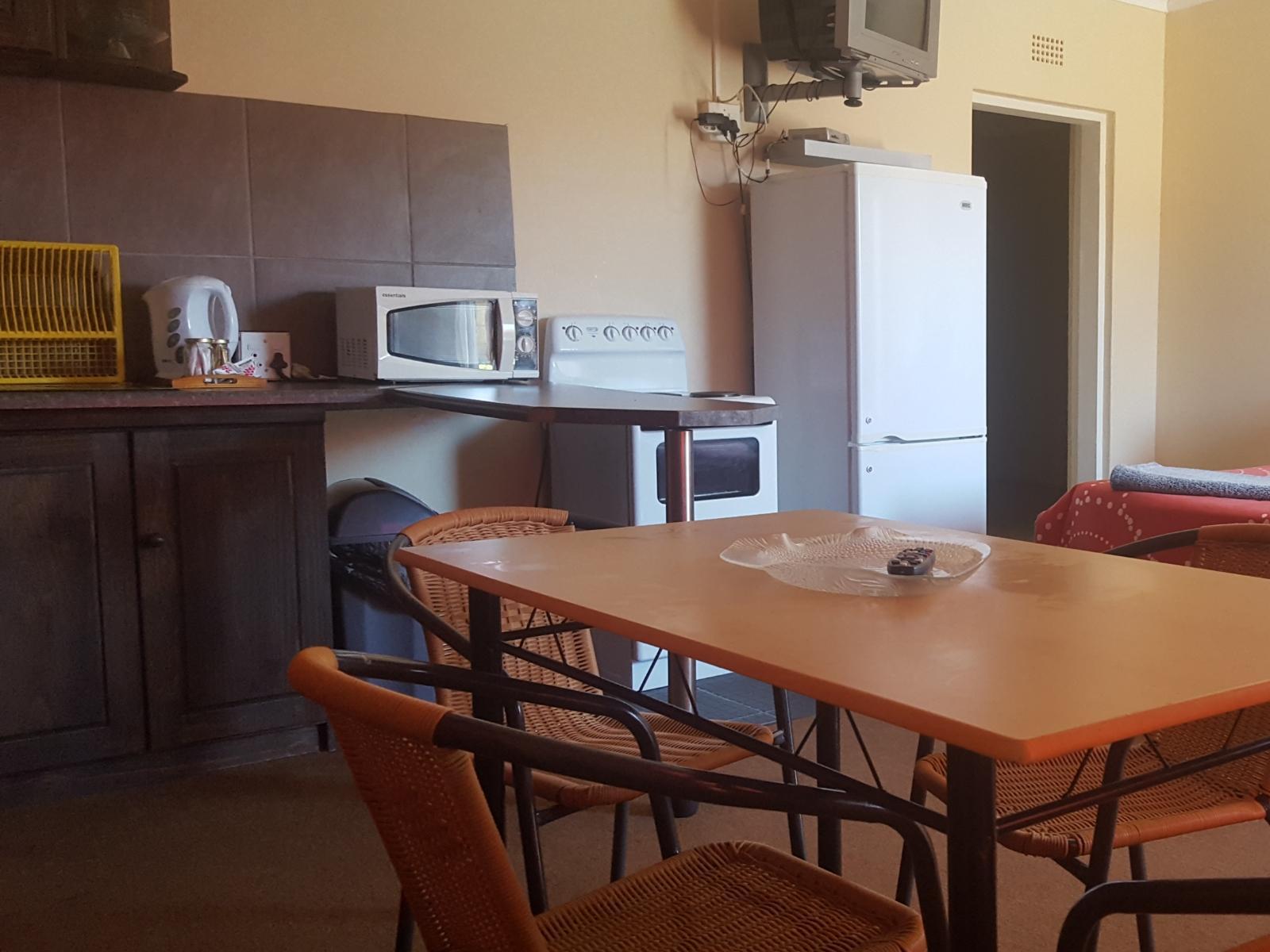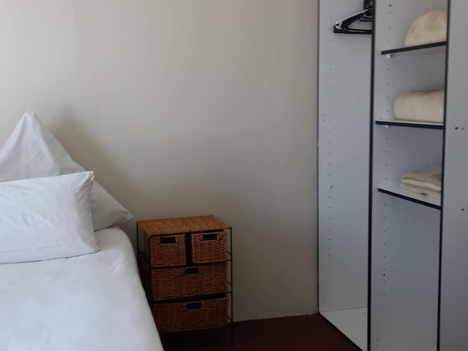 Private entrance to bedroom with 2 single beds/ KING size bed. Own bathroom. Tea and coffee making facilites. No self-catering facilities in this room, but there is an outside braai area that can be used. TV in this budget/ basic room.