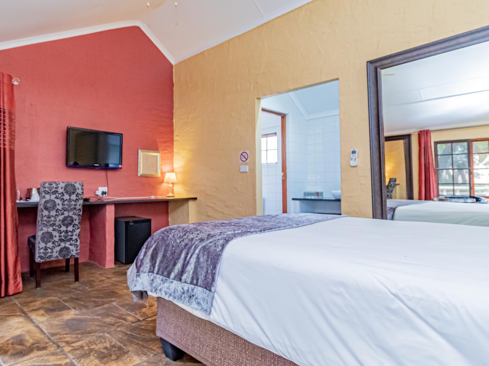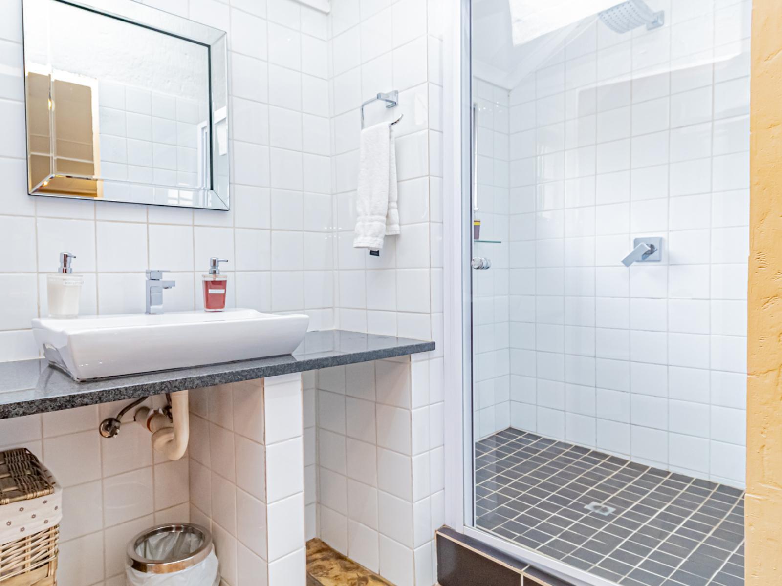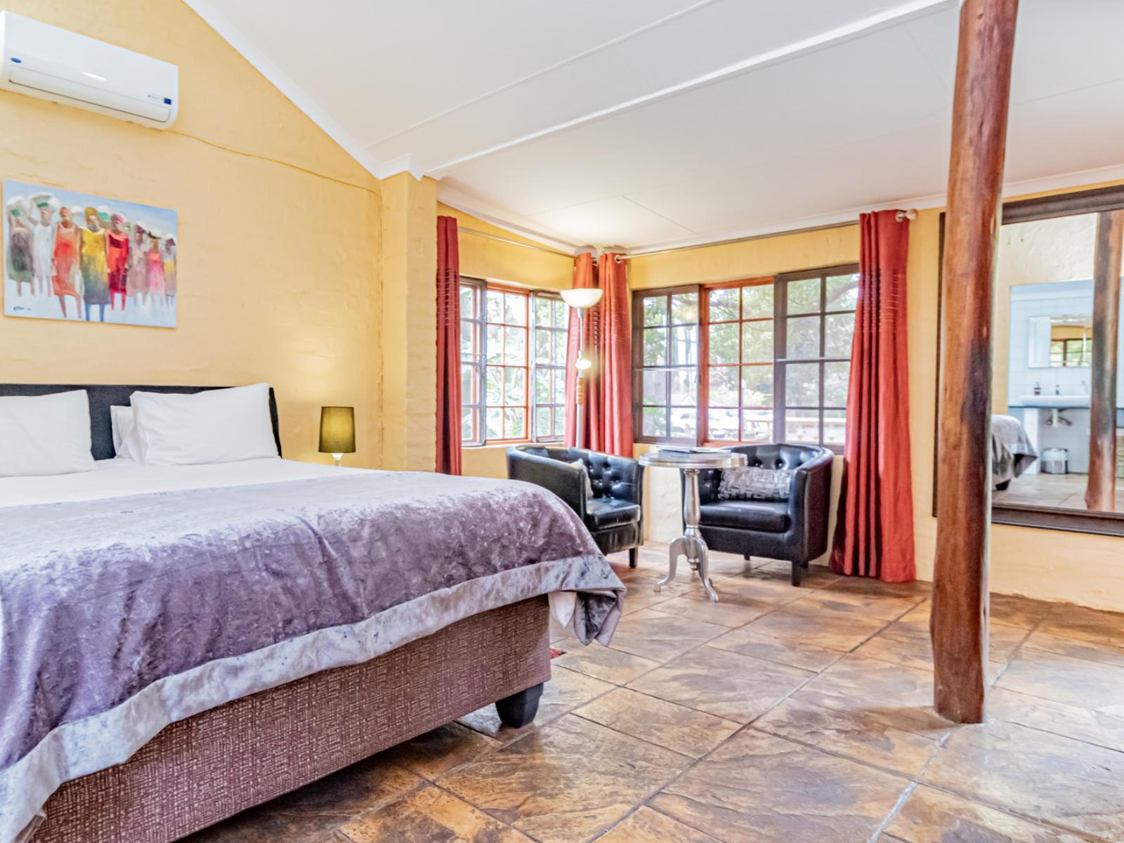 Self-catering unit, with kitchenette, with induction plate, microwave, kettle, refrigerator, and dining table for two. A private bathroom with a shower, queen-size bed, and air-co. Our solar powered battery bank reduces the inconvenience of load-shedding.