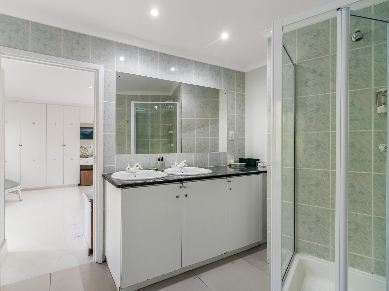 Luxurious en-suite bathroom with walk-in shower and separate bath.