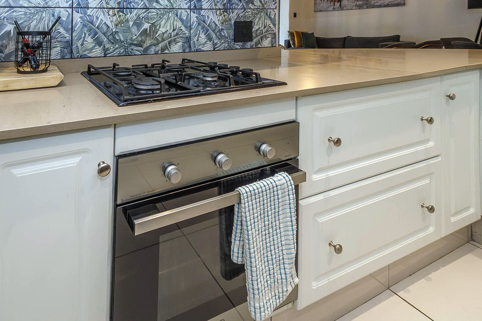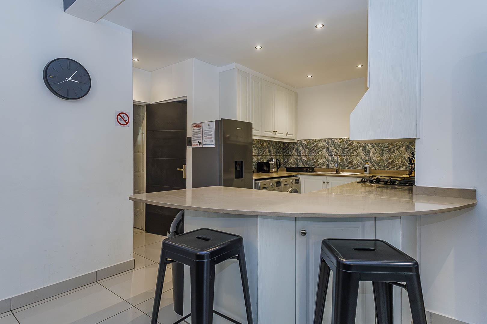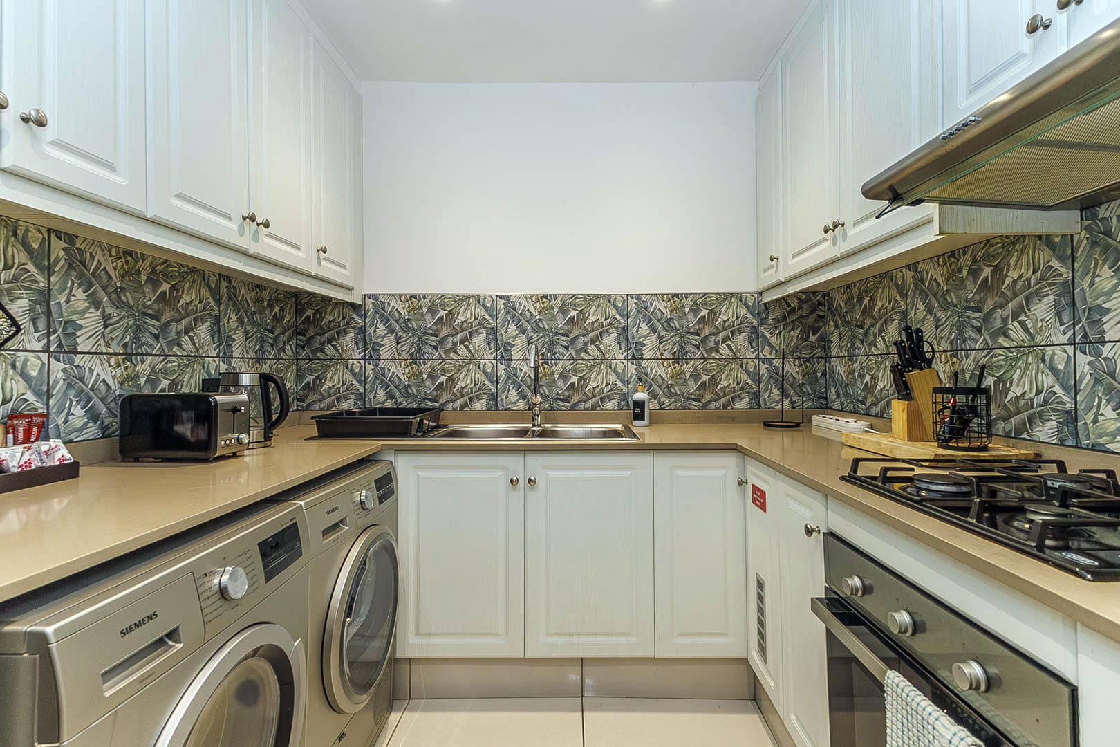 The fully equipped kitchen includes a washing machine, tumble dryer, microwave, kettle, toaster, stove with extractor hood, and a breakfast nook, ensuring everything you need for a convenient self-catering holiday.