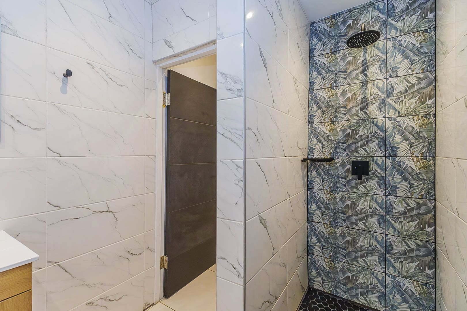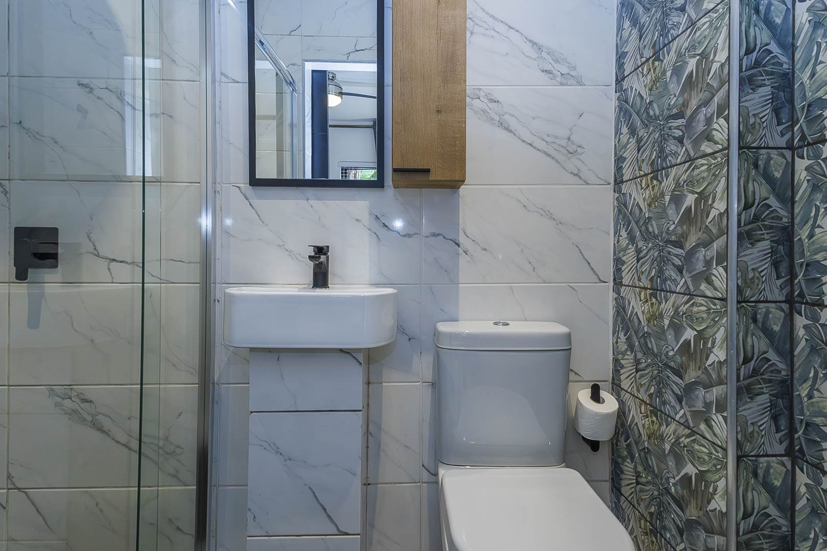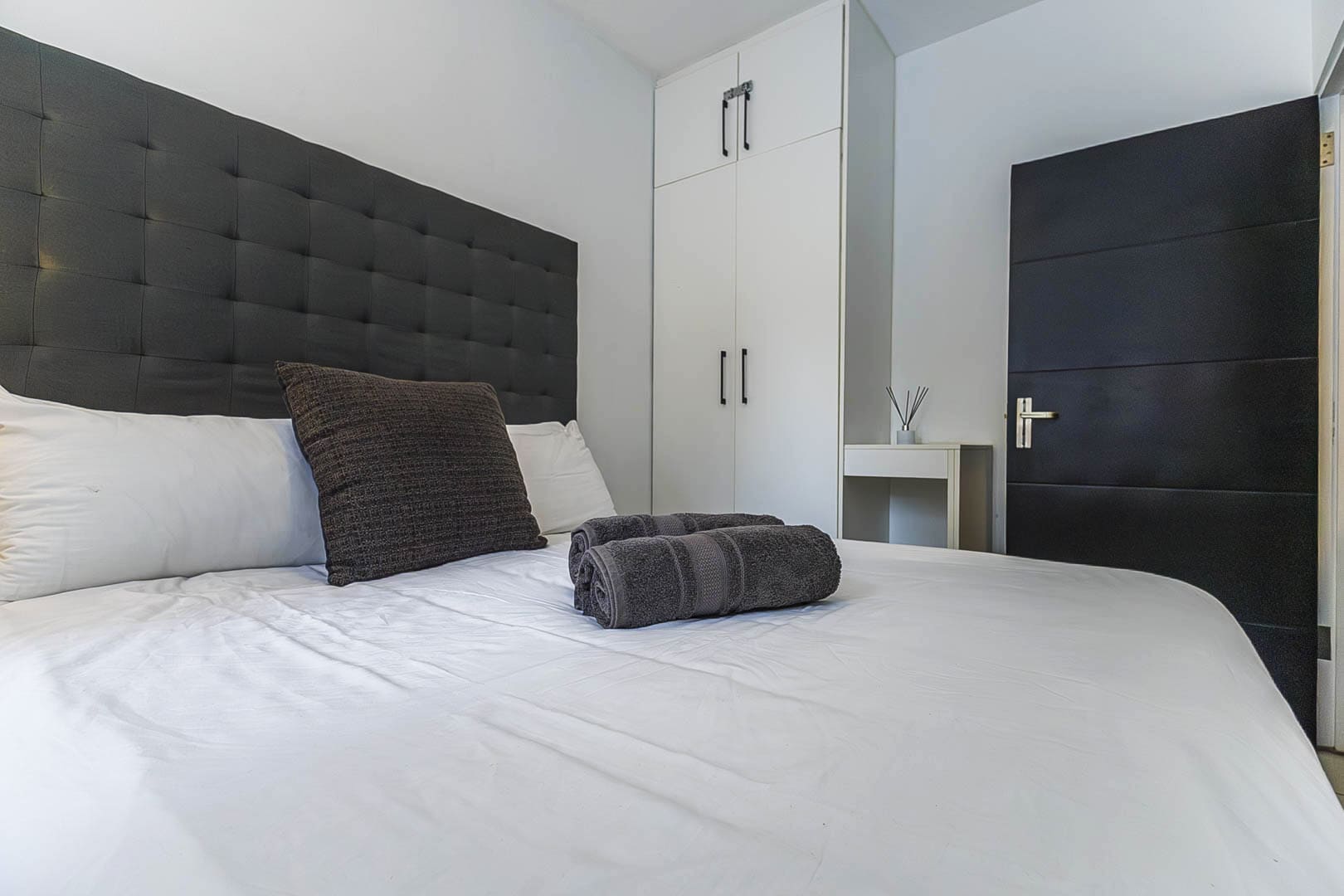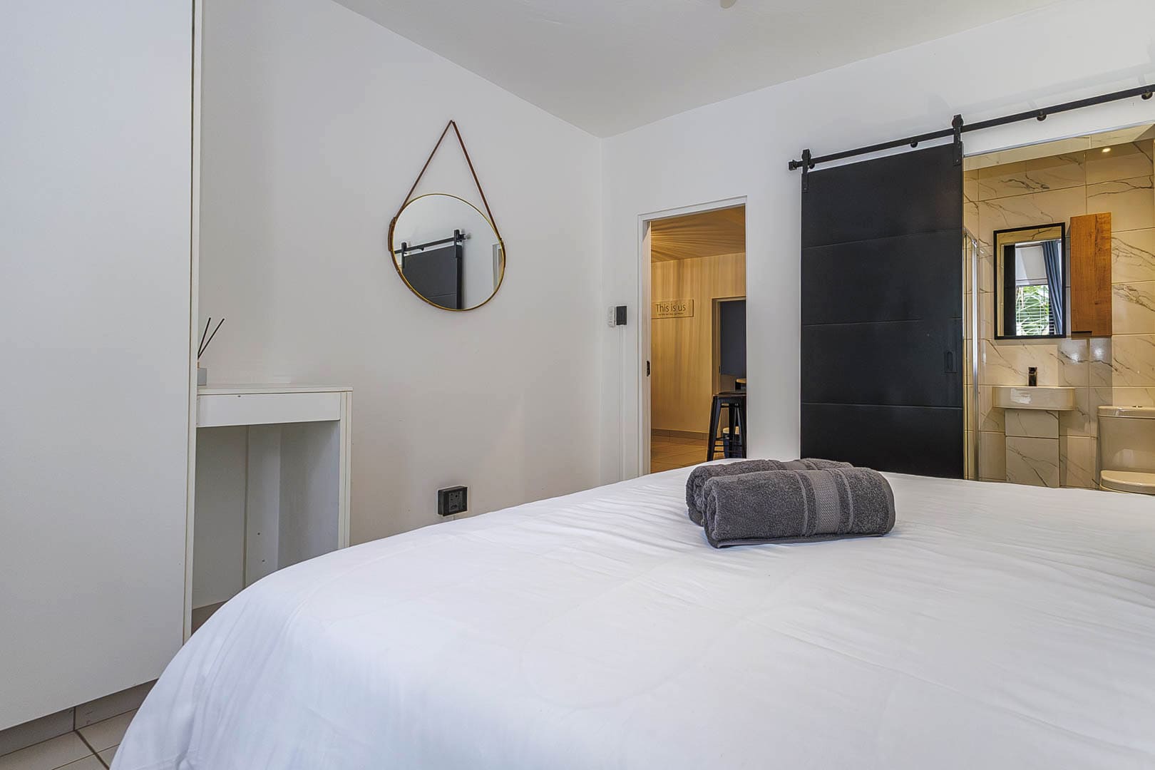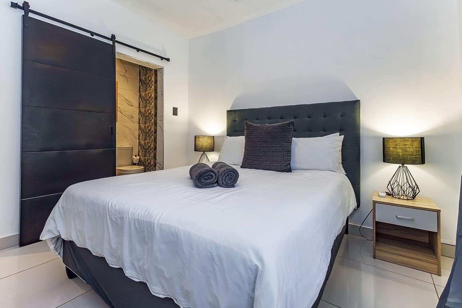 Main bedroom with a Queen-size bed, built-in cupboards, and a compact modern en-suite shower room