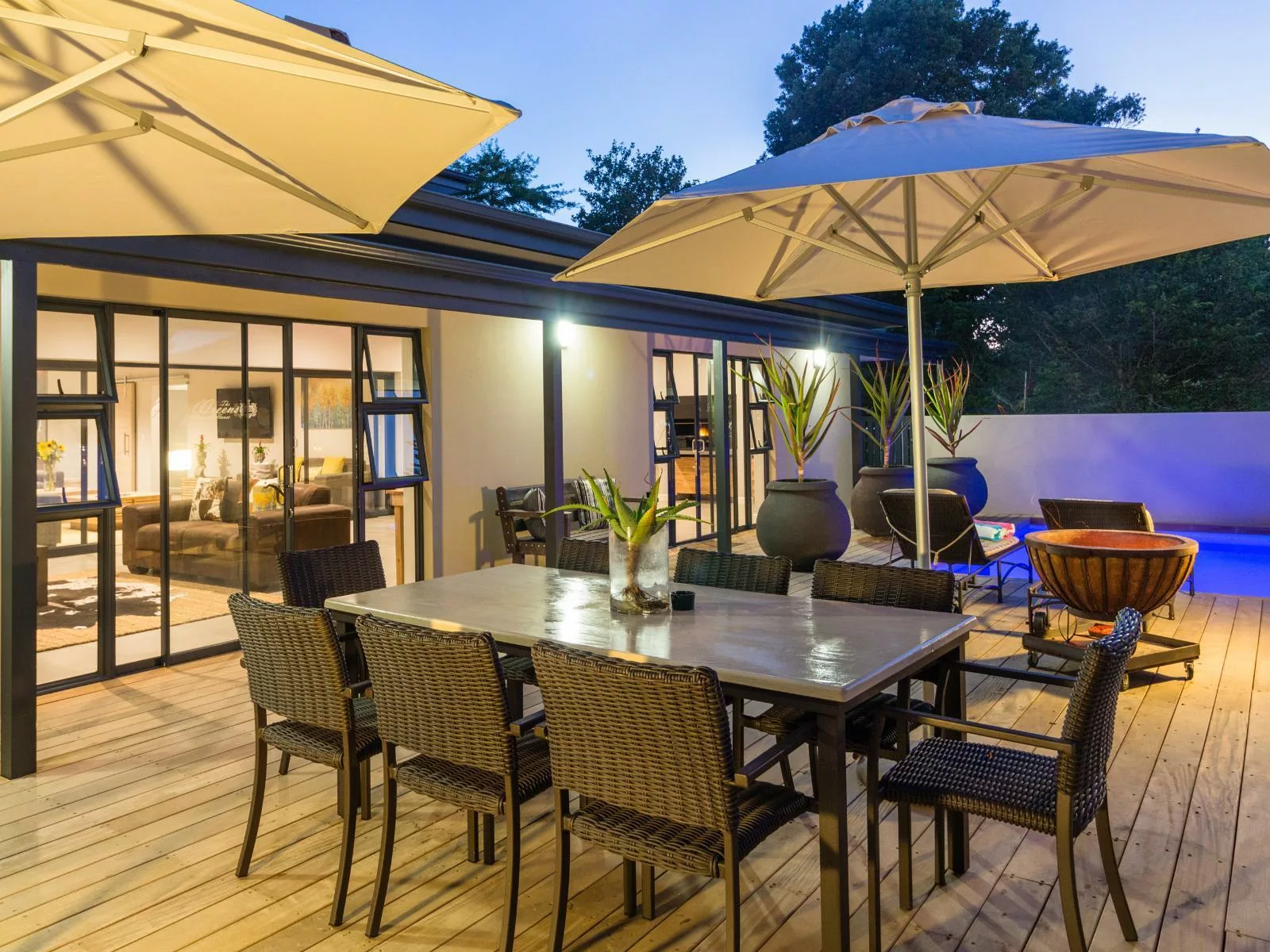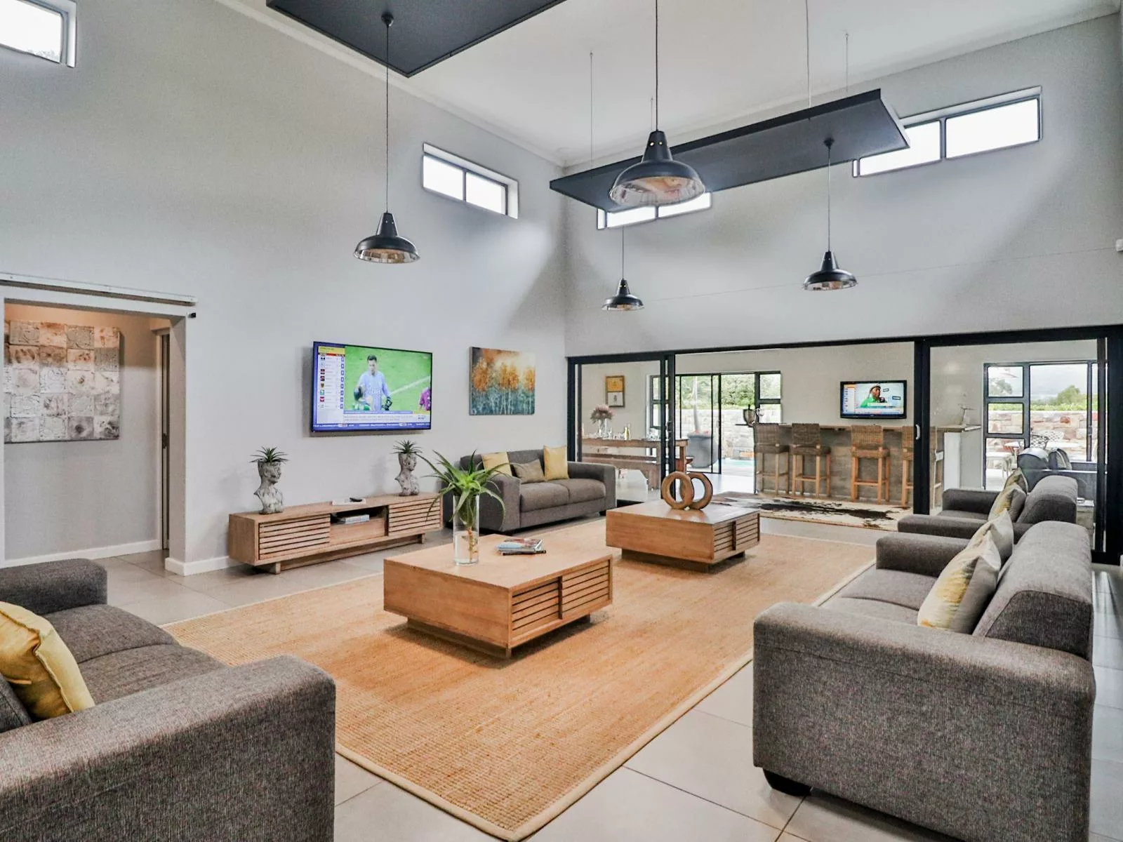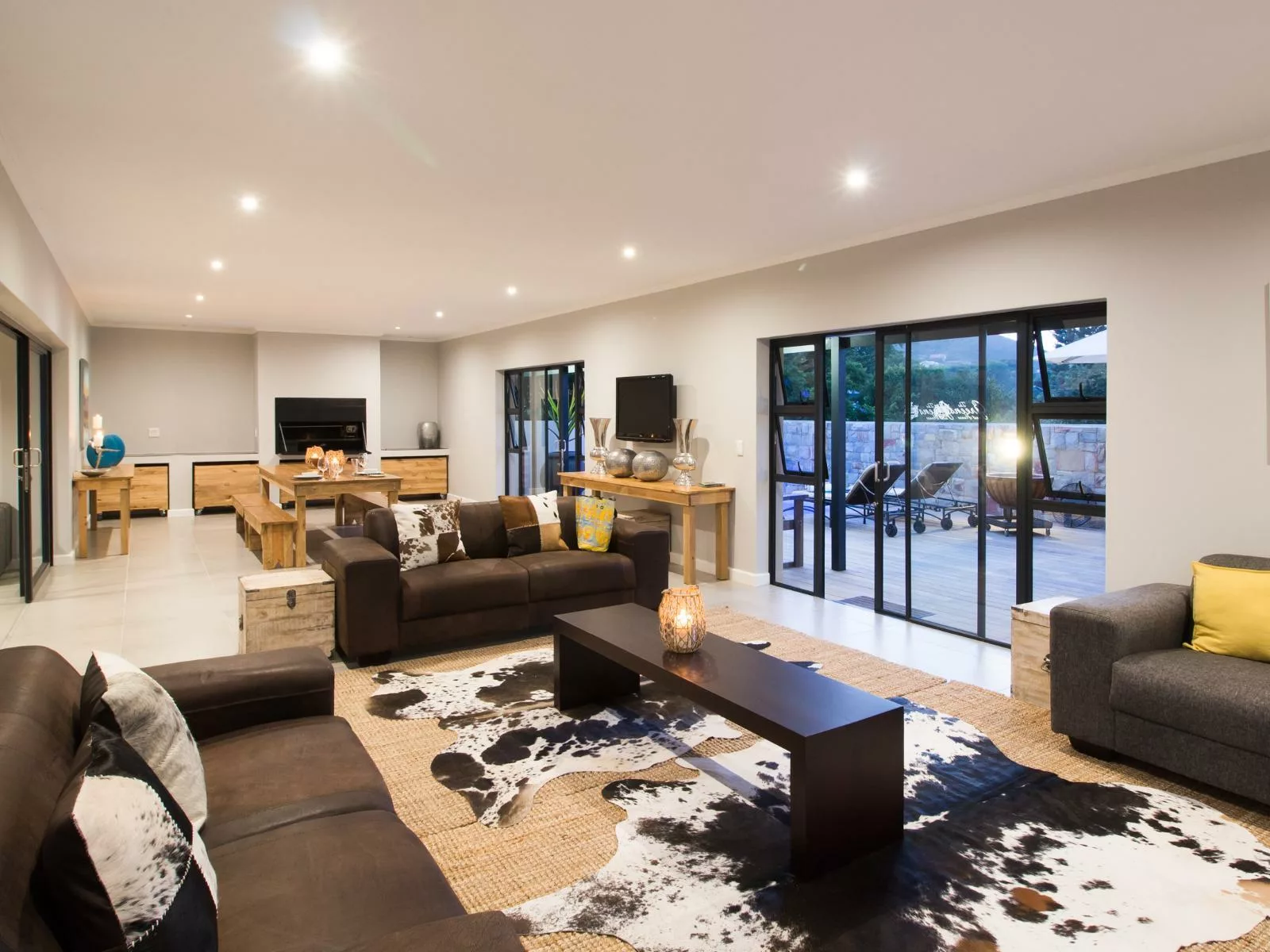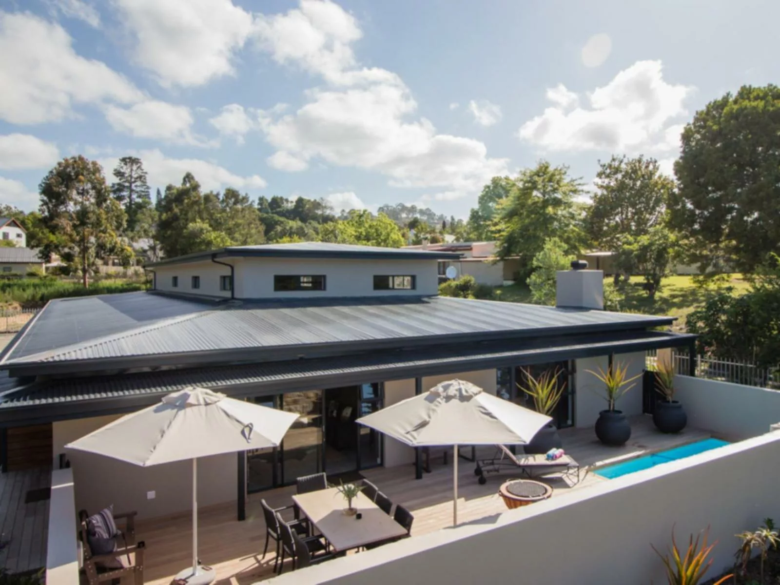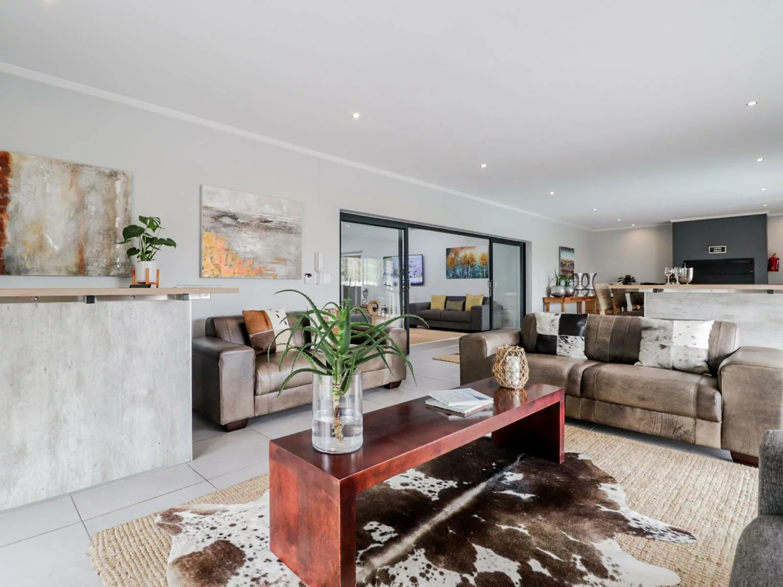 An elegant single storey architectural jewel, housing a large open plan living area, eight exquisite en-suite bedrooms, and secure outside pool deck with spectacular views of the Knysna Heads and Knysna Golf Course.