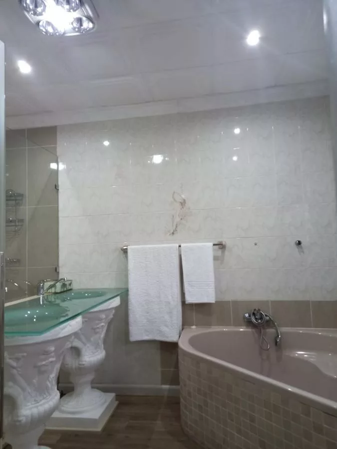 Luxurious room with a King bed and en-suite bathroom with a deep soaking bathtub and separate shower. Other amenities include air-conditioning, coffee/tea making facilities, TV with DStv, and Wi-Fi.