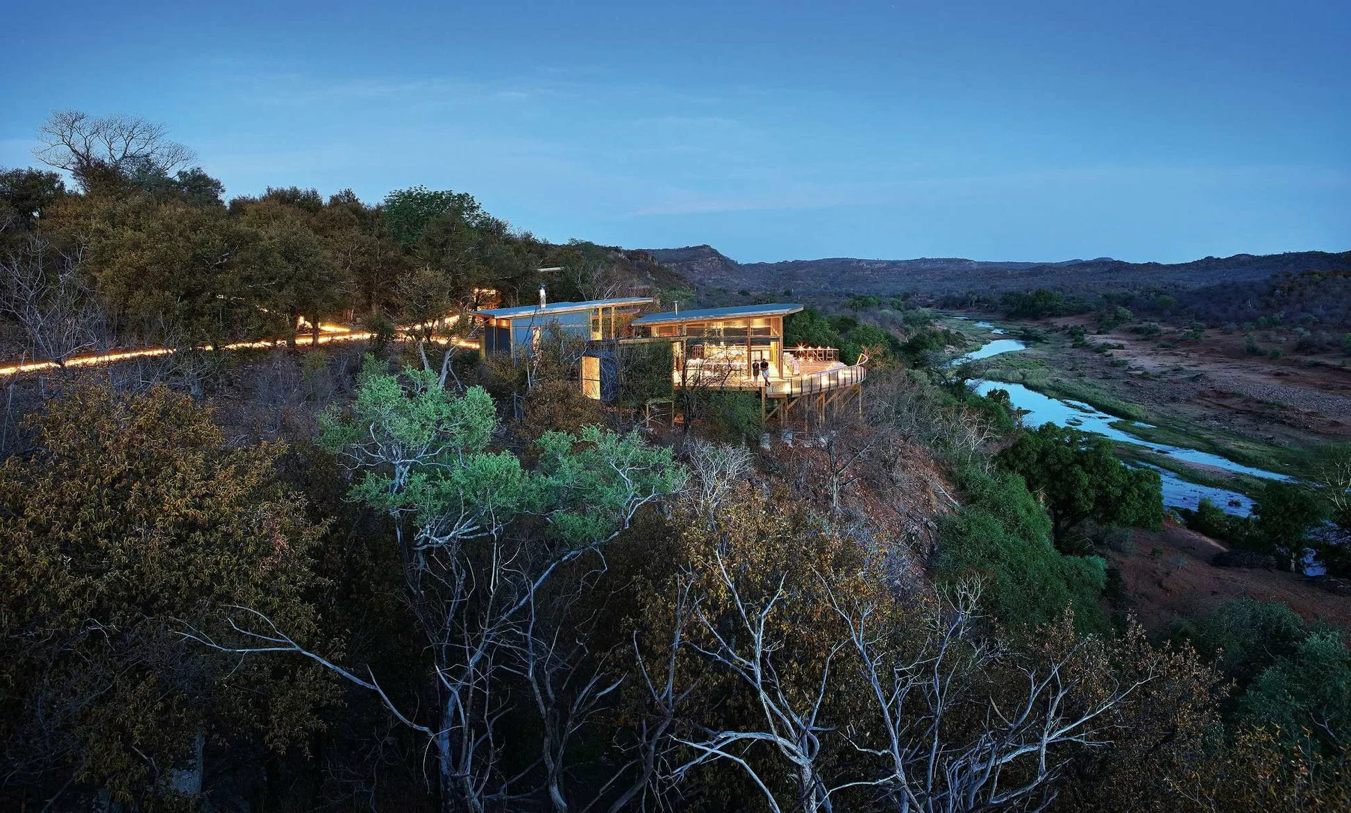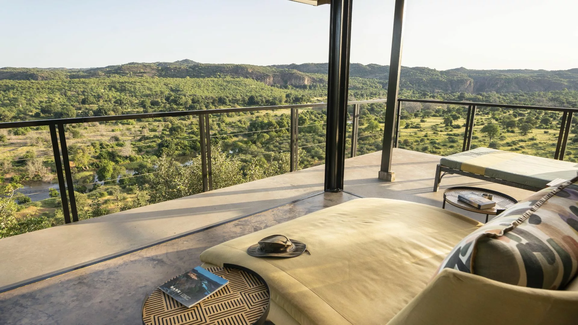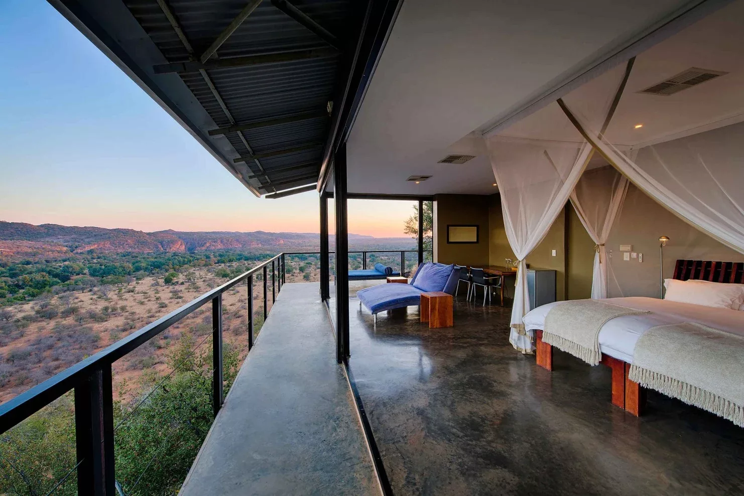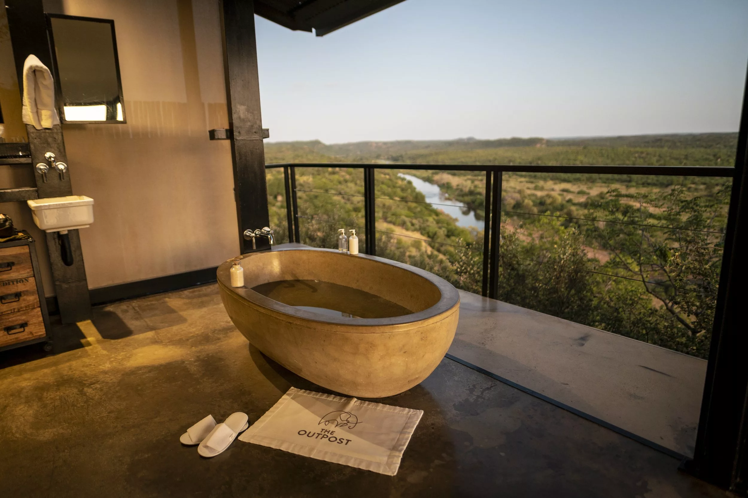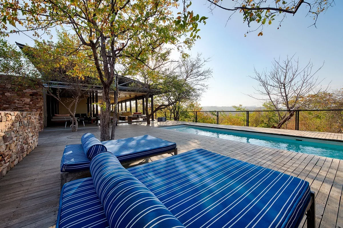 The Outpost accommodates 24 guests in 12 stand-alone luxury en-suite spaces. Choose from 3 Luxury Bush Suites, 8 Luxury River View Suites, and 1 Honeymoon Suite. Perched on a hill overlooking the Luvuvhu River, these private, free-standing spaces are interconnected by 500 meters of Zimbabwean teak walkways. Adorned with contemporary architecture, the rooms feature concrete and steel elements, showcasing state-of-the-art retractable, remote-controlled screens that provide uninterrupted 180º views of the surrounding landscape.