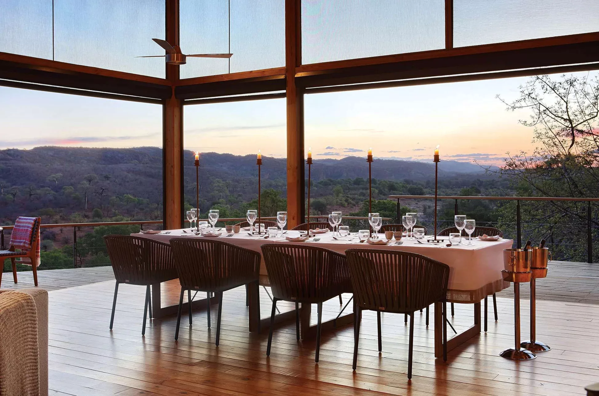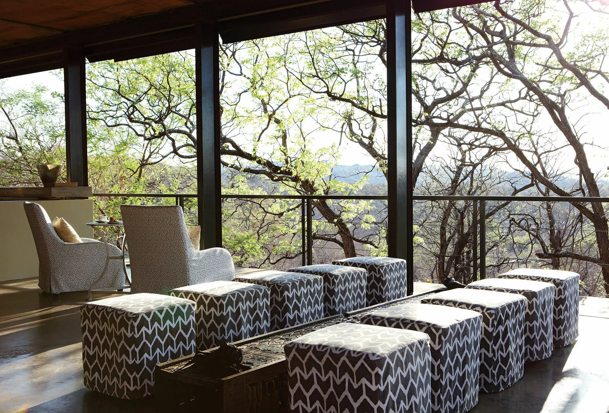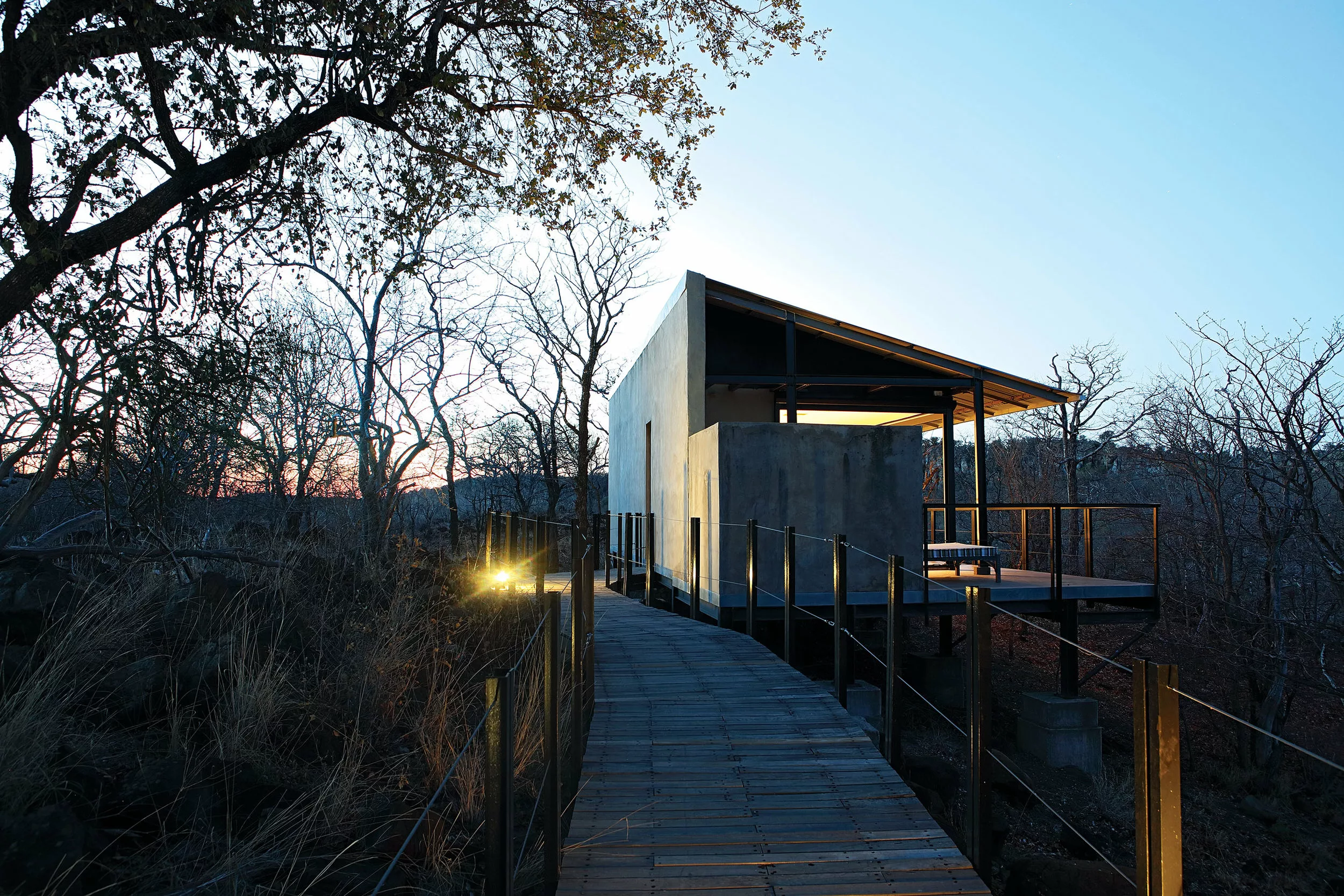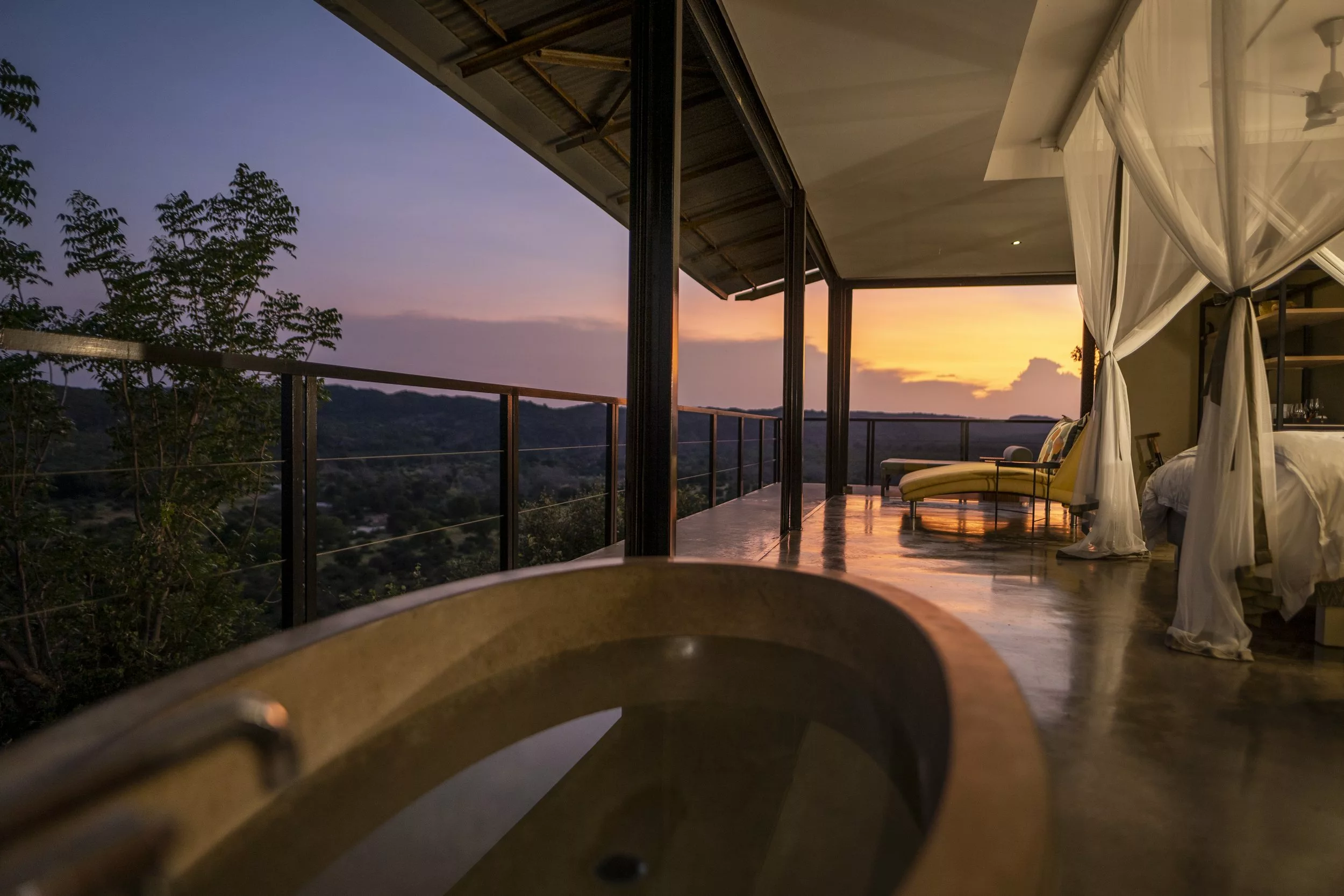 The Outpost accommodates 24 guests in 12 stand-alone luxury en-suite spaces. Choose from 3 Luxury Bush Suites, 8 Luxury River View Suites, and 1 Honeymoon Suite. Perched on a hill overlooking the Luvuvhu River, these private, free-standing spaces are interconnected by 500 meters of Zimbabwean teak walkways. Adorned with contemporary architecture, the rooms feature concrete and steel elements, showcasing state-of-the-art retractable, remote-controlled screens that provide uninterrupted 180º views of the surrounding landscape.