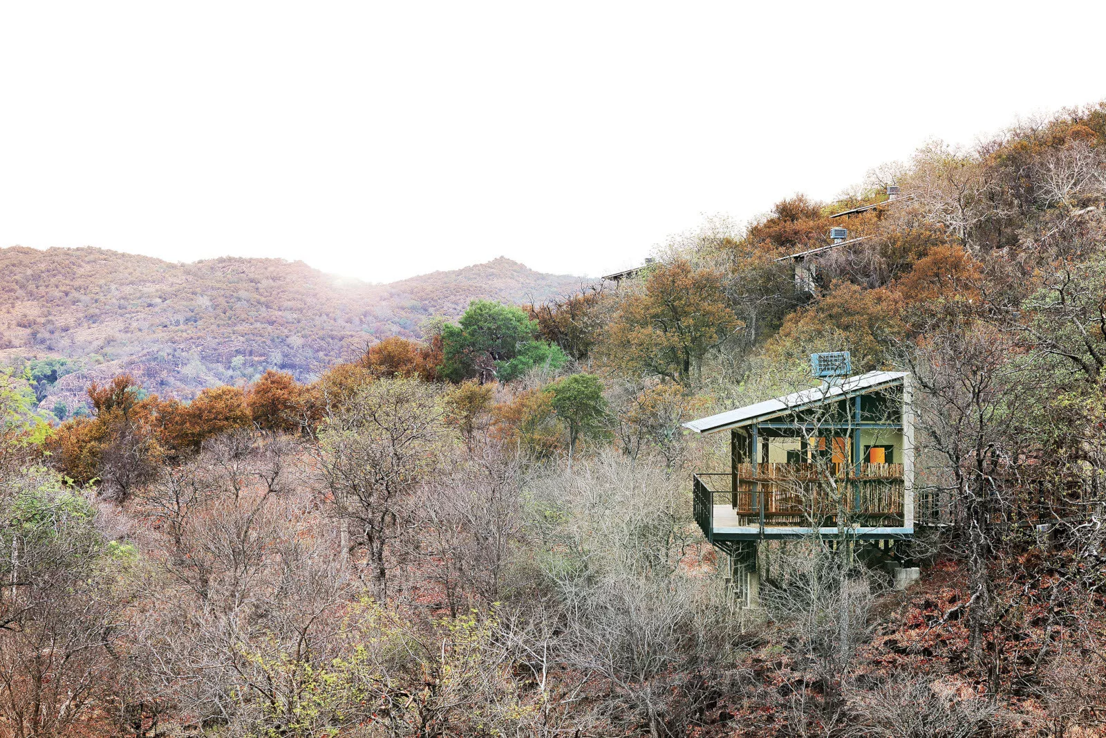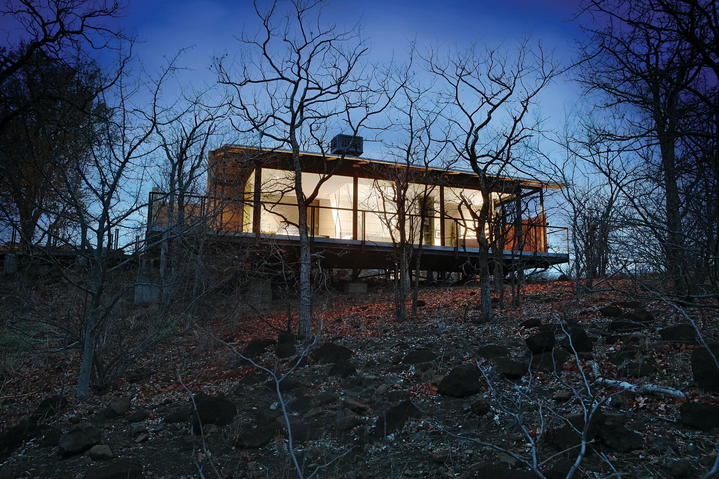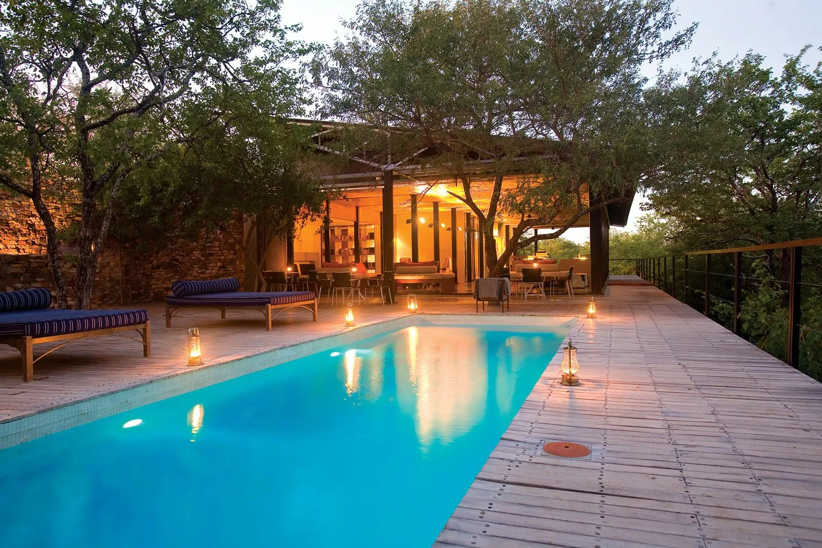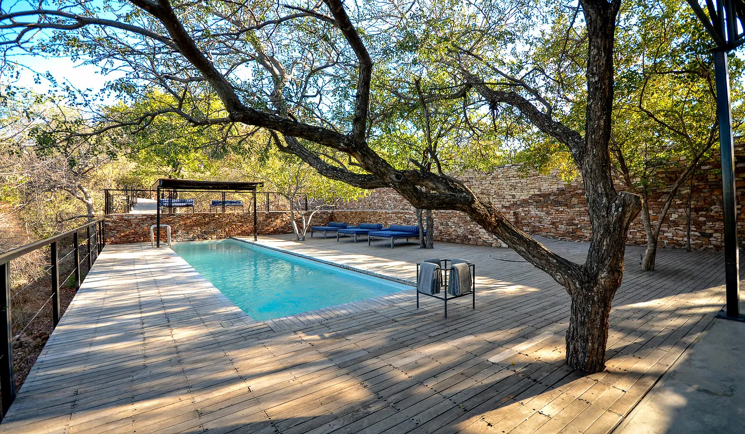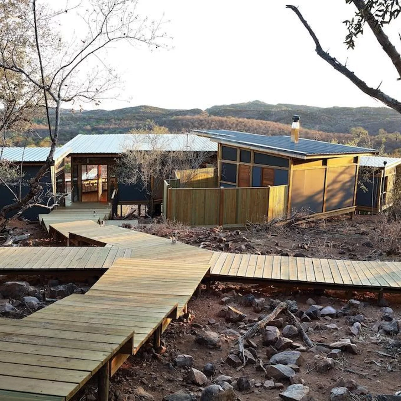 The Outpost accommodates 24 guests in 12 stand-alone luxury en-suite spaces. Choose from 3 Luxury Bush Suites, 8 Luxury River View Suites, and 1 Honeymoon Suite. Perched on a hill overlooking the Luvuvhu River, these private, free-standing spaces are interconnected by 500 meters of Zimbabwean teak walkways. Adorned with contemporary architecture, the rooms feature concrete and steel elements, showcasing state-of-the-art retractable, remote-controlled screens that provide uninterrupted 180º views of the surrounding landscape.