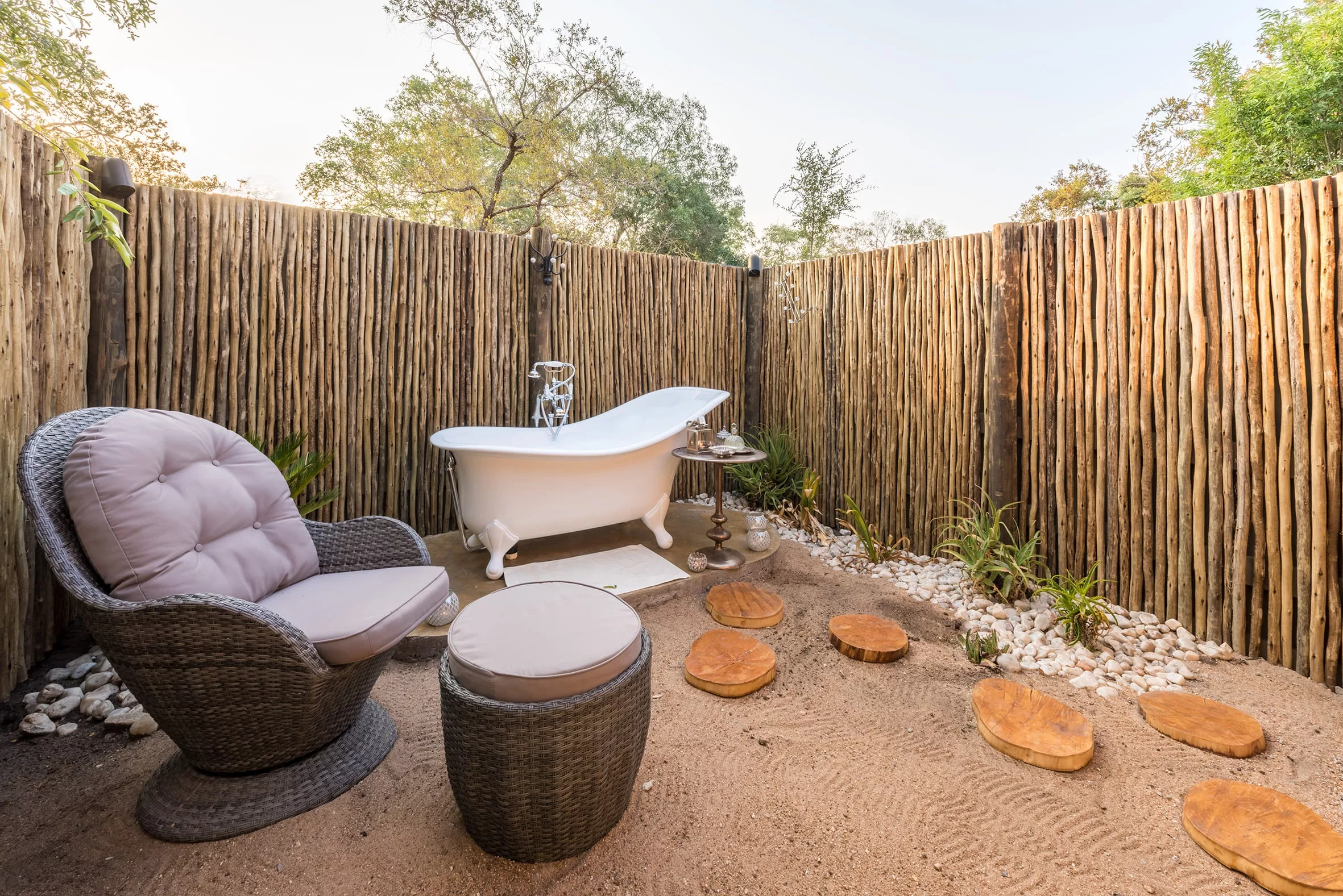 Guests can enjoy the exclusive use of a family-sized swimming pool, perfect for a refreshing dip after a day of safari adventures. The fenced garden provides a safe space for children to play, while the outdoor bathtub offers a unique and authentically African experience under the stars.