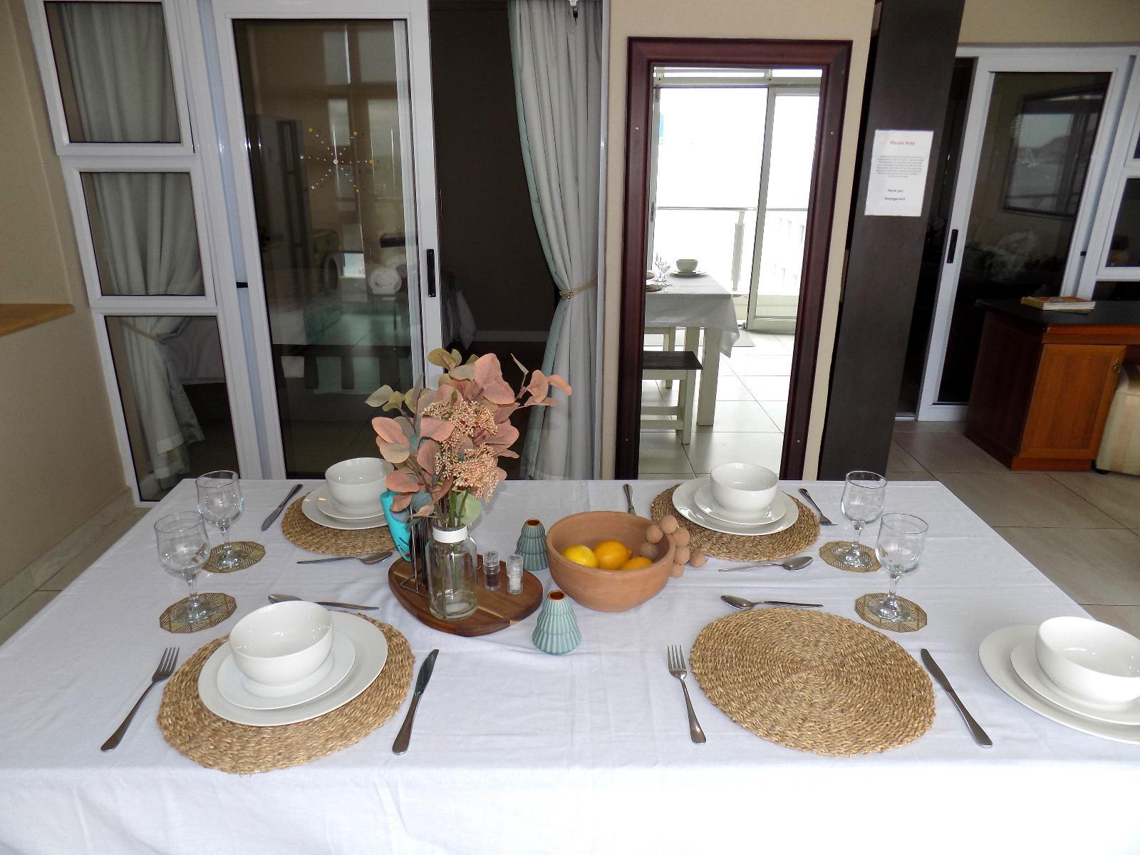 This is a 2 bedroom, 2 bathroom (1 en-suite) self catering apartment with a fully equipped kitchen (Standard fridge, washing machine, dishwasher), lounge – with a 32 inch LED TV kitted with a full DSTV package and Android Smart Box; a balcony that looks right onto the sea with a gas braai. The Balcony is enclosed with glass shutter doors that allows for you to entertain throughout all the weather conditions. There is also 1 undercover parking garage for your car. This will surely feel like your home away from your home!