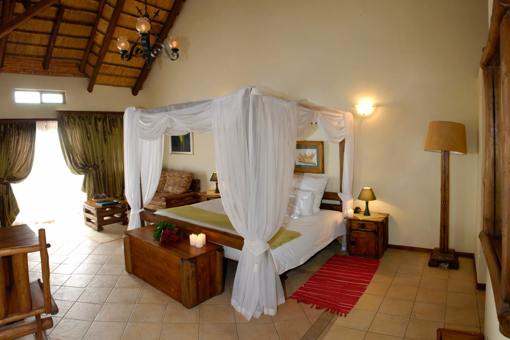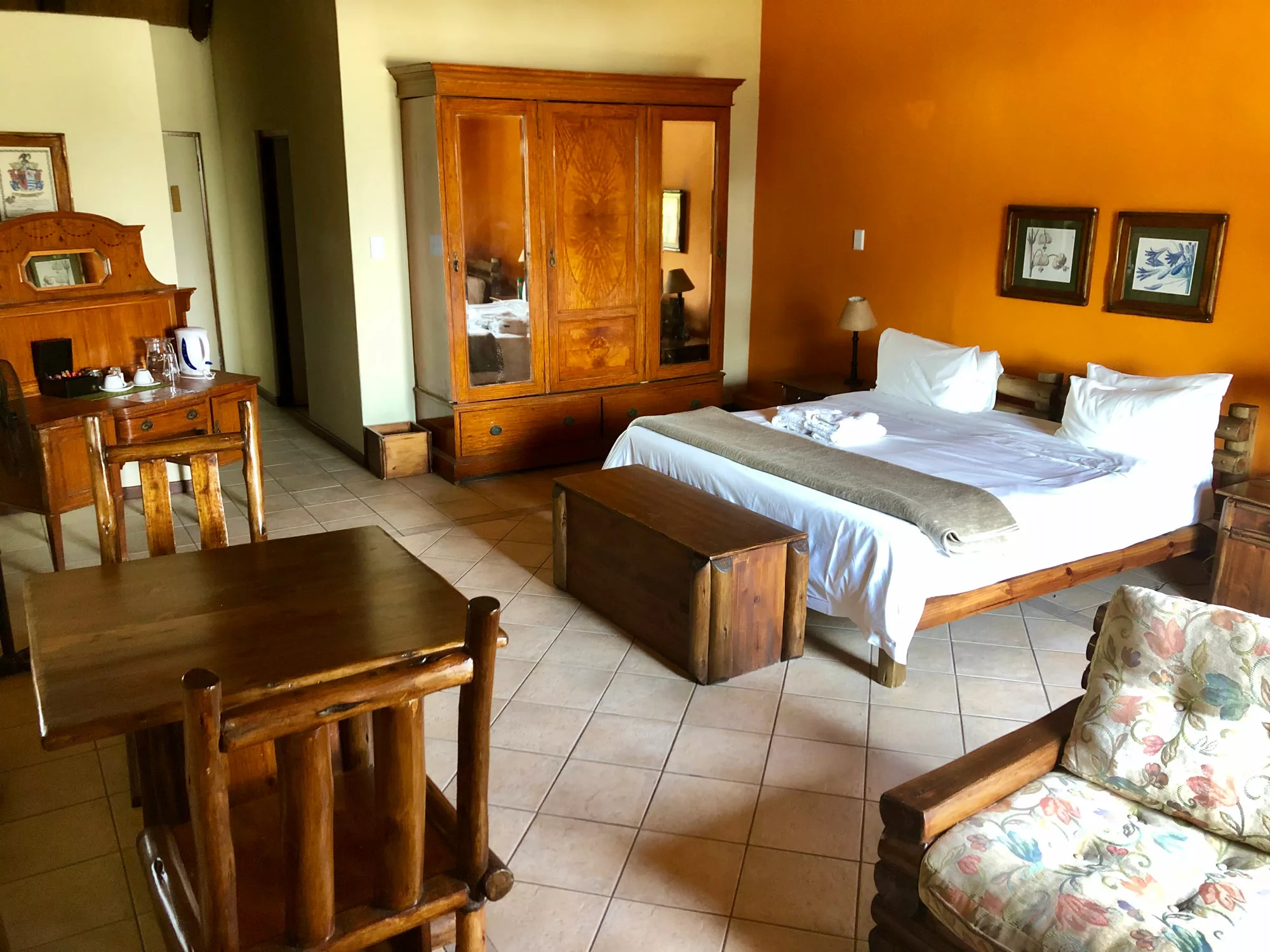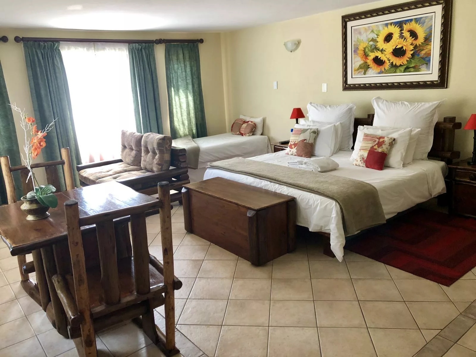 Double size bed, country-style furniture, en-suite bathroom with shower. Choice of one double bed or 2 separate single beds. Perfect for a romantic country resort getaway.