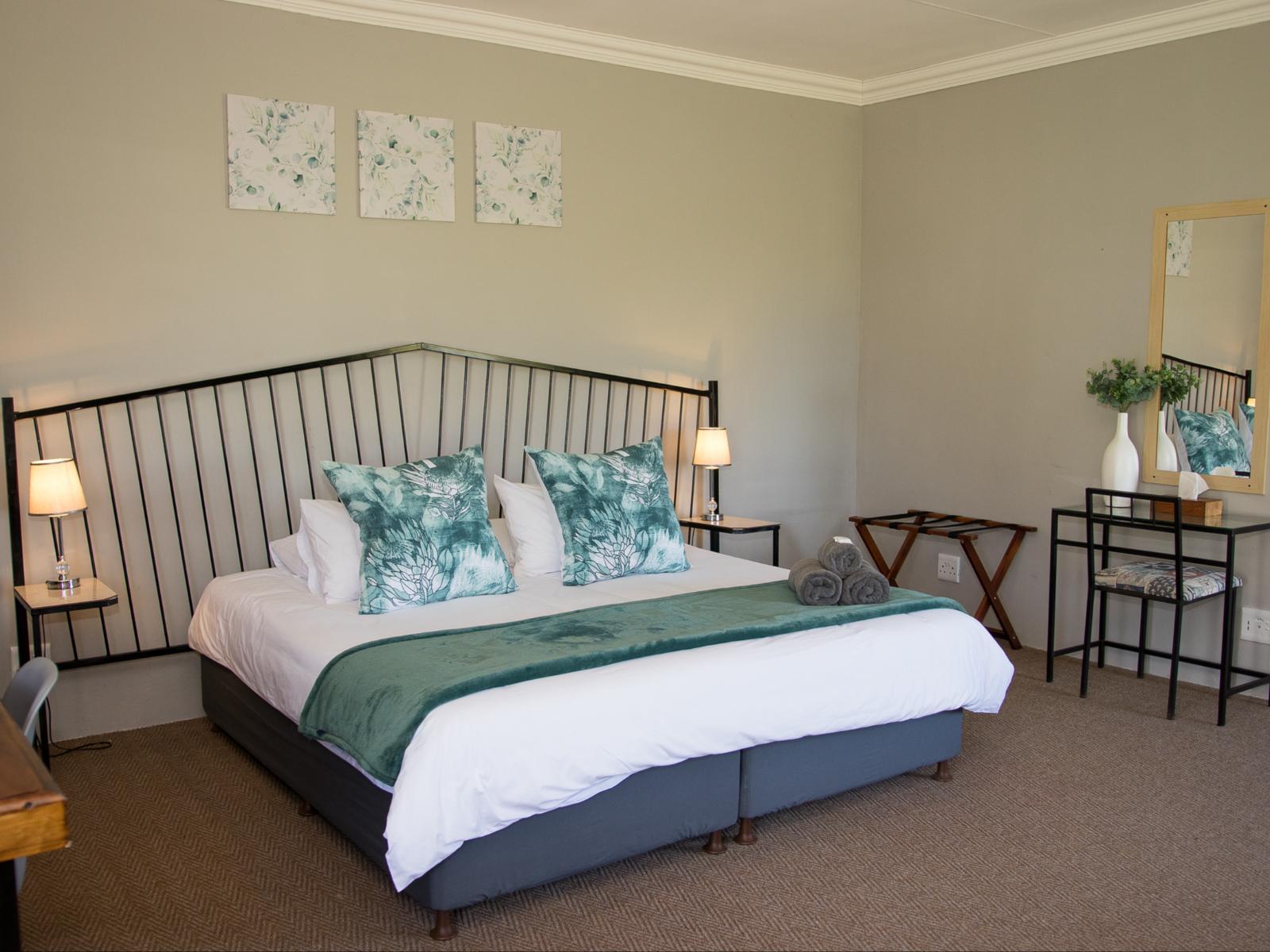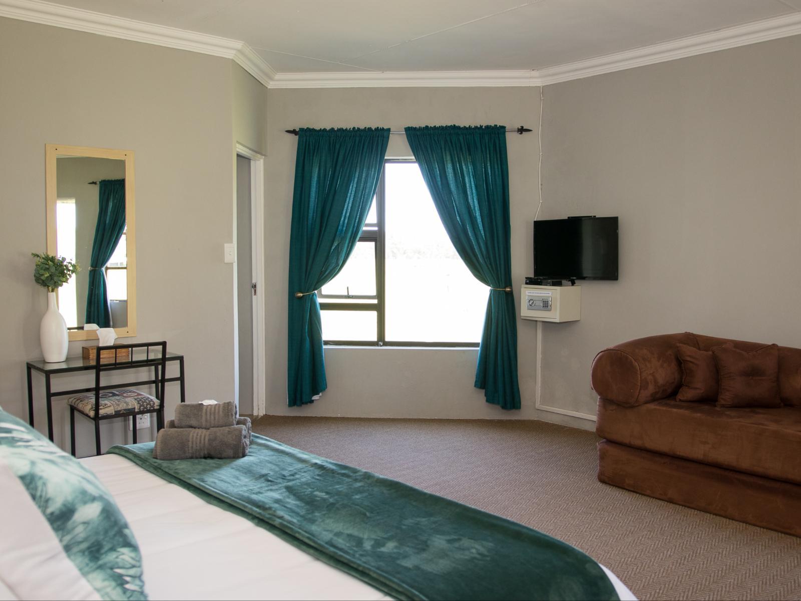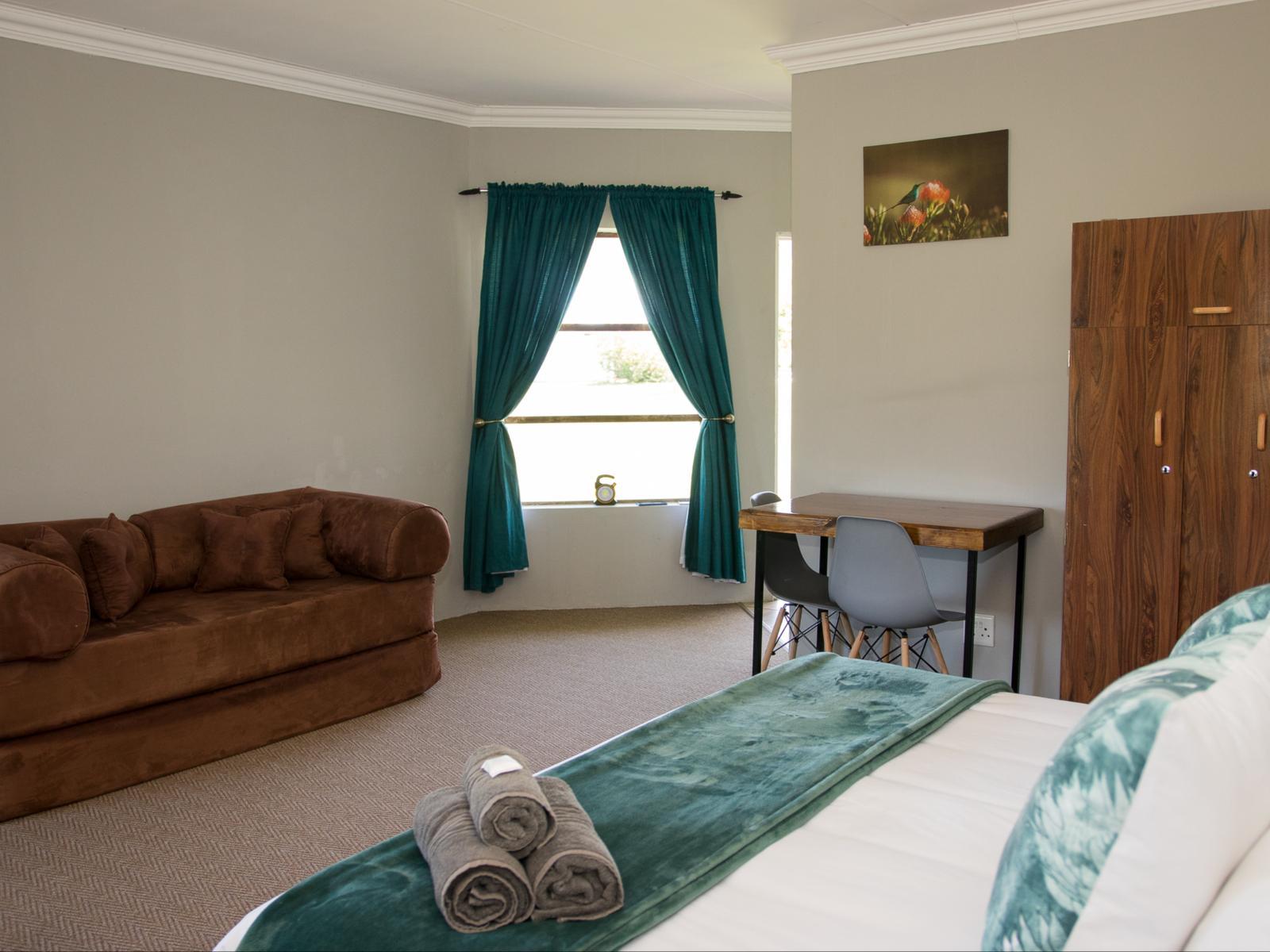 Each of the four private rooms has an open plan living/bedroom area with a king size beds (twin on request) and a sleeper couch that becomes 2 single beds. En-suite bathroom with shower & fully equipped for self catering. Own braai facilities.